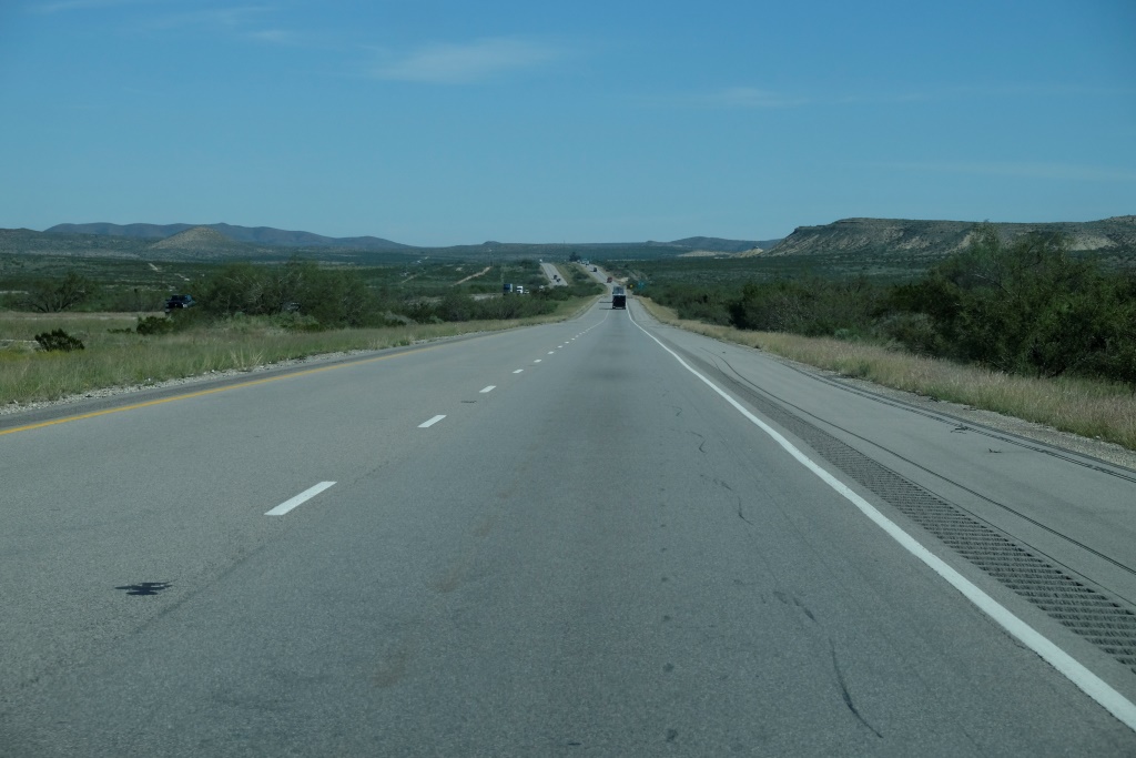 Bijām iecerējuši šodien mazliet pakāpelēt pa apkaimes pastaigu takām, bet, teiksim tā, tehnisku iemeslu dēļ šie plāni bija jāatliek, diētas maiņa ne vienmēr izrādās laba doma. Tad nu sēžamies karietē un atgriežamies ceļa skavās. Rafaēls stūrē, es cenšos tikt galā ar iekrātajiem ierakstiem. Citreiz negribas braucot rakstīt, lai nepalaistu garām kaut ko ievērības cienīgu aiz loga, bet šis nav tas gadījums. Teksasas rietumu daļa ir diezgan plakana un garlaicīga, cik ilgi skatīsies uz tuksnesi ar pāris nīkiem krūmeļiem. Esam vienisprātis, ja jāizvēlas vienveidīga ainava, abi balsojam par mežu.