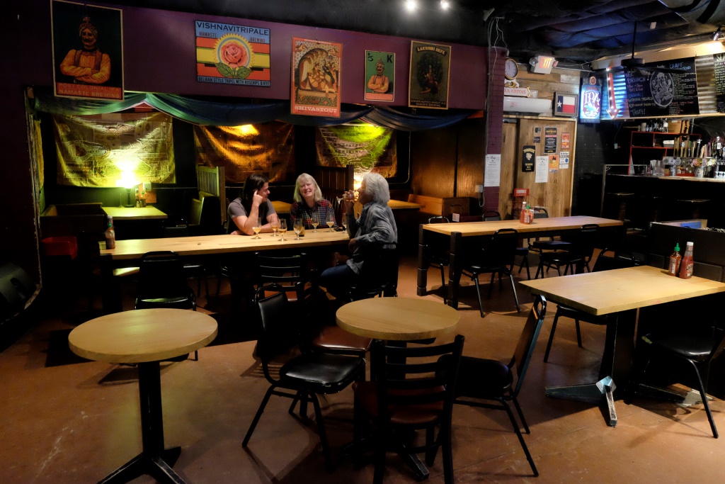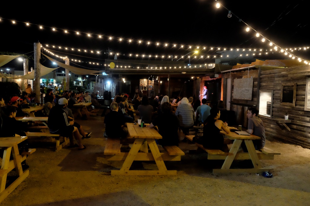 Iesākumā viņi mūs aizved uz vietu, kur spēlē dzīvā mūzika, kas vienlaikus tiek retranslēta vienā no Teksasas radiostacijām. Vakars ir silts, apkārt čalo ļaudis, saostās suņi, virs galvas vijas lampiņu virtenes – tāds Kalnciema ielas noskaņojams. Uzsaucam sev un pārim gardas tako vakariņas, tad pārceļamies uz citu vietu, kur notiek stand-up comedy. Atkal jau mana angļu valoda neļauj noķert visus jokus, bet tāpat ir gana jautri. Manā galvā Teksasa bija iesēdusies kā diezgan konservatīva vieta, bet pagaidām nekas par to neliecina – komiķiem nav nevienas svētas tēmas, cilvēki ir atvērti un atsaucīgi. Nemaz nerunājot par mūsu saimniekiem, kas ir super progresīvi domājoši. Pēc komēdijas mums jau acis lēnām veras ciet, bet Šerila un Džims vēl grib parādīt mājām tuvāko pasēdētavu, kas no veikala lēnām pārtapusi krogā. Tomēr arī veikals šeit joprojām eksistē. Rafaēls ir pilnīgā šokā par vīna un alus sortimentu. Viņš šeit atrod tādus beļģu retumus, kurus sakās citur ar uguni meklējis. Man tie nosaukumi neko neizsaka, bet speciālisti var bildēs aplūkot etiķetes, tas esot kaut kas varen smalks.