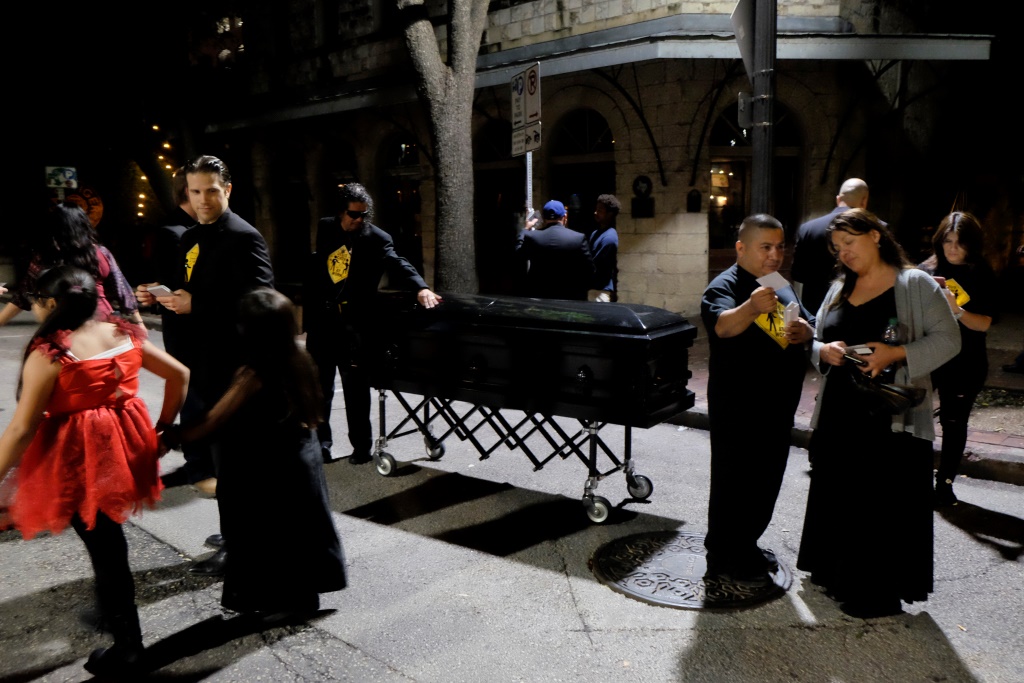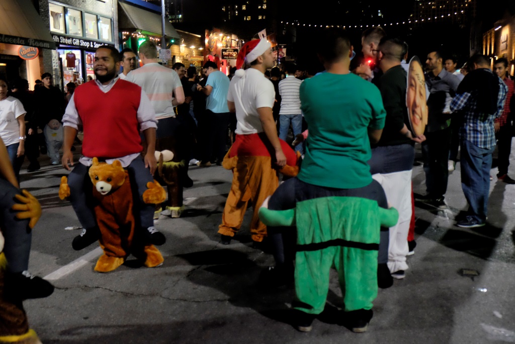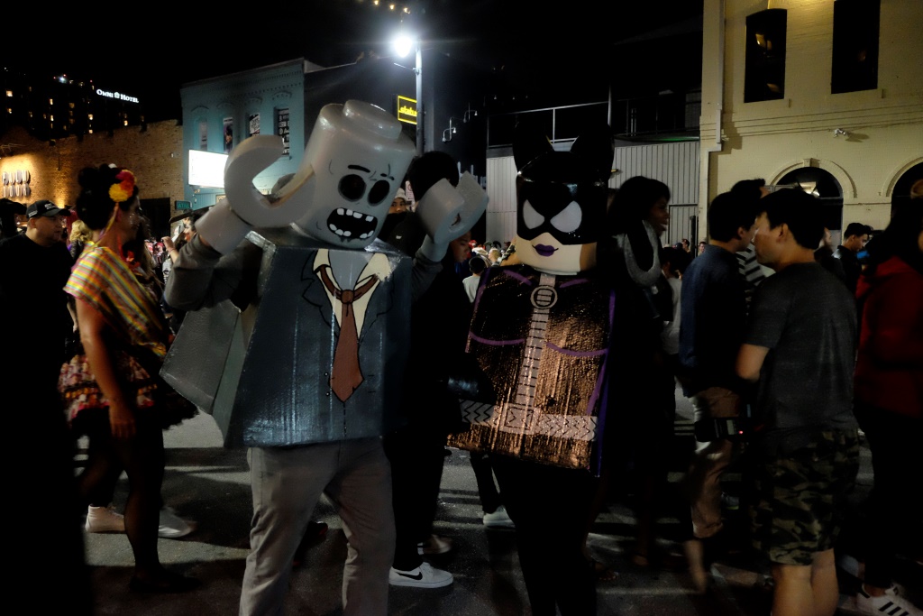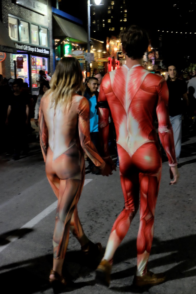 Arī mēs mazliet “uzpucējamies” un braucam uz pilsētu. Novietojuši auto dažus kvartālus no centra, dodamies uz 6-to ielu, kur ir svinību epicentrs. Galvenā atrakcija, protams, ir citu ļautiņu aplūkošana. Visi staigā tādā kā lielā aplī (aptuveni kā mēs 49. vidusskolas gaiteņos starpbrīžu laikā (nez, tā joprojām notiek?)) un vēro cits citu. Visās malās dārd mūzika, var iegriezties kādā no krogiem vai klubiem. Mums šāda iespēja iet secen, jo Rafaēls aizmirsis paņemt līdzi personu apliecinošus dokumentus, šoreiz bilde telefonā nedarbojas. Rafaēls vēl brīdi papukojas, vai tiešām viņš izskatoties pēc 21-gadīga īpatņa, bet tad atmet ar roku. Tad nu vienkārši staigājam apkārt. Jāteic, ka fantāzijas lidojumam šeit nav robežu. Līdztekus klasiskiem tēliem – vampīriem, zombijiem un citiem mošķiem, te staigā pasaku un filmu varoņi, Bārbija ar visu iepakojumu, Lego, asinīm notašķīti ķirurgi, iphone, cietumnieki, banāni, policisti, zvēri un kukaiņi. Krāšņākie tērpi izpelnās nepārtrauktus lūgumus fotografēties. Ir arī cilvēki bez maskām, bet viņi ir mazumā.