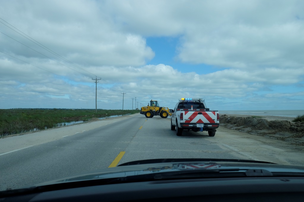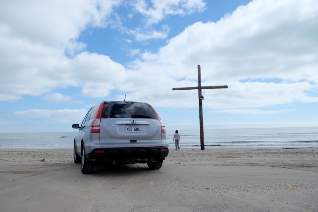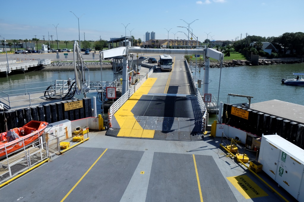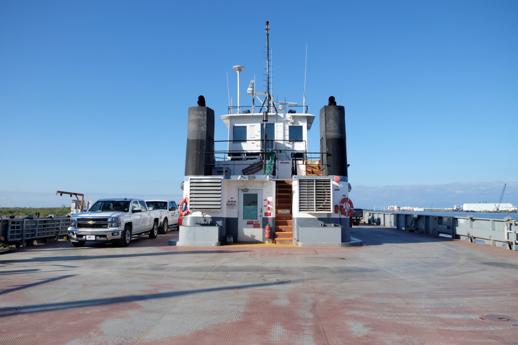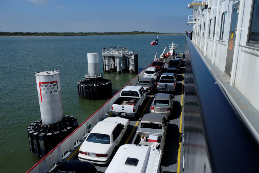 Tad mūsu ceļš ved prāmja virzienā, kas pusstundas laikā par brīvu aizvizina mūs un auto pāri ūdens klajam, lai nav jāmet pamatīgs līkums, lai atkal nonāktu līča krastos – gribam turpināt ceļu gar ūdens malu. Izskatās, ka pāris dienām tas nebūtu bijis iespējams – plūdi ir tikko atkāpušies. Pa ceļu vazājas buldozeri un ekskavatori, atbrīvojot brauktuvi no smiltīm un drazām. Arī šeit visas mājas ir uz garām kājām, izskatās, ka ūdens līmeņa celšanās ir visai ierasta padarīšana.