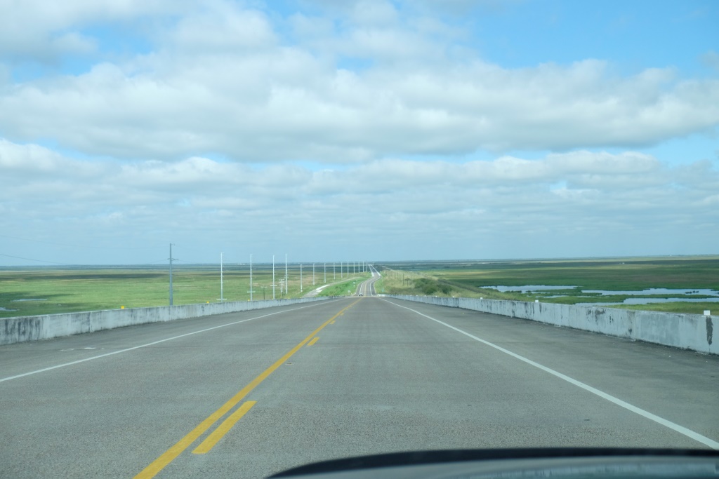 Iebraucam Port Arthur paēst pusdienas, šī nu izskatās pēc Teksasas naftas galvaspilsētas – trubu, bunduļu un skursteņu džungļi ir teju neaprakstāmi. Drīz pēc tam šķērsojam Luiziānas štata robežu. Pēc tās industriālo ainavu pamazām nomaina purvi. Bet nevis tādi mīlīgi kā pie mums, bet tādi, pa kuriem Horācijs no CSI Maiami brauc ar ātro laivu. Vietām ir sausāks un attiecīgi apdzīvotāks, vietām desmitiem kilometru nav nekādas dzīvības pazīmes. Atvainojos, cilvēku pazīmes. Te ir jaunas ceļa zīmes – uzmanību, aligatori! Un, līdz pat pašam vakaram, visa ceļa garumā nav pilnīgi neviena kempinga, neviena moteļa. Tumsa šovakar atnāk gandrīz par stundu agrāk un mēs joprojām mīcamies gar purviem.