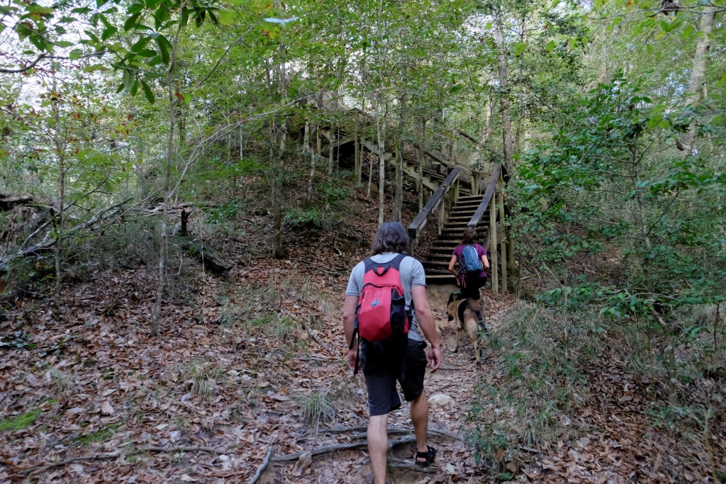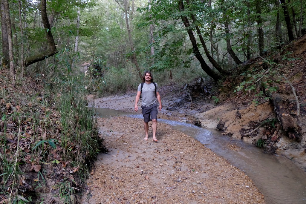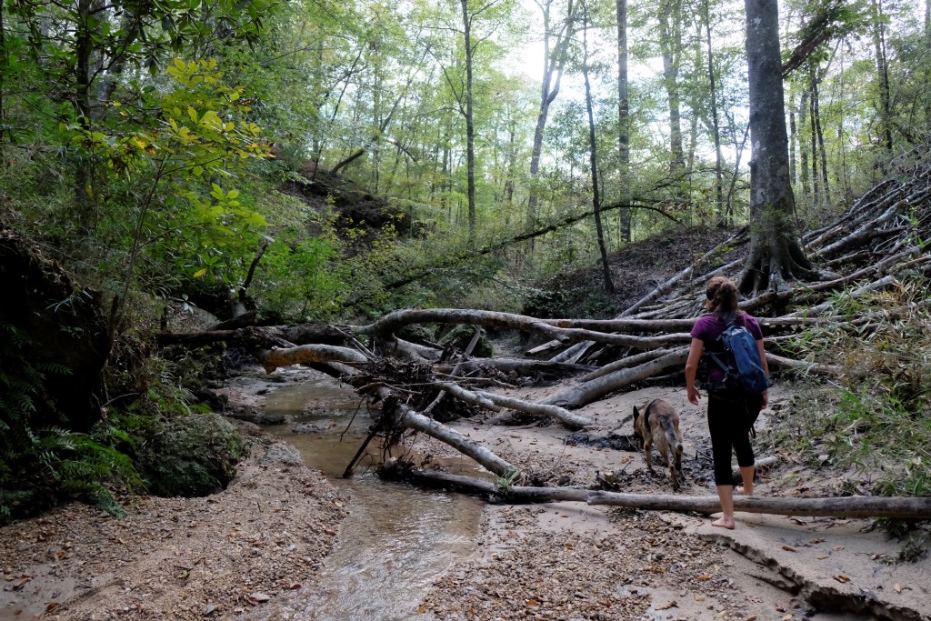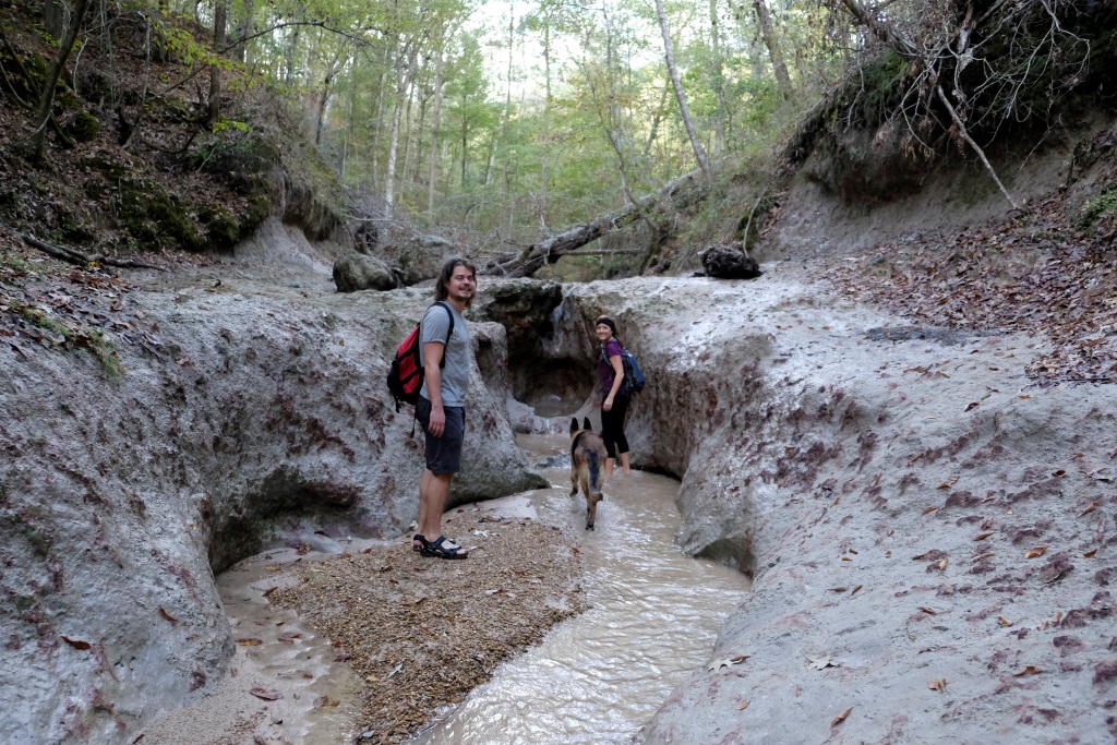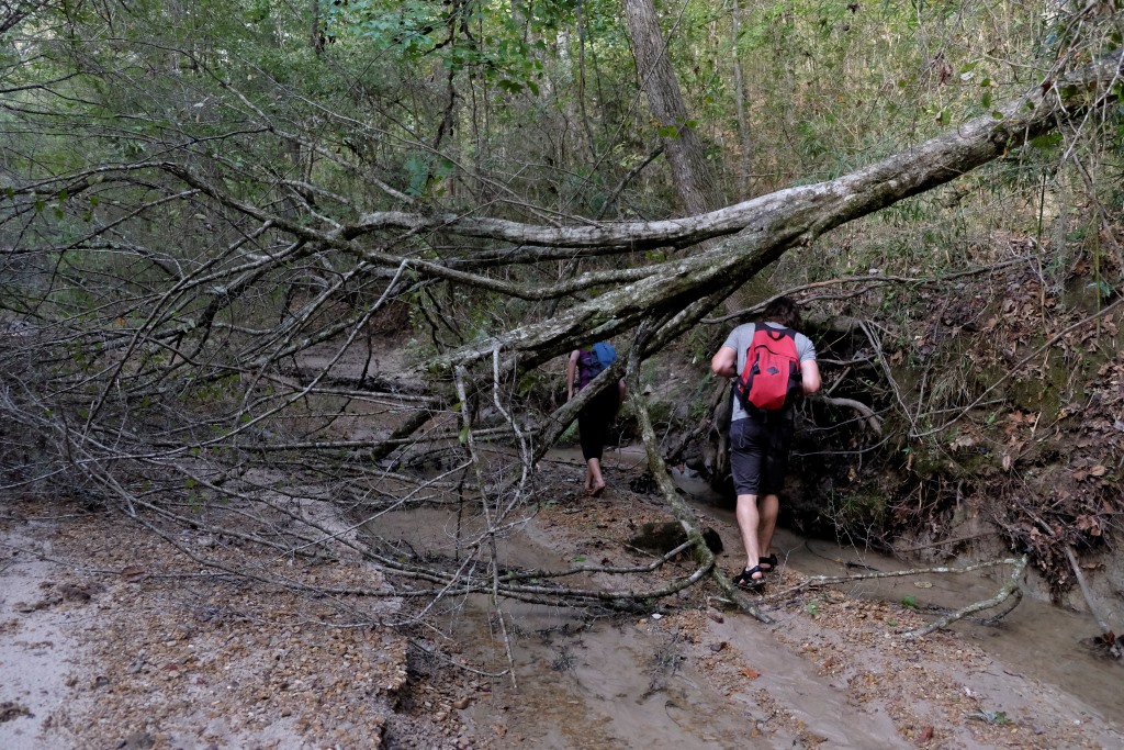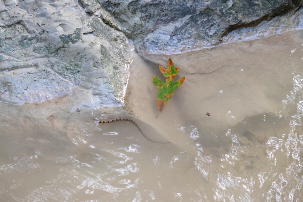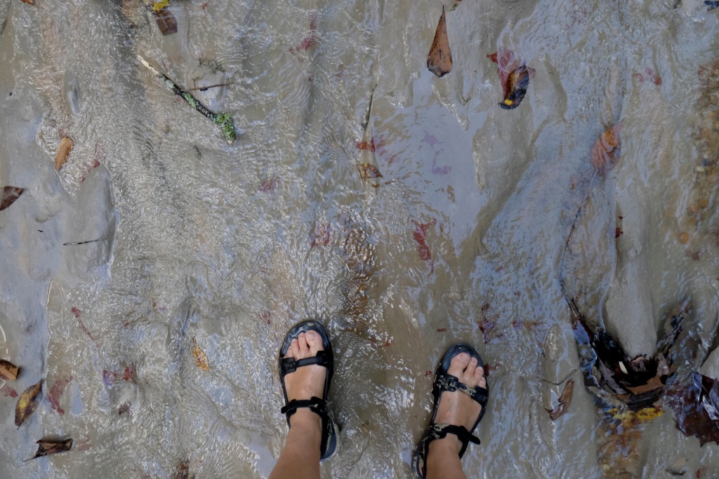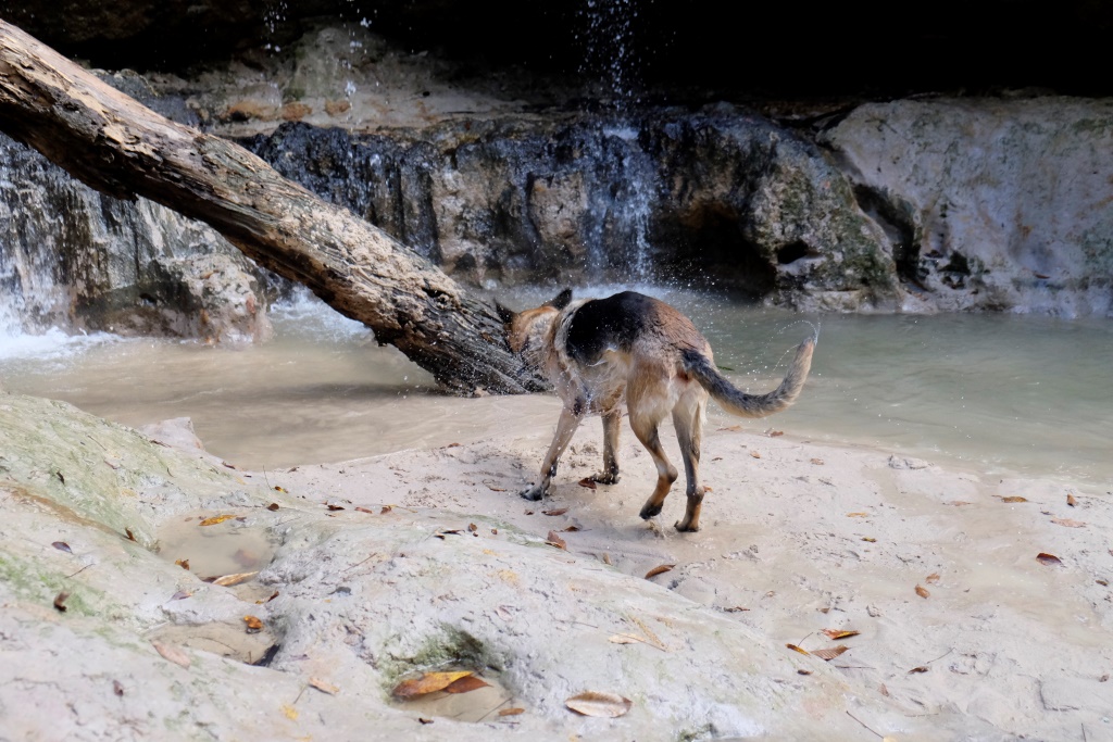Mēs turpinām ceļu un drīz vien esam klāt pārgājiena maršruta sākumā. Mazu gabaliņu paejamies pa ceļu, tad kāpjam iekšā upē un turpinām gājienu pa tās gultni. Lielākoties iznāk iet pa sausumu, bet vietām drusku jāpabrien. Nova izklaidējas, dzenādams pa krastiem vāveres un citus zvēruļus, tad atgriežas pie mums ar mēli pār pleciem. Arī mums pēc divu stundu līkņāšanas zem koku stumbriem un kāpelēšanas pa akmeņiem sagurums ir klāt.