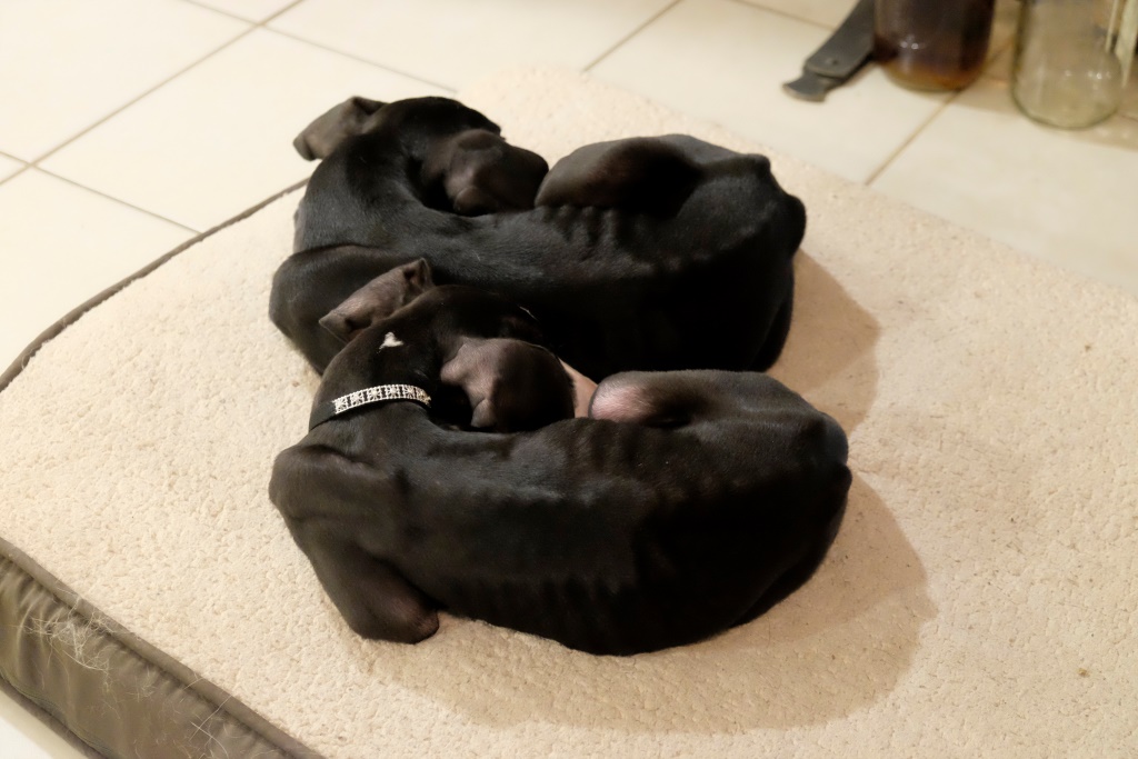 Tā kā es šodien esmu nolēmusi strādāt (jā, jā, nevaru nociesties līdz atpakaļ tikšanai, kaut kas traks), abi kucēni ierāpjas Rafaēlam klēpī, kurš ir filmu varā. Mila, kā jau meitene, visu laiku pļāpā, bet brālis, kuram vēl nav vārds, krāc un, atvainojos, pirž – nu īsts vecis. Atpūtas brīžos es ar fotoaparātu skrienu pakaļ Milai, lai noķertu kādu kadru, ko Konstance varētu ievietot adopcijas mājas lapā – to ūdenszāli nav viegli nobildēt, bet kaut kas beigās izdodas.