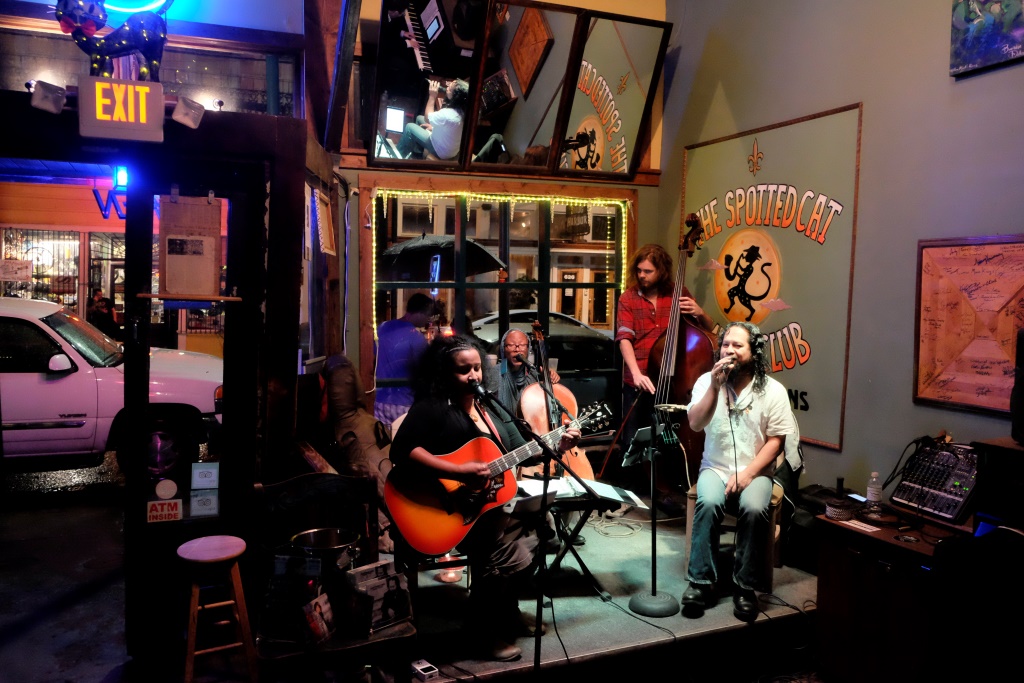 Kolorīta ir arī Royal street, uz tās visi mākslinieki drīkst uzstāties bez licences un tur var redzēt faķīrus, muzikantus, klaunus un ko tik vēl nē. Mūs gan savā varā pārņem Frenchman iela – katrā krogā uzstājas grupa, pilnīgi grūti izvēlēties, kurp doties. Saku Rafaēlam, ka šovakar jāpiekopoj stratēģija – ne vairāk kā viens alus katrā krogā – lai neiesēžamies un varam redzēt pēc iespējas dažādākas vietas. Dažās vietās mūziķi dzied vietējā franču “cajun” dialektā, Rafaēlam drusku jāpiepūlas, bet saprast varot.