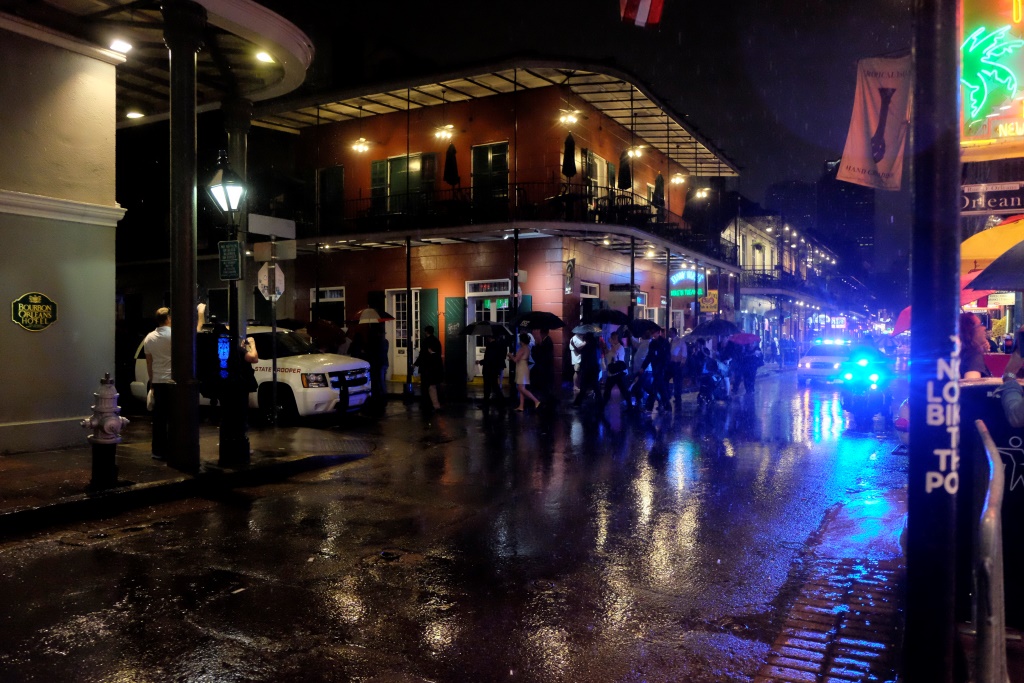Šodien ir sestdienas vakars un visa pilsēta ir viena liela ballīte. Centrālā tūristu iela ir Burbon street, uz tās visi krogi cenšas pārbļaut kaimiņos esošo, iela pilna ar piedāvājumu izkliedējiem, ielu māksliniekiem un, protams, pašiem tūristiem. Tie klīst ar alus vai kokteiļa vāzi rokās, šeit drīkst uz ielas atrasties ar alkoholu.