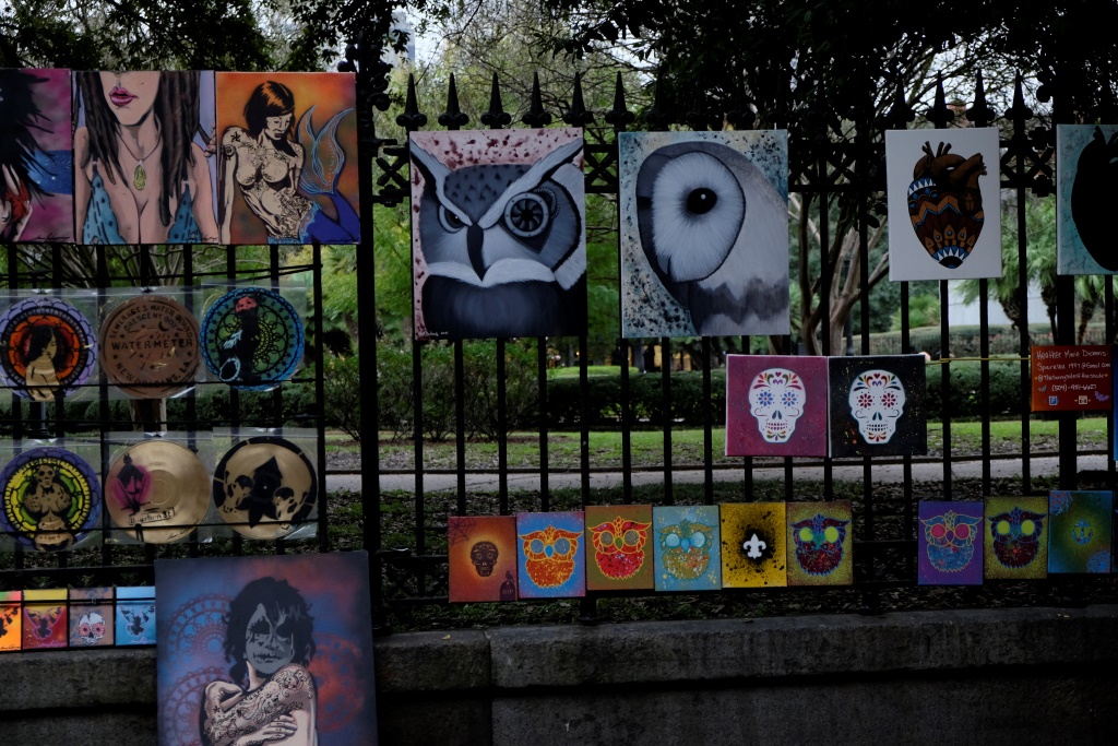 Pēc tam kājas pašas aiznes līdz French market, kur var tikt gan pie lētiem suvenīriem, gan vietējās mākslas, kas ir gana gaumīga. Rafaēls pēc ilgas pauzes ļaujas savai cepuru vājībai un tiek pie jaunas galvasrotas. Es, savukārt, nevaru paiet garām šim biedram. Vakar nespēju Rafaēlam atbildēt, kas ir mana iepirkšanās vājība, domāju, ka faktiski man tādu nav. Bet šodien tomēr pierādījās, ka ir gan – pingvīni un auskari (no otrajiem izdevās atturēties).