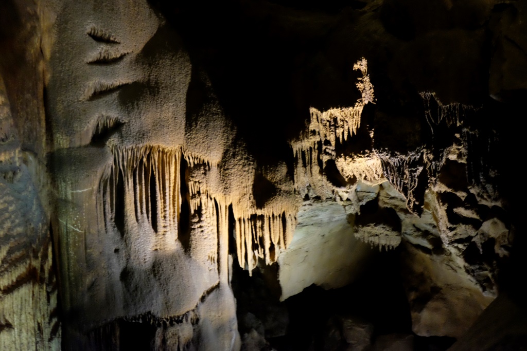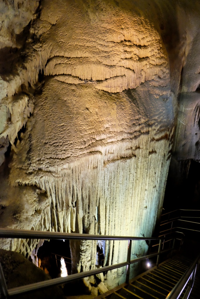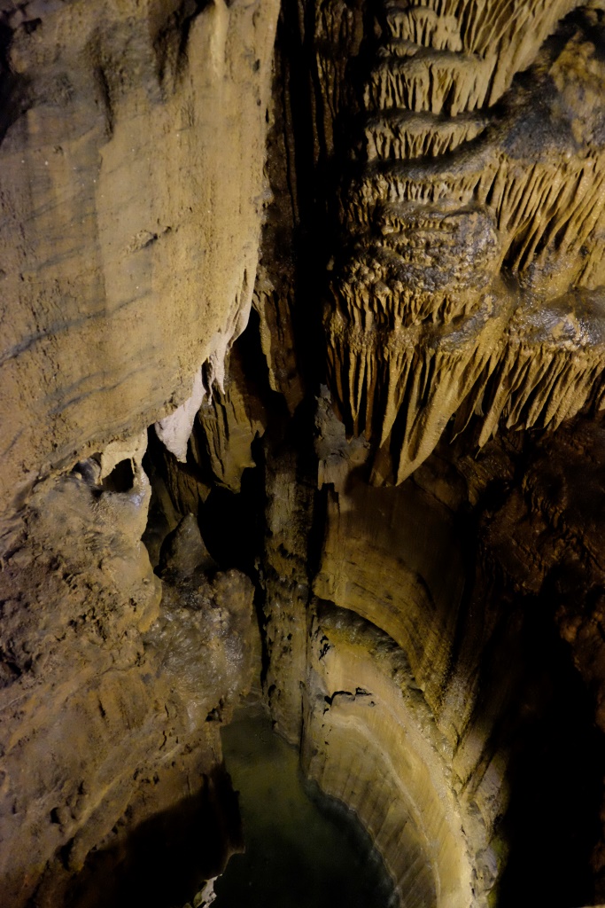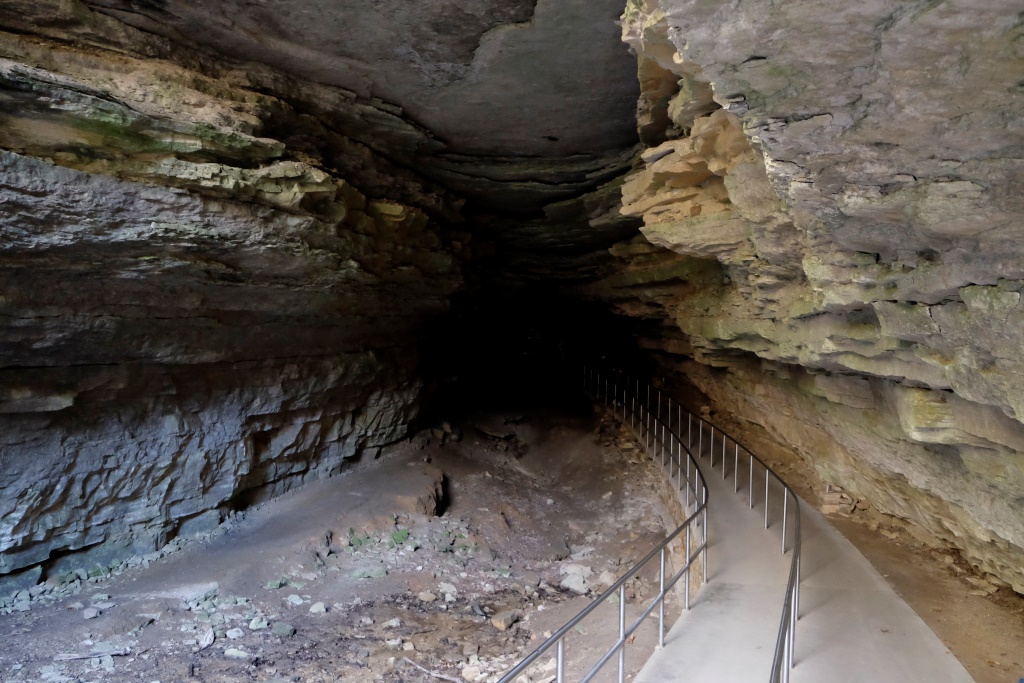 Ja reiz esam atkūlušies uz Mamutu alu nacionālo parku, jāielien arī kādā alā. Šeit uz savu roku nekur neļauj doties, tad nu nopērkam biļetes un kopā ar grupu braucam apskatīt sasalušo Niagāru, tā vienu no veidojumiem nosaucis kādreizējais alu īpašnieks. Savulaik viss alu komplekss bija privāto darboņu rokās, bet viņi neesot diez ko saudzīgi izturējušies pret alās sastopamajiem dabas brīnumiem – samaksājot noteiktu summu gidam, varēja mājās braukt ar iespaidīgu stalaktītu padusē. Tad nu štata vadība kopā ar valsti ņēmuši apkaimi savā pārziņā un tagad te ir nacionālais parks. Šajā alu sistēmā ir izpētīti vairāk nekā 650 km, bet alas mērīšana joprojām turpinās, jo tās atzari pazemē stiepjas uz visām pusēm. Mēs gan apskatām nepilnu kilometru, par ko esam druksu vīlušies – bijām cerējuši uz garu piedzīvojumu kā Carlsbad alās. Tad nu pēc ekskursijas turpinām pastaigu pa virszemi – apciemojam vēsturisko alas ieeju, aizkāpjam līdz netālajai Zaļajai upei, kura savulaik kalpojusi kā galvenais transporta ceļš vietējiem un tūristiem.