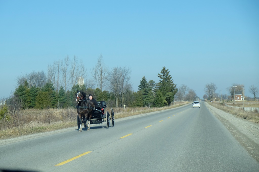 Līdz Kīta meža namiņam ir dažu stundu brauciens un šoreiz ceļu mērojam pa galīgām nomalēm, Kīts mums grib parādīt Ontario provinces nostūrus, citādi būsim vien šosejas redzējuši. Viens no apkaimes kolorītiem ir menonīti, kas šeit dzīvo “biezā slānī”. Menonīti ir viena no anababtistu grupām (radniecīga amišiem), kuras izcelsme atrodama 16. gadsimtā, kad Menno Simons, kura uzskati atšķirās no tradiconālās baznīcas, sāka tos paust un attiecīgi tika vajāts. Arī viņa sekotājiem miera nebija, tāpēc daudzi no Eiropas pārcēlās uz citām pasaules daļām, tai skaitā, Ziemeļameriku.