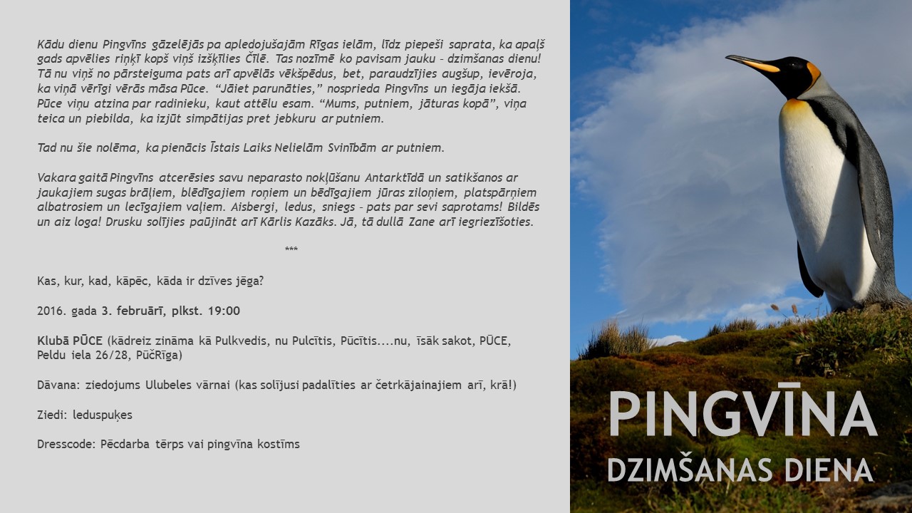 Ideja par Operāciju Pingvīns radās 18. janvāra naktī, tautās tā tika palaista 19. janvārī, skaidrība par to, ka viss patiešām izdosies, atnāca 19. februārī, bet kuģis uz Antarktīdu devās ceļā 20. februārī. Ej nu sazini, kurš datums uzskatāms par Īsto Dzimšanas dienu. Bet tam jau arī nav tik liela nozīme, tāpēc esmu izvēlējusies 3. februāri, kas ir pa vidu visiem šiem pagājušā gada notikumiem, lai sasauktu visus Pingvīnus kopā, pateiktu paldies klātienē un atskatītos uz pašu piedzīvojumu.