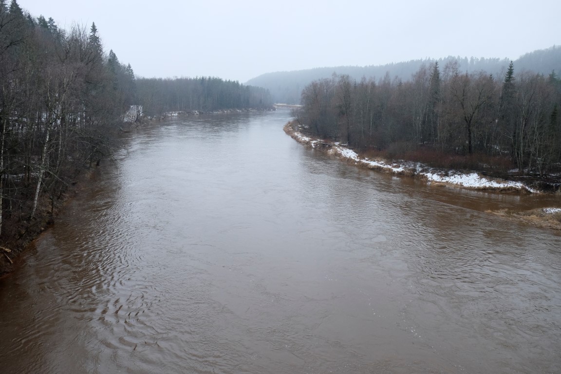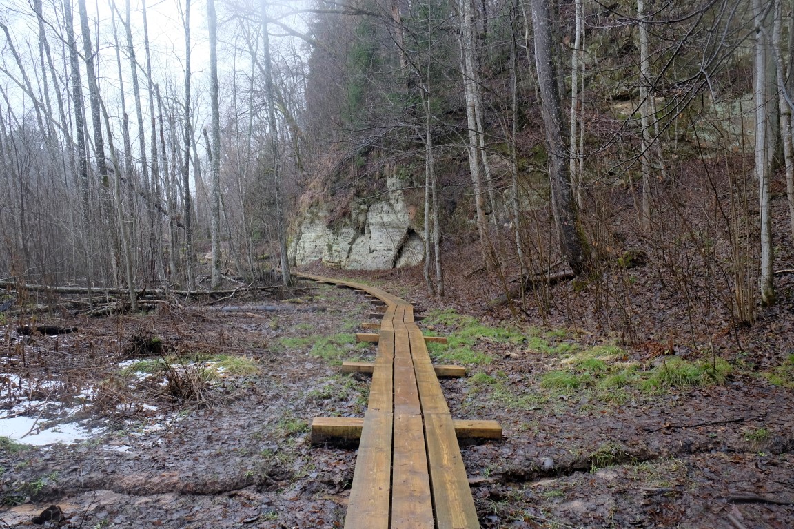Pēc tam civilizācija pazūd un mēs pa pielijušo mežu čāpojam tālāk. No ceļmalā nozāģētas lazdas salaužam ziedēt sākušos zarus, lai aiznestu pavasari arī uz mājām. Priecājamies, ka Gaujas Nacionālajā parkā jūtama darbīga noskaņa – visos kaktos top jaunas nojumes, norādes, soliņi, tiltiņi. Tas gan pilnībā neatņem dubļu brišanas prieku, bet kas gan tā par pastaigu, pēc kuras kājas sausas un tīras!