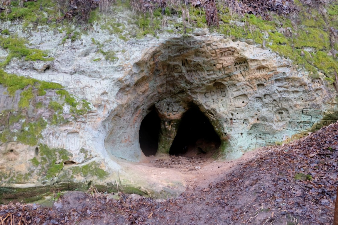 Pie Brūveriem kāpjam lejā, pa ceļam samīļojot vietējo Vella ģīmi, lai no Velnalas bristu atpakaļ vienā līmenī ar upi. Tur atklājas Piķenes kraujas smilšakmens atsegumi, kas gan nosegti ar dažnedažādām “dabas entuziastu” piemiņas veltēm. Tās redzot, man vienmēr nāk prātā karikatūra, kad vīrs ar sievu brauc pa Gauju laivā un abi skatās uz klintīm ar uzrakstiem. Vīrs žēli novelk: “Un tu man teici, ka dabas skaistums te ir neaprakstāms!”.