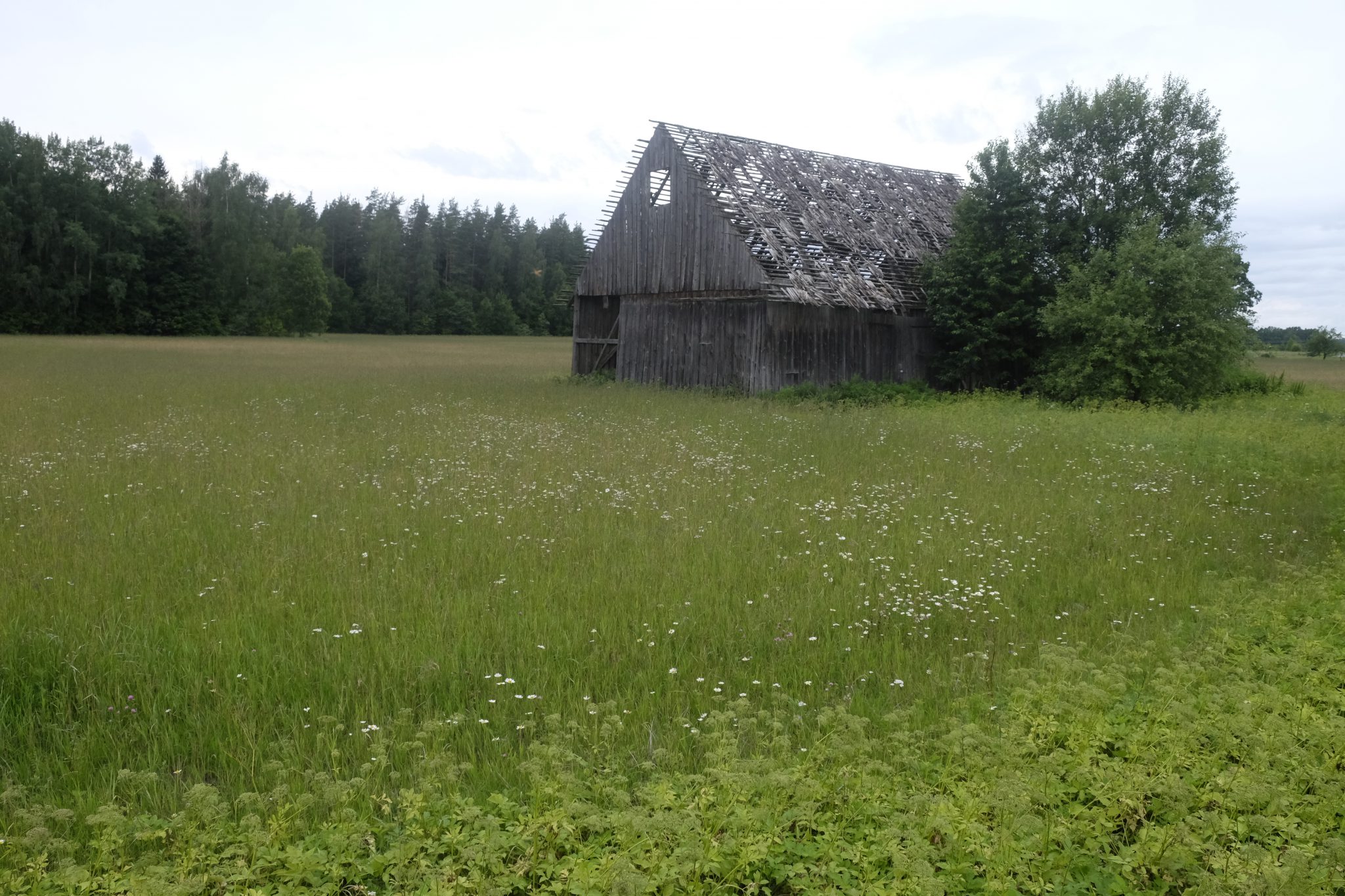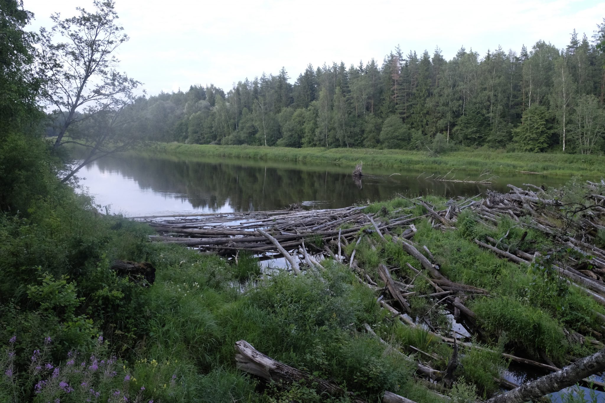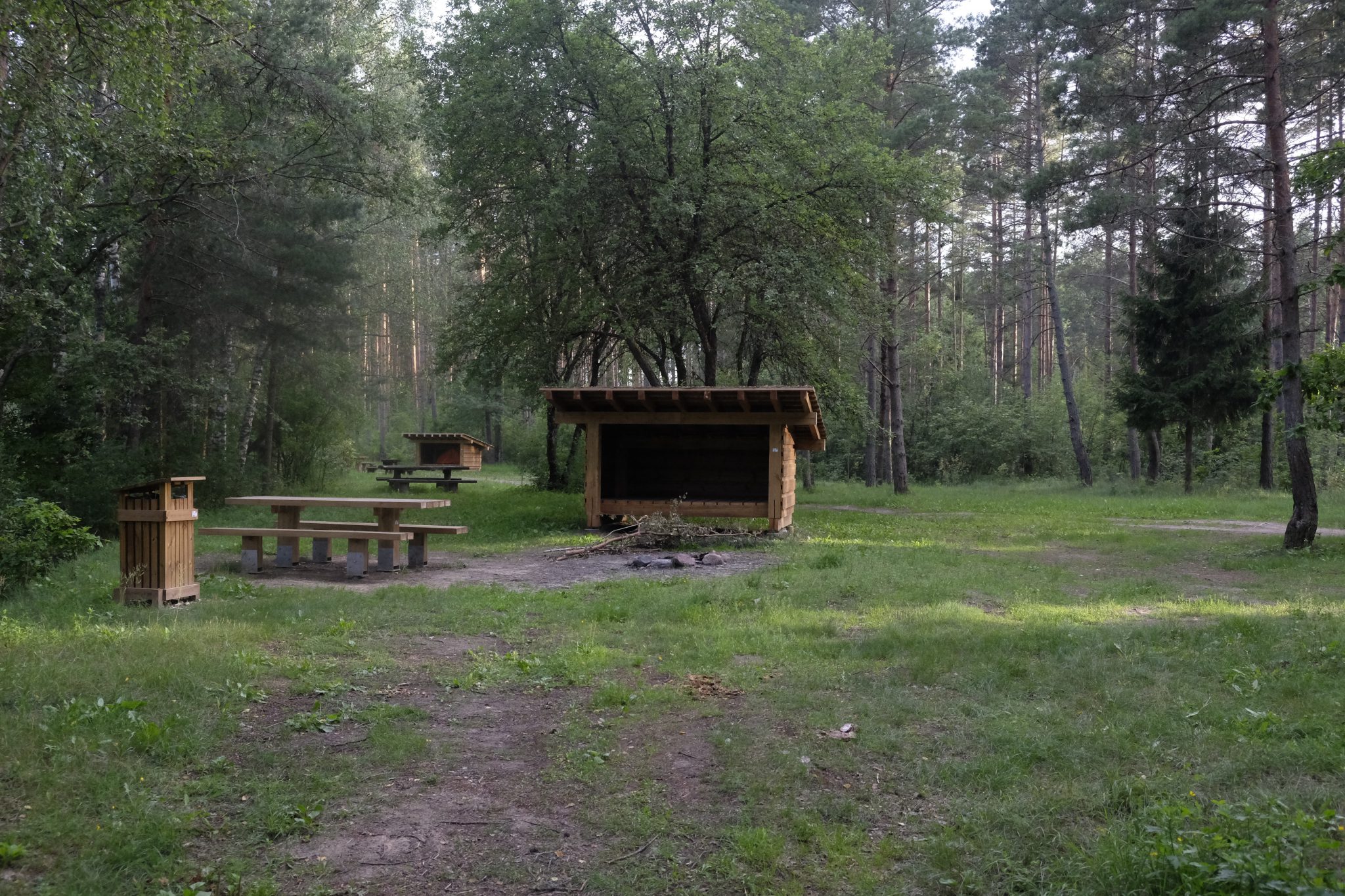 Ap astoņiem vakarā pamanu ceļmalā kempingu laivotājiem. Neviena laivotāja gan tur nav, toties ir trīs nojumes, galdi, krēsli, ugunskura vietas – viss svaigs, izskatās nesen tapis. Urrā! Noskatu tālāko nojumi, salaužu zaru slotu un izmēžu dēļu grīdu. Tad turpat uzceļu telti – tagad var mierīgi līt. Tomēr līt joprojām neviens netaisās un es mierīgi savācu pa pakšiem vakariņas – aveņu grāpi, saplūcu parastās un zaķskābenes, savācu tēju. Nometnes malā auga arī trīs saulsardzenes, bet izskatās, ka tās man nocēla viens vietēja rakstura apšaubāms subjekts, kuru manīju aizbraucam uz velo. Varbūt labi, ka tā. Ar tām saulsardzenēm neko nevar zināt.