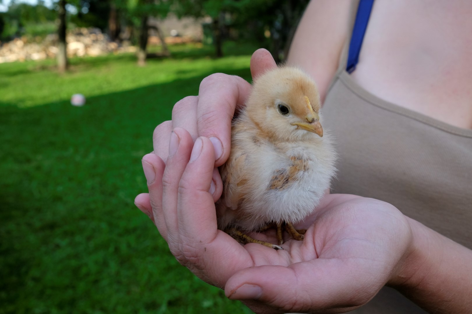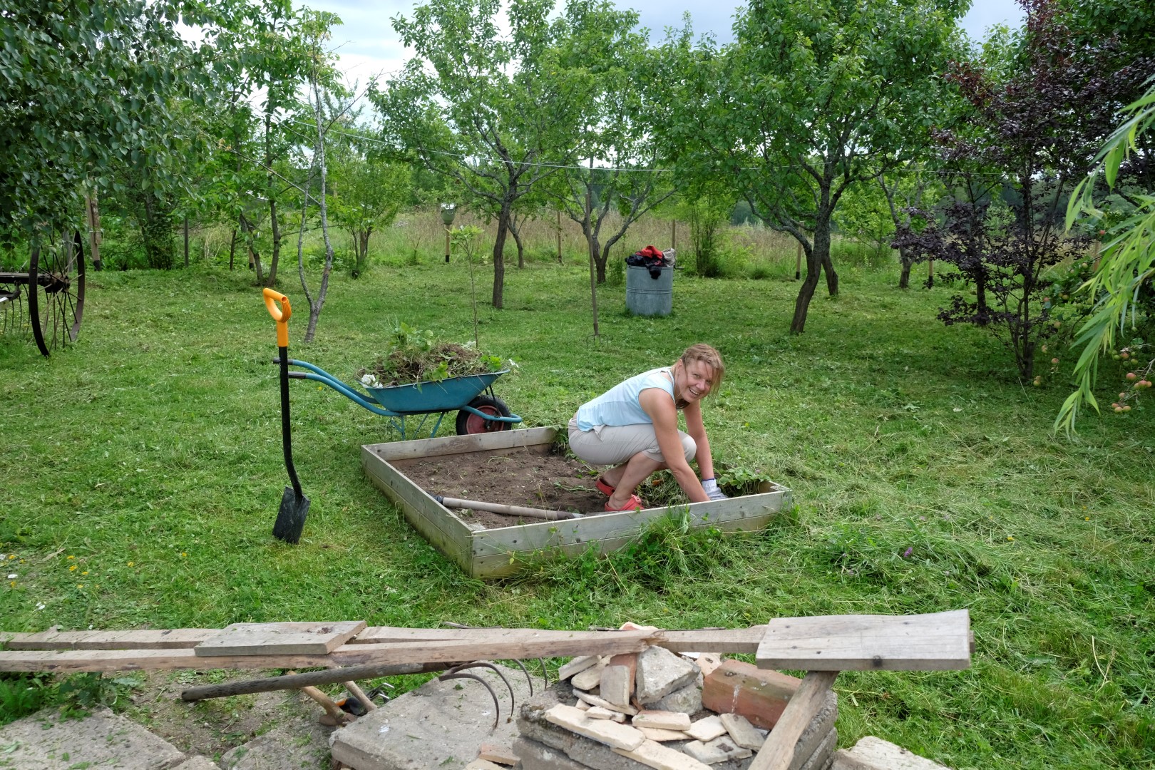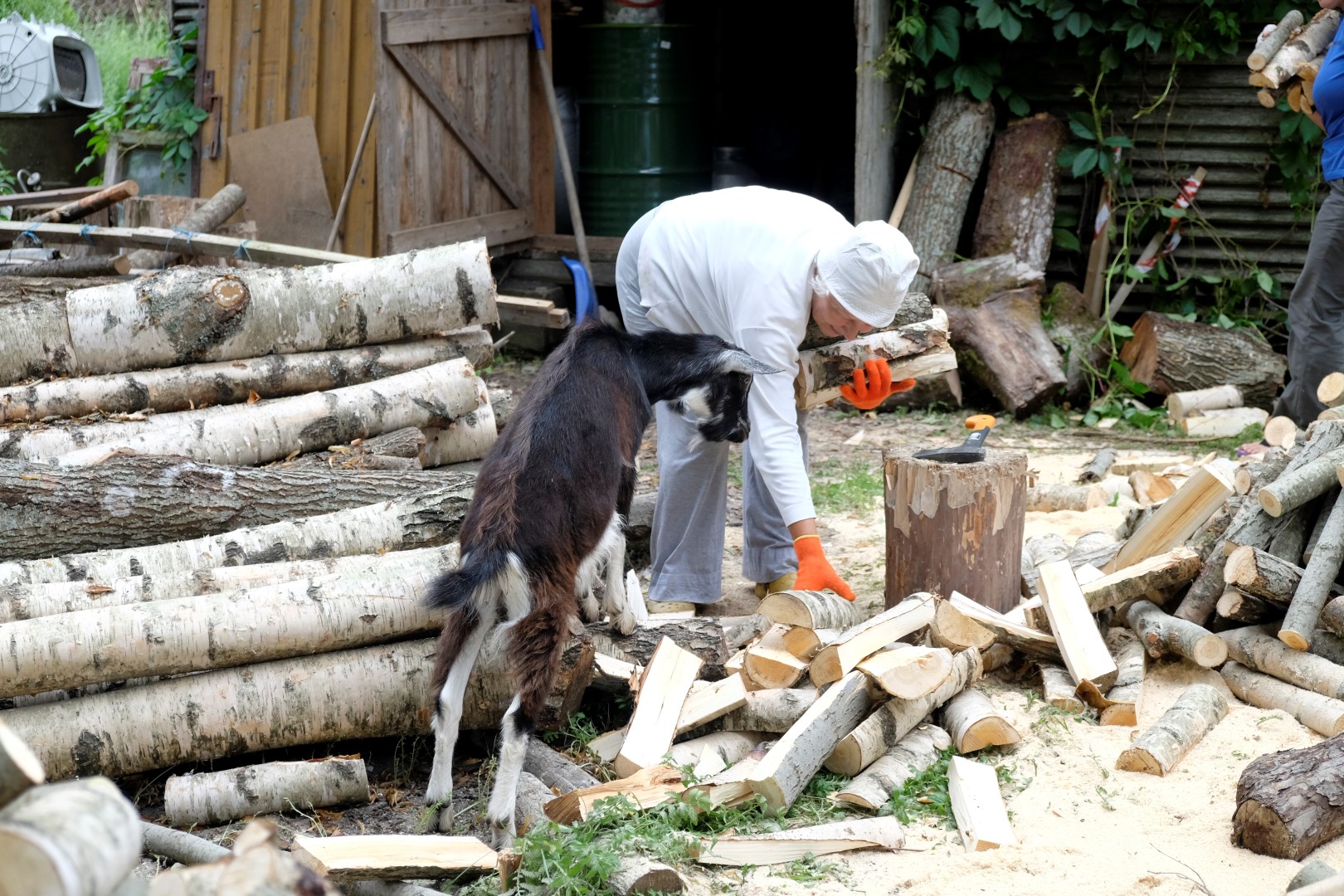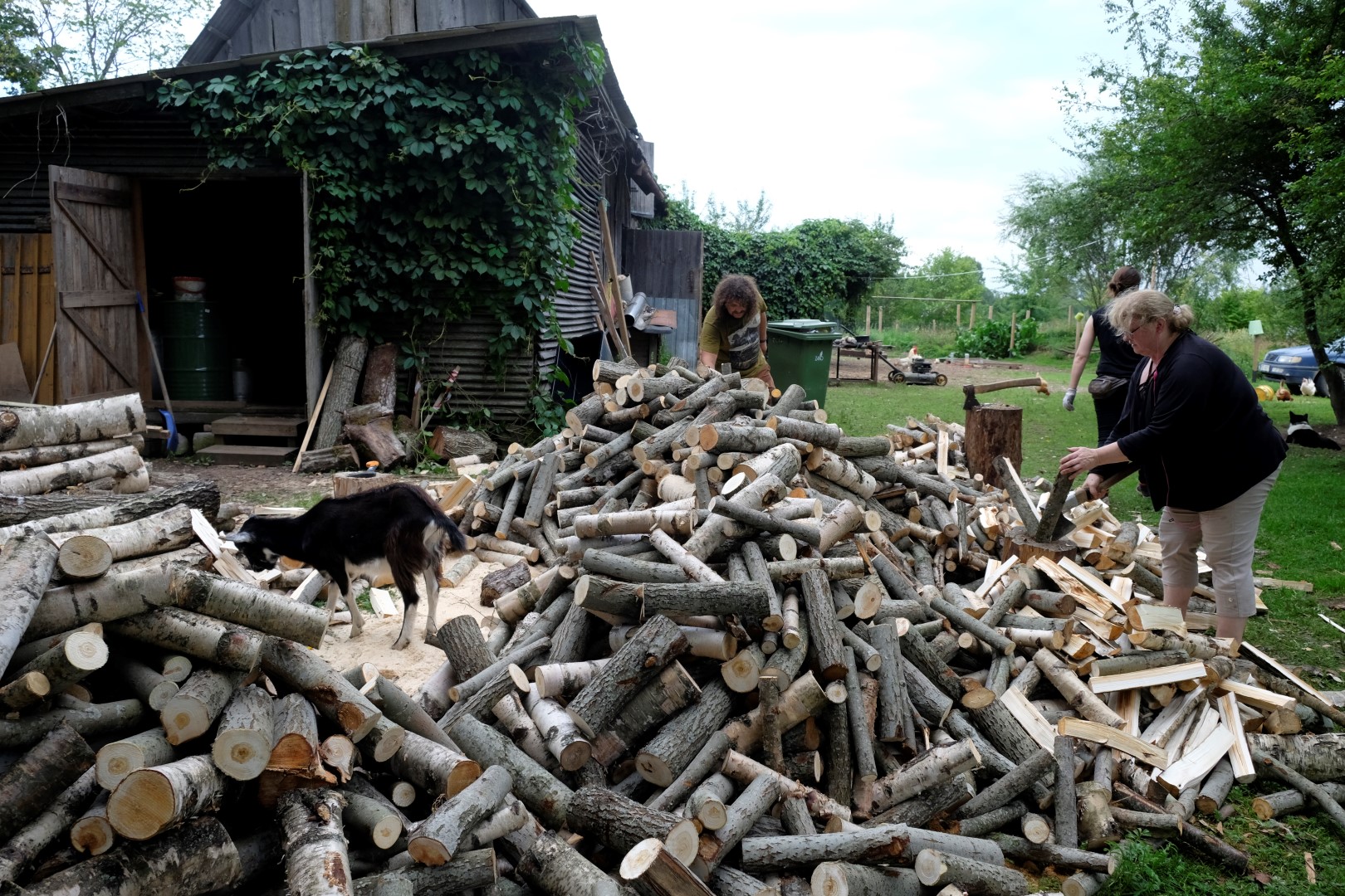 Kamēr mēs niekojamies ar klūgām, ārā atgriezusies saule. Tomēr ogu krūmi ir slapji, tāpēc metamies malkas darbos. Ik pa laikam mūs apciemo kazlēns Gvido, kurš grauž no pagalēm mizu un arī par katru cenu grib pagaršot mammas oranžos cimdus – tik nevar saprast, kāpēc tie burkāni tādi jocīgi.