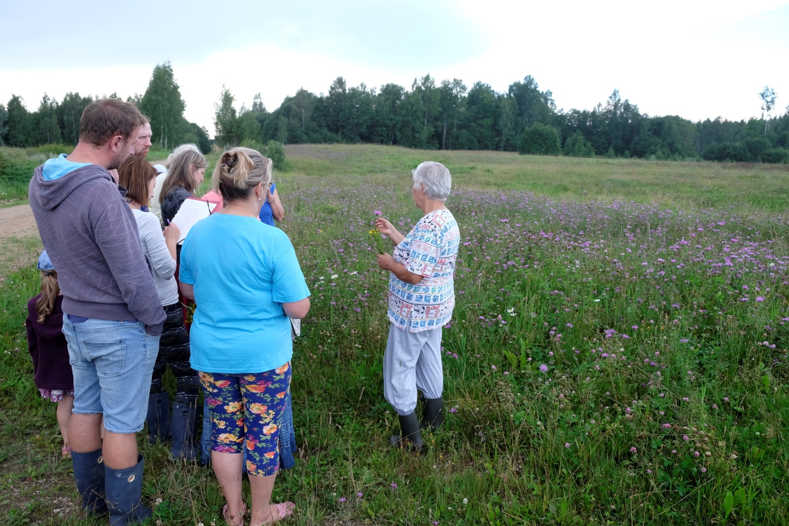 Iesākumā mamma pastāsta par dažiem ārstniecības augu vākšanas un drogu sagatavošanas aspektiem, bet drīz vien stāstījums pieskaņojas jautājumiem – lielākā daļa ekskursantu ir diezgan zinoši par tēmu. Tā nu klīstam pa pļavu, ļaujot augiem noteikt maršrutu un apstāšanās vietas – atkārtojam šo to par veciem paziņām, kā arī nelaižam garām iespēju iepazīties ar jauniem augiem-draugiem. Kad jau krietnu laiku klīsts, atkal nāk viņš-lietutiņš un vērš soli māju virzienā.