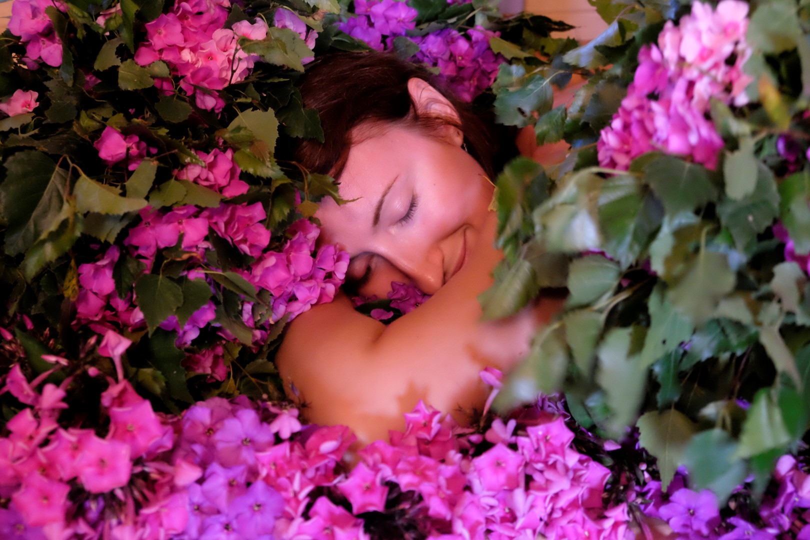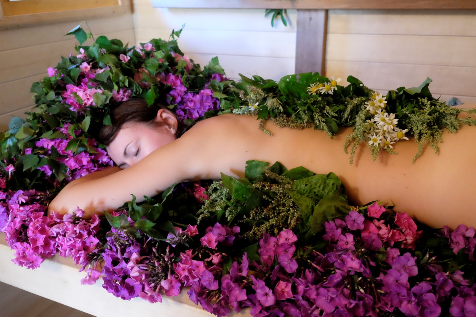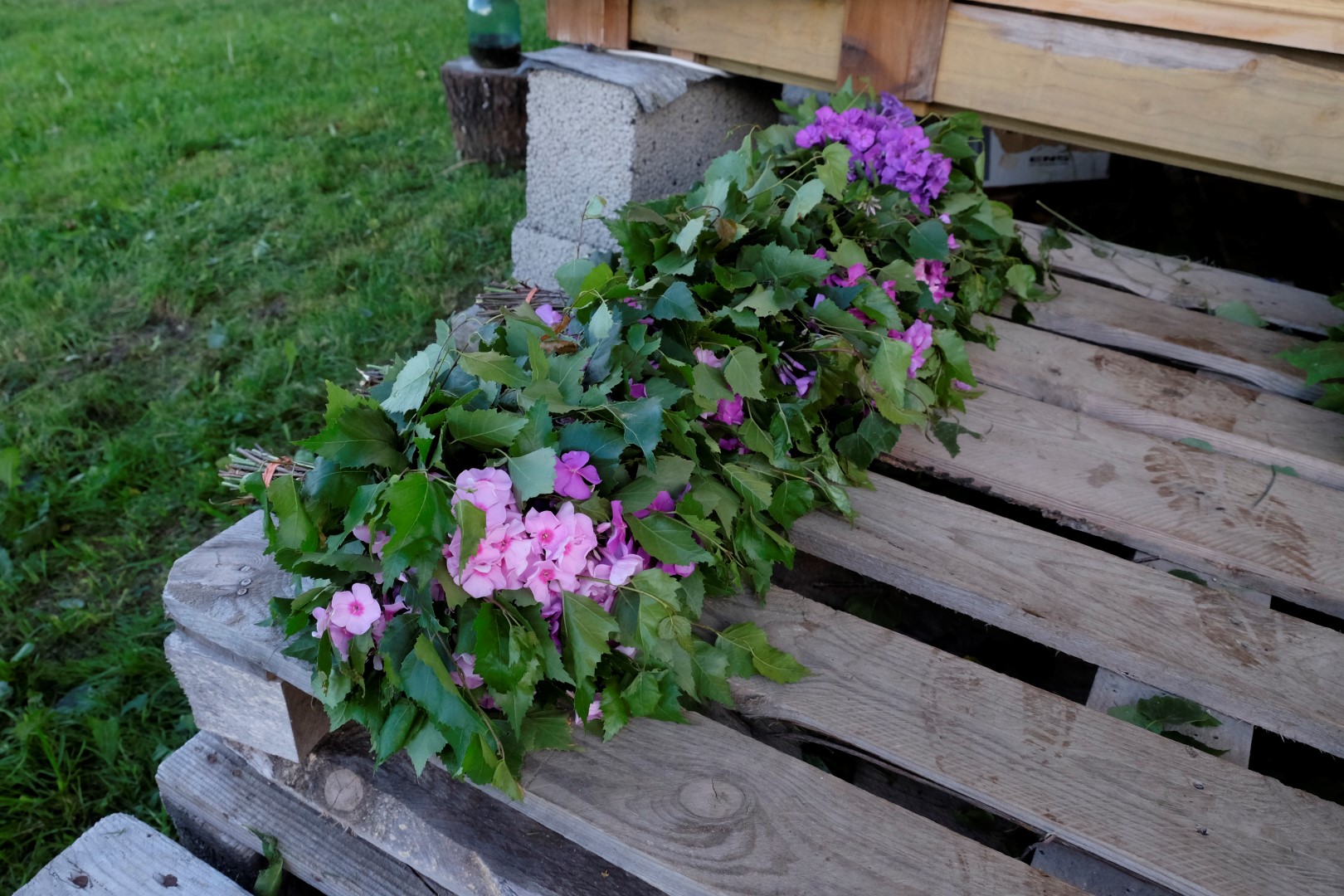 Tur nu ceļi šķiras – daļa talcinieku aizbrauc mājās, tikuši pie Aijas un vistu sarūpētas pateicības, mēs paliekam viens neliels bariņš, kas vēl grib tikt pirtī. Un ne jau šādā tādā – šodien ir flokšu pirts. Tā kā flokšu dobe gar māju bija jālikvidē dēļ drīzumā gaidāmajiem ūdensvada ievilkšanas darbiem, tad pirts un peramie slīkst ziedu smaržu kalnos.