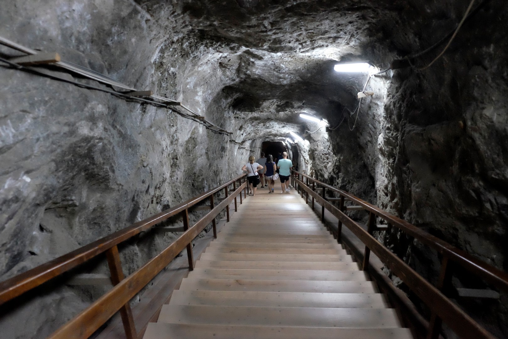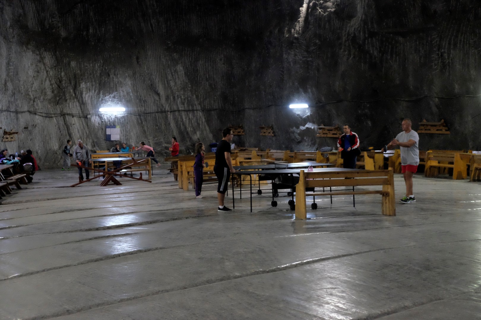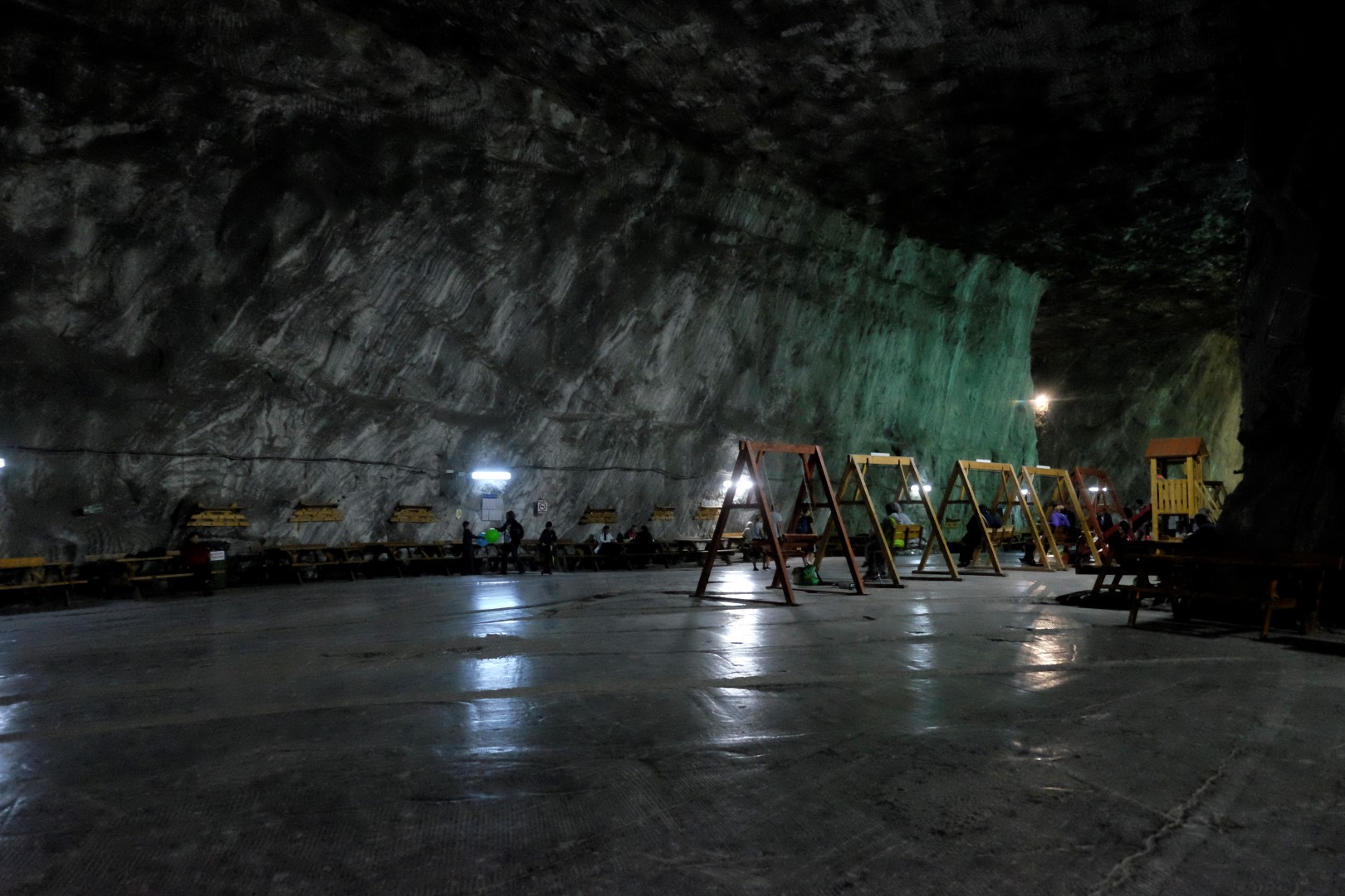 Arī šeit ir, hmm, interesanti. Ko jūs parasti iedomājaties, ja jums paziņo, ka apmeklēsiet raktuves. Es – līšanu pa šahtām, šaurību, lukturīšus un stāstus par to, ko šeit var dabūt laukā. Izrādās, nekā tamlīdzīga. Kad pa garām trepēm nokāpjam pazemē, paveras diezgan neparasts skats. Esam nonākuši milzīgā zālē ar pulētu grīdu un šeit izvietotas rāpšanās atrakcijas, tādas kā mūsu Tarzāns vai Mežakaķis. Turpinot ceļu, parādās nākamās zāles, kurās ir šūpoles, piepūšanās atrakcijas, galda tenisa galdi. Paralēli cilvēki spēlē galda spēles, badmintonu, brauc ar skrituļslidām, lasa grāmatu, ieturas. Principā dara visu to, ko parasti cilvēki darītu parkā. Nu ir viņiem tomēr kaut kāds Drakulas gēns – ārā spīd saule, ir silts, bet nē, šie nolien pazemē…