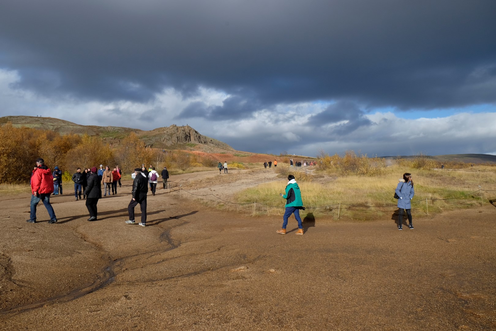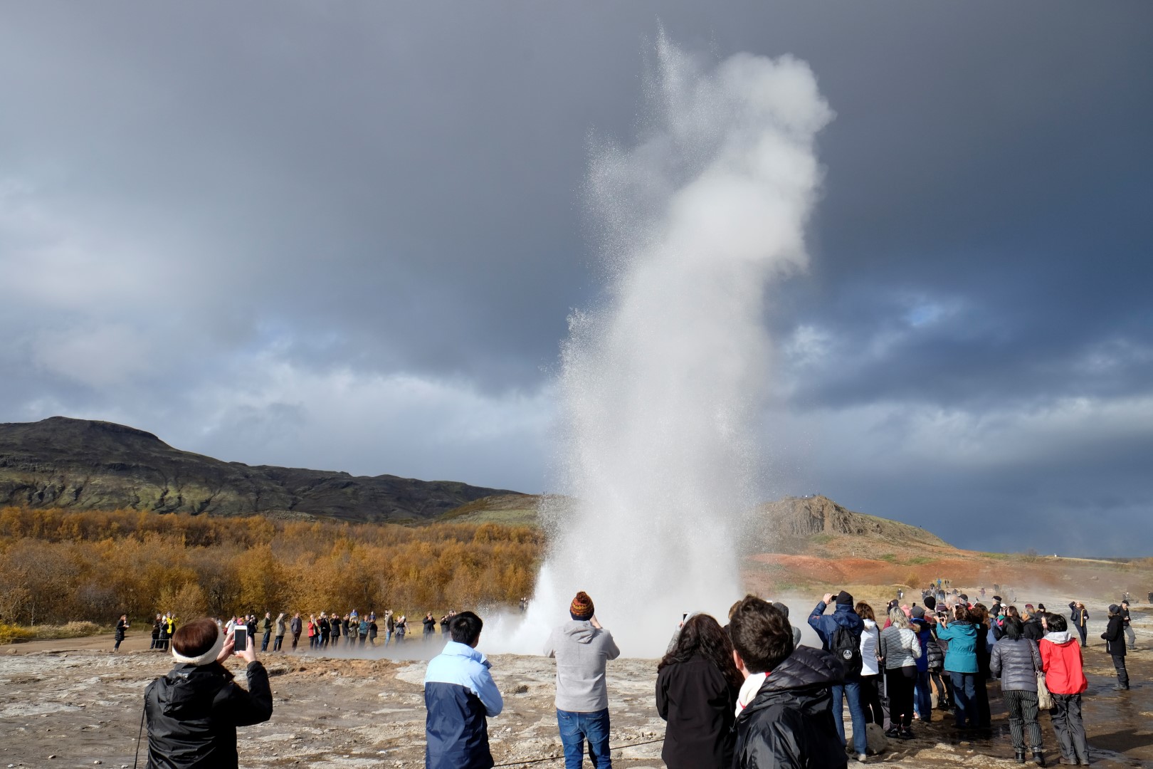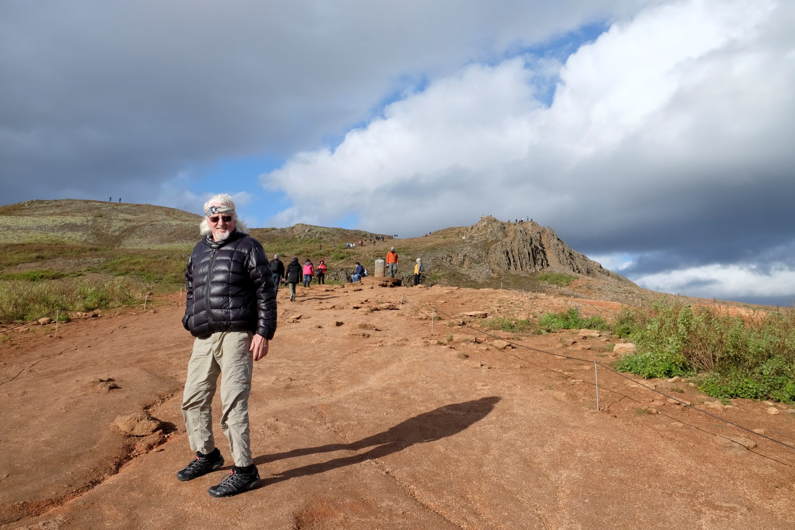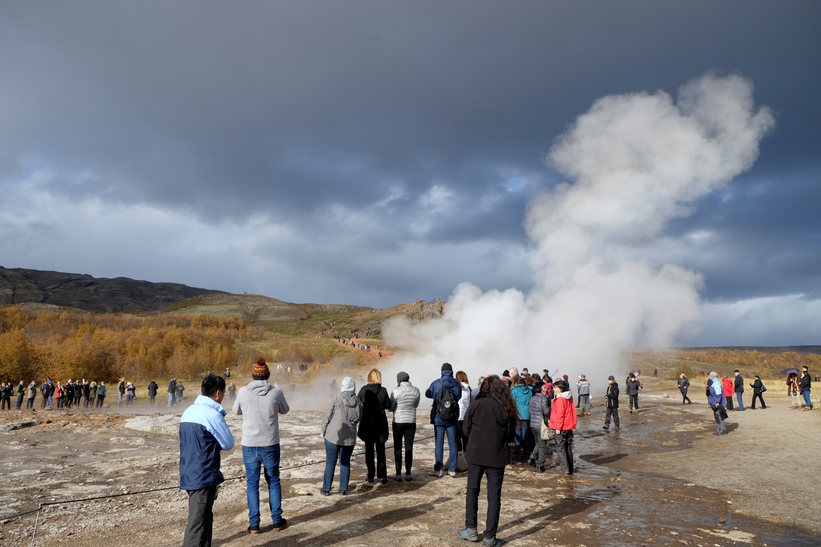 Mūsu nākamā pietura ir vieta, kur gaisā šaujas geizeru salūts. Lai arī geizerus gandrīz neredz aiz tūristu pūļiem, man šeit patīk, jo saule iekrāso apkaimi, izceļot rūsganos toņus vēl spilgtāk. Dunkans gan izskatās drusku nomākts un brīdī, kad neparasti augsts geizera izvirdums pamatīgi apšļāc tuvāk stāvošos, viņš apmierināti murmina kaut ko par dabīgo izlasi un “Darwin awardiem”.