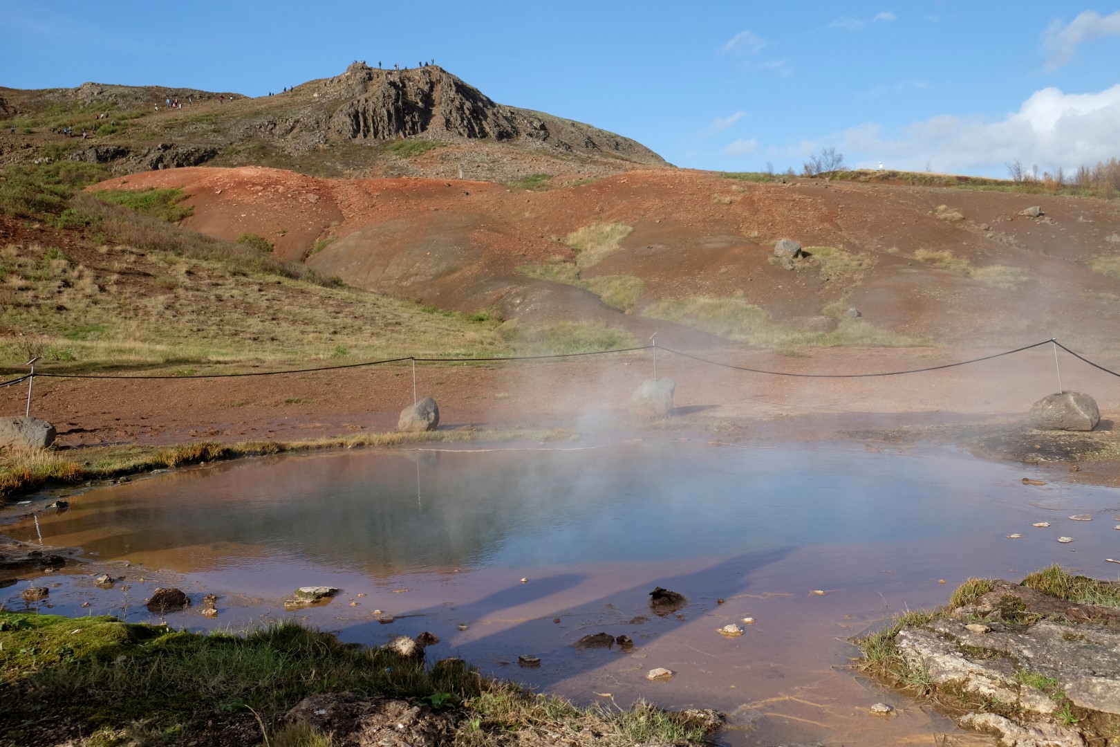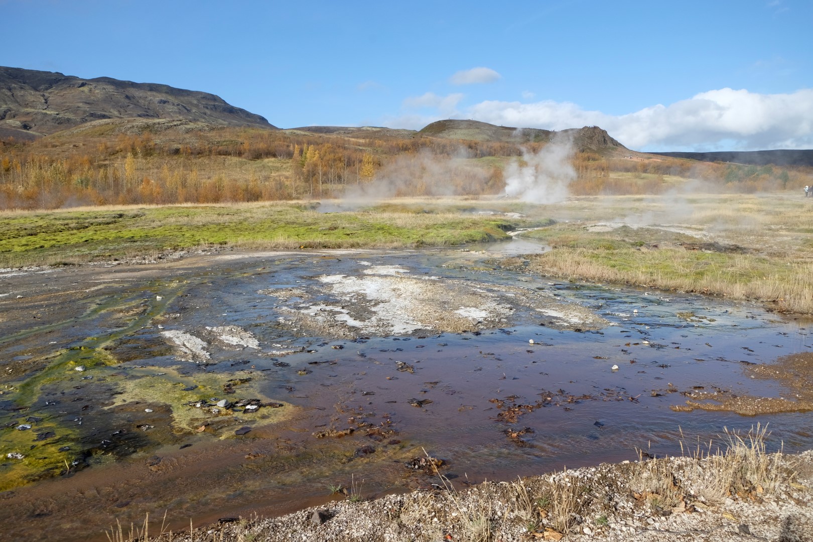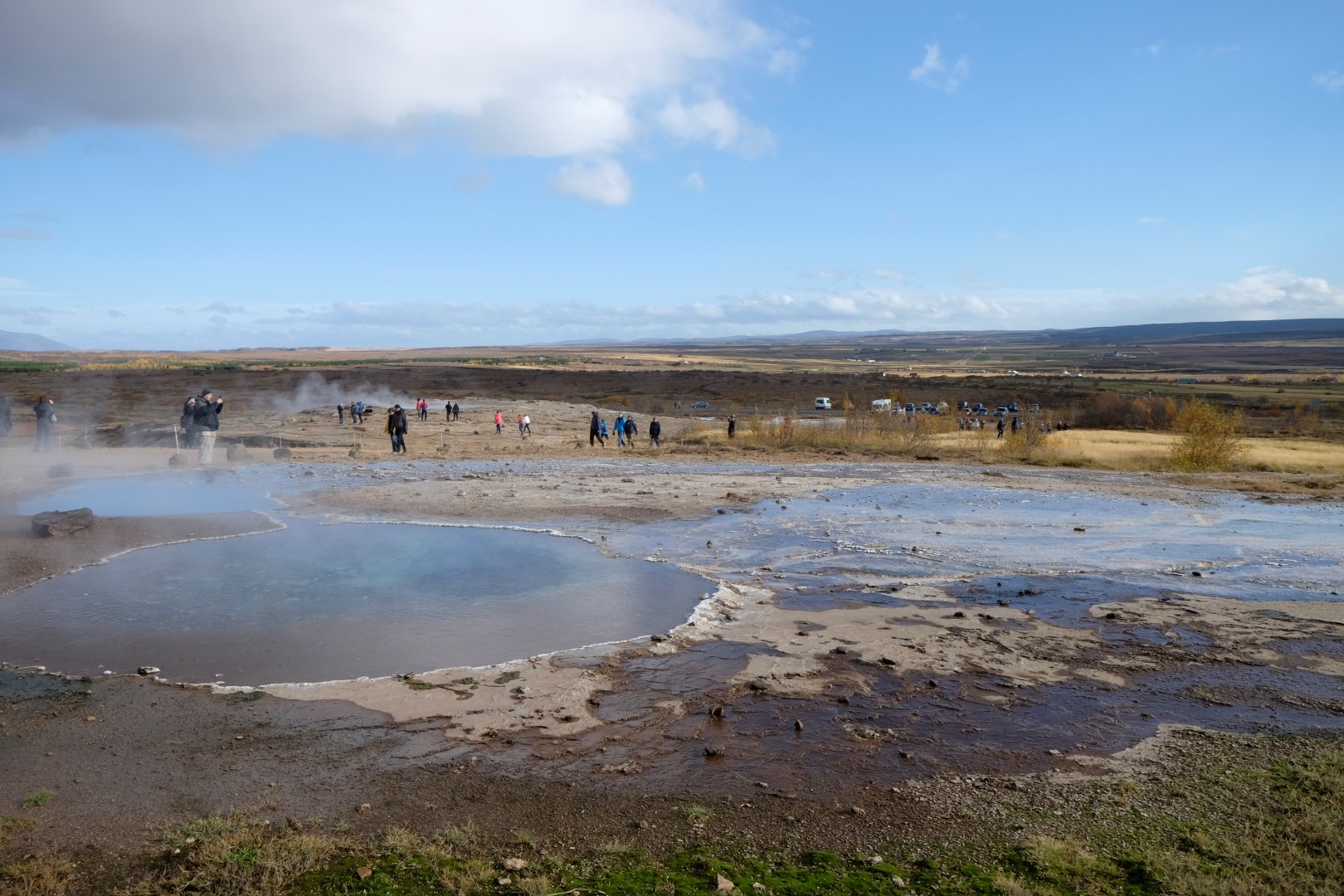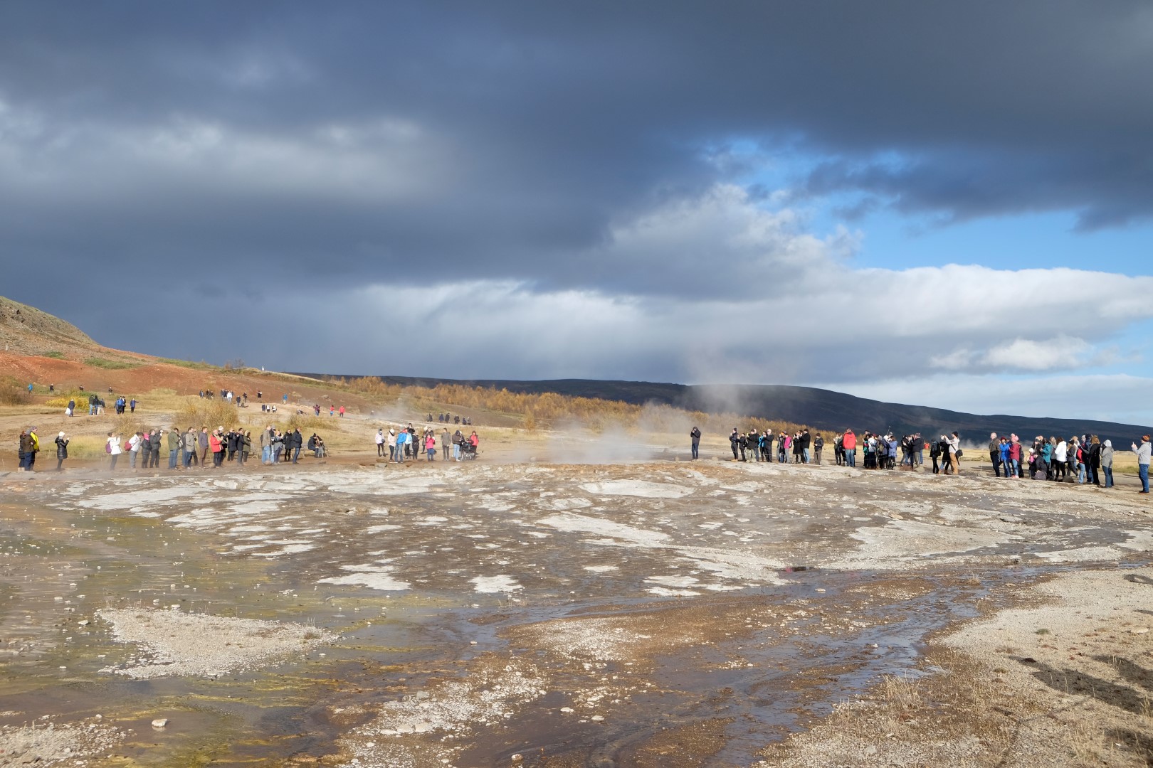 Mūsu nākamā pietura ir vieta, kur gaisā šaujas geizeru salūts. Lai arī geizerus gandrīz neredz aiz tūristu pūļiem, man šeit patīk, jo saule iekrāso apkaimi, izceļot rūsganos toņus vēl spilgtāk. Dunkans gan izskatās drusku nomākts un brīdī, kad neparasti augsts geizera izvirdums pamatīgi apšļāc tuvāk stāvošos, viņš apmierināti murmina kaut ko par dabīgo izlasi un “Darwin awardiem”.