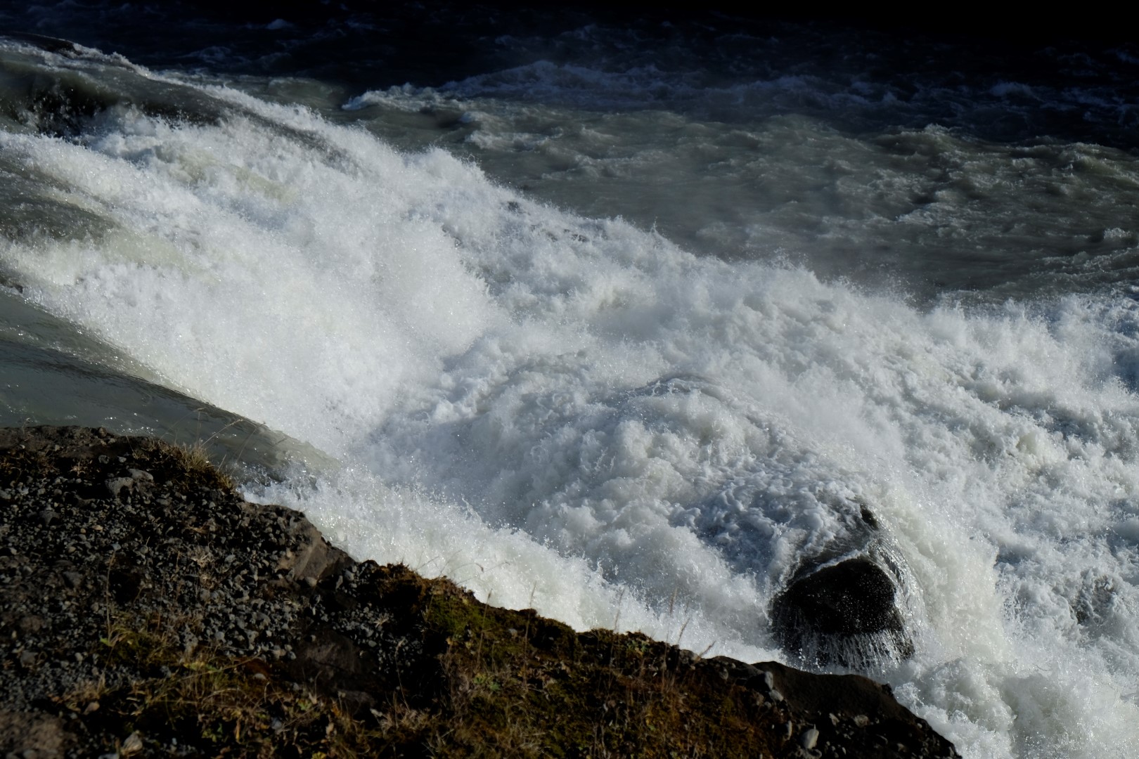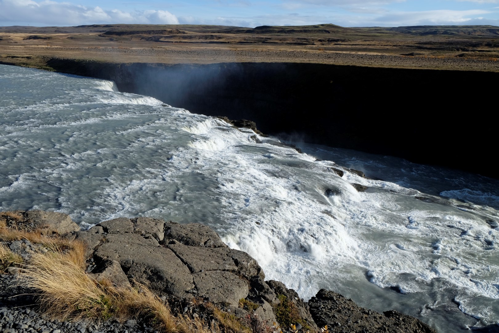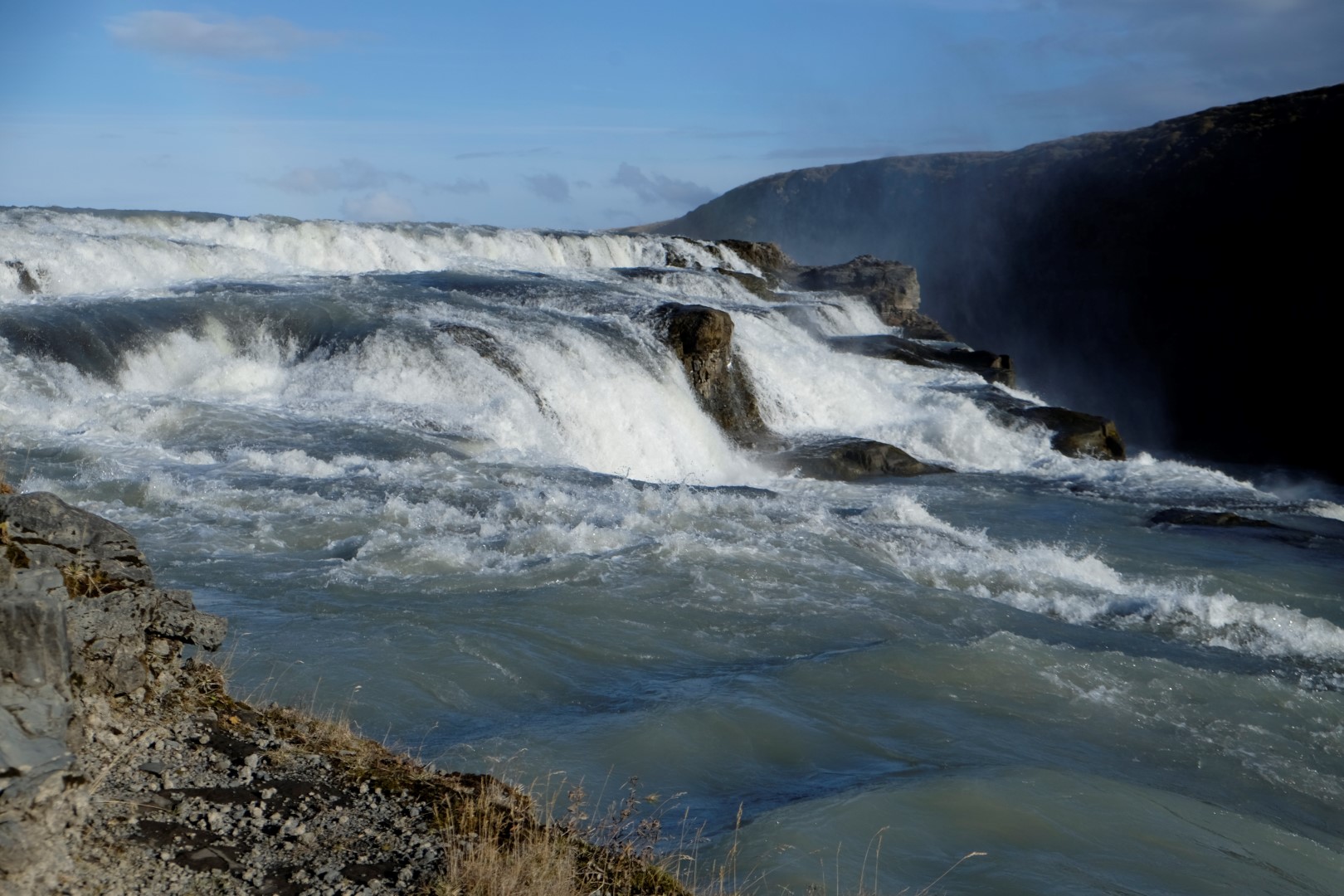Turpat netālu ir slavenais Gulfoss ūdenskritums, kurā dzīvojas vējš un varavīksnes. Apskatām to no augšas un apakšas, laiks mūs patiešām lutina. Brīdī, kad dodamies prom, gaismas tiek izslēgtas un ūdens lejā ir varens, bet ne tik piesātināts kā pirms mirkļa.