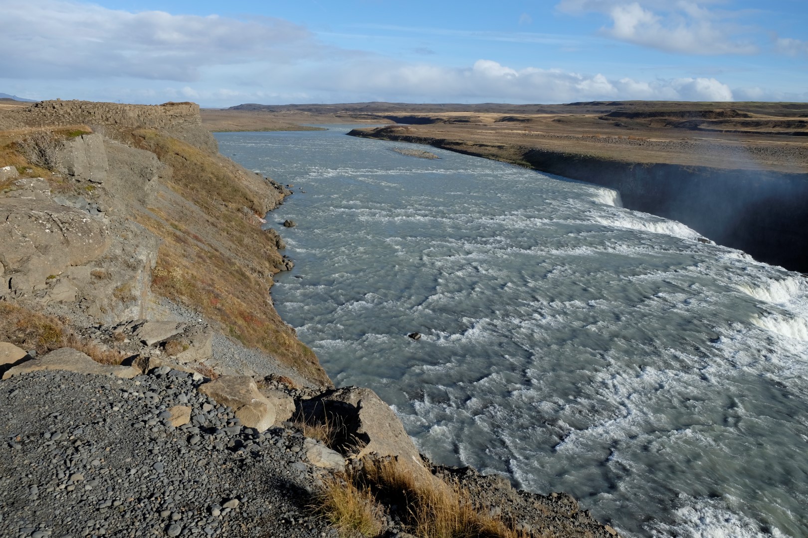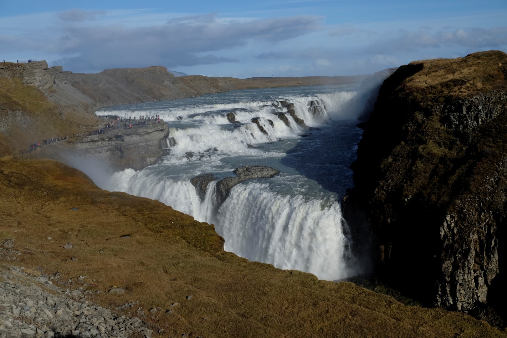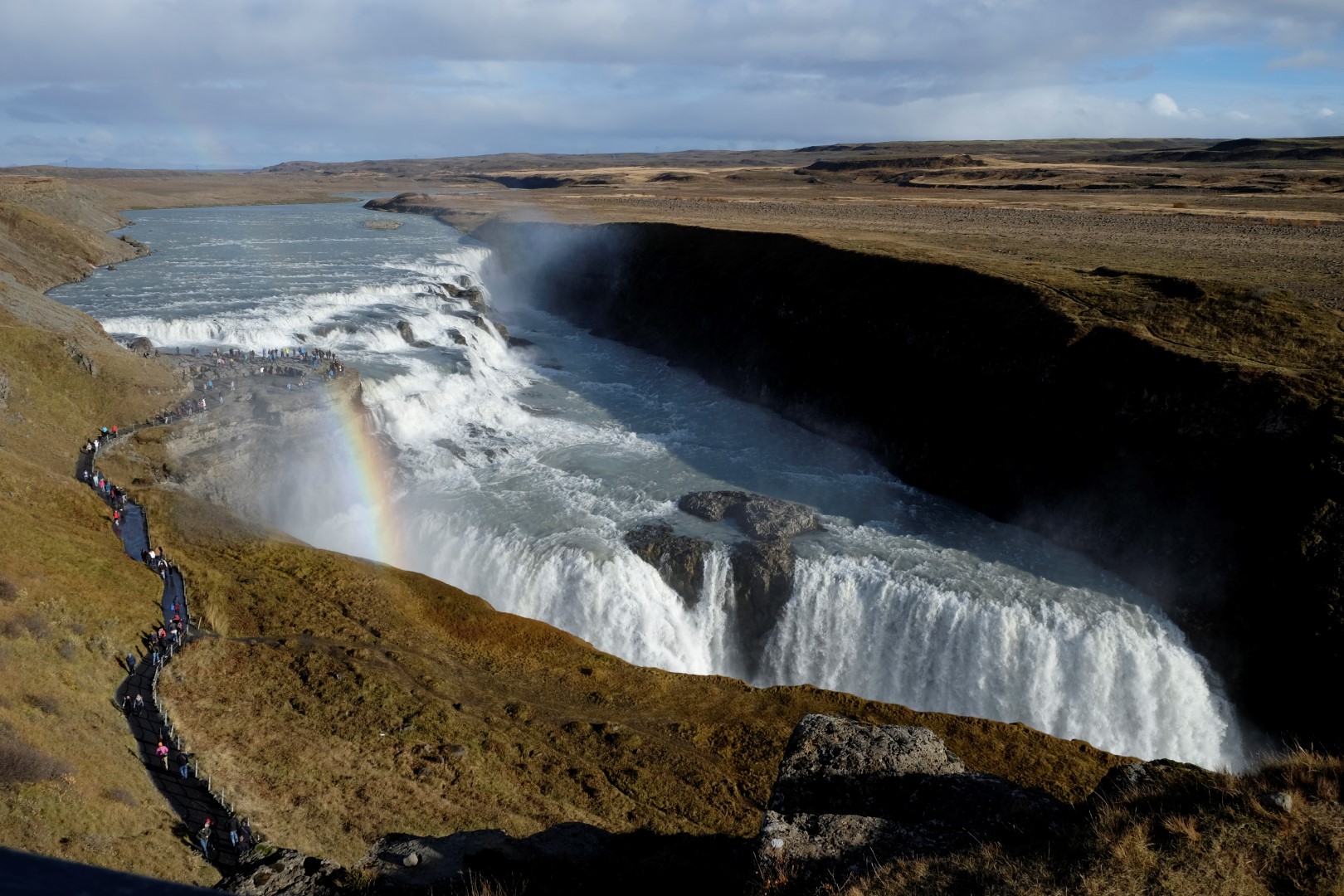 Turpat netālu ir slavenais Gulfoss ūdenskritums, kurā dzīvojas vējš un varavīksnes. Apskatām to no augšas un apakšas, laiks mūs patiešām lutina. Brīdī, kad dodamies prom, gaismas tiek izslēgtas un ūdens lejā ir varens, bet ne tik piesātināts kā pirms mirkļa.
