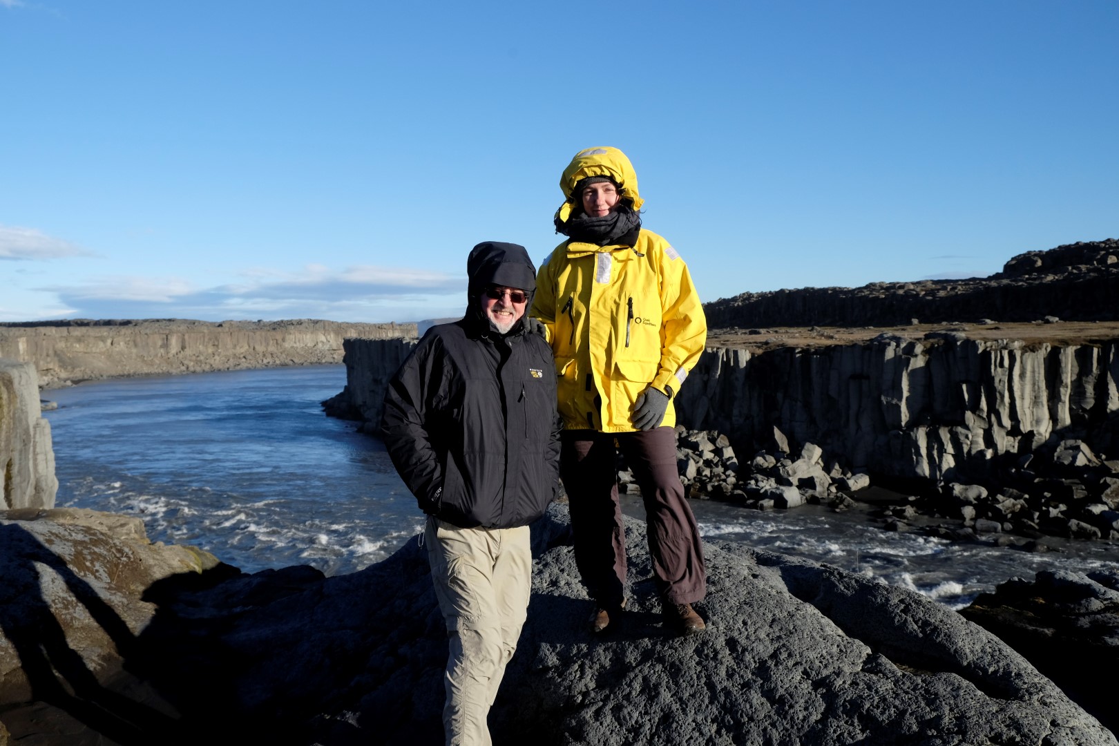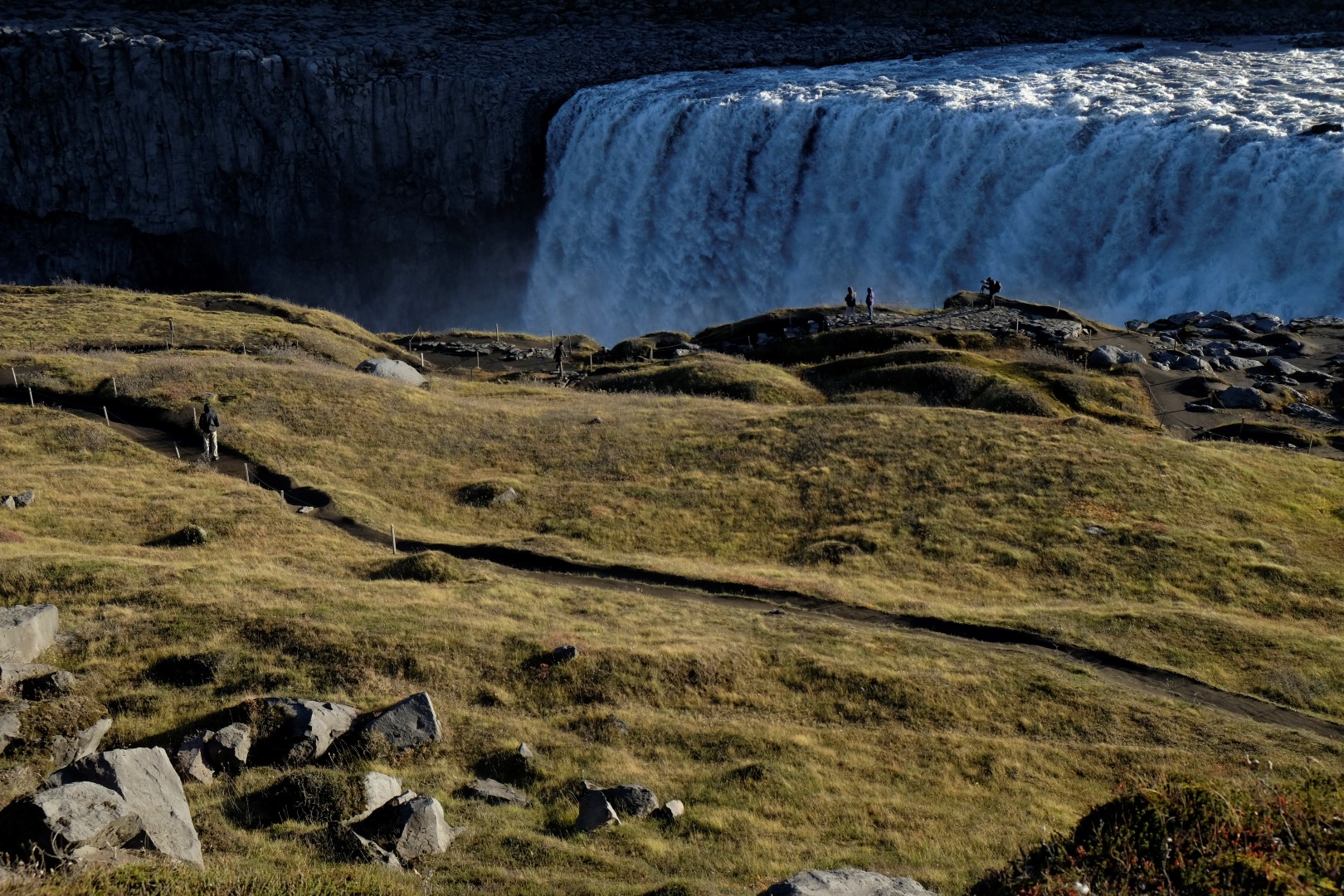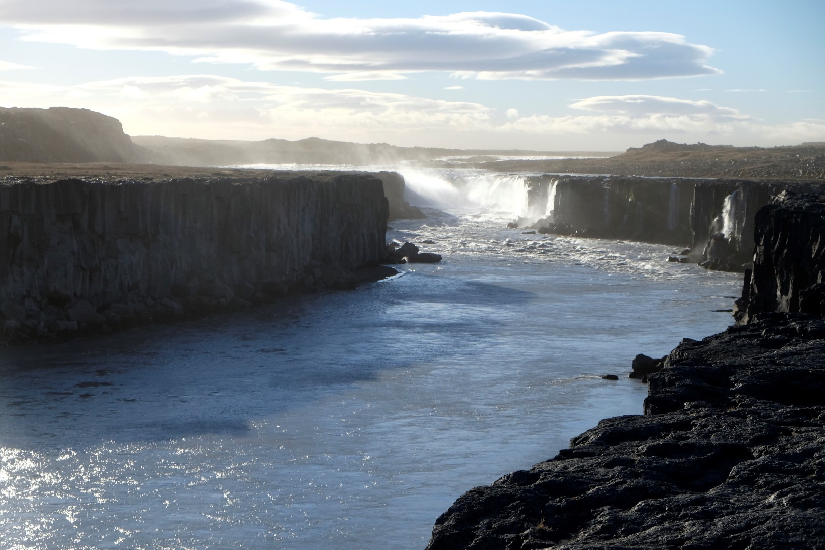 Lai arī uz vareno Dettifoss ūdenskritumu var tik pa dažādiem ceļiem, esmu izvēlējusies tādu, kas ir taisnāks un ved pa apli, tas ir visai draņķīgas kvalitātes. Toties apkaime kā uz Mēness – tādu sajūtu Islandē var noķert jau sākot no piezemēšanās lidostā. Kad nonākam pie Dettifoss un netālā Selfoss ūdenskrituma, tie ir katras ceļa bedres vērti. Mums par prieku spīd saule un ūdens straumes zeltainajā gaismā izskatās īpaši iespaidīgi. Apkārt staigāšana gan nav tik vienkārša – vējš zēģelē neapstājoties un pūš acīs un mutē smalkus smilšu graudus.