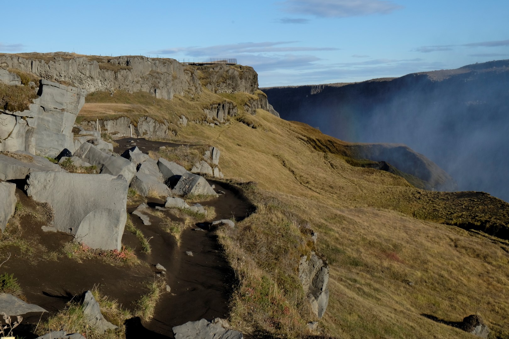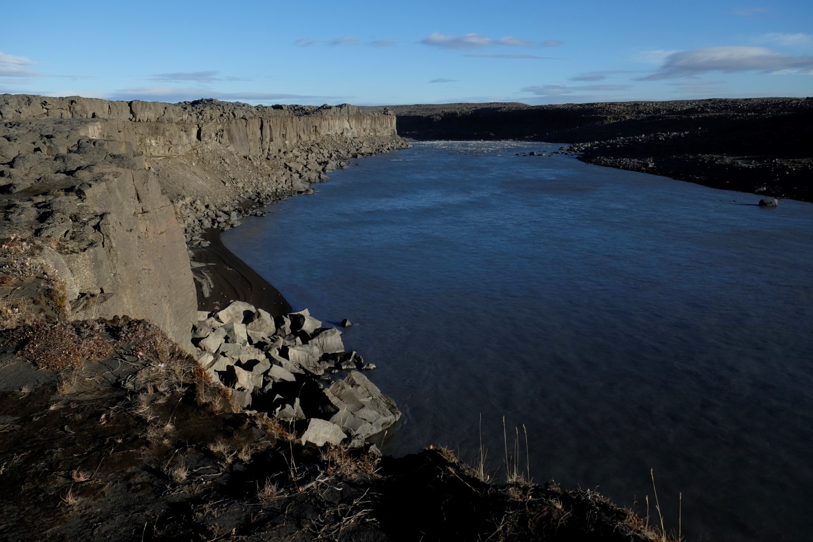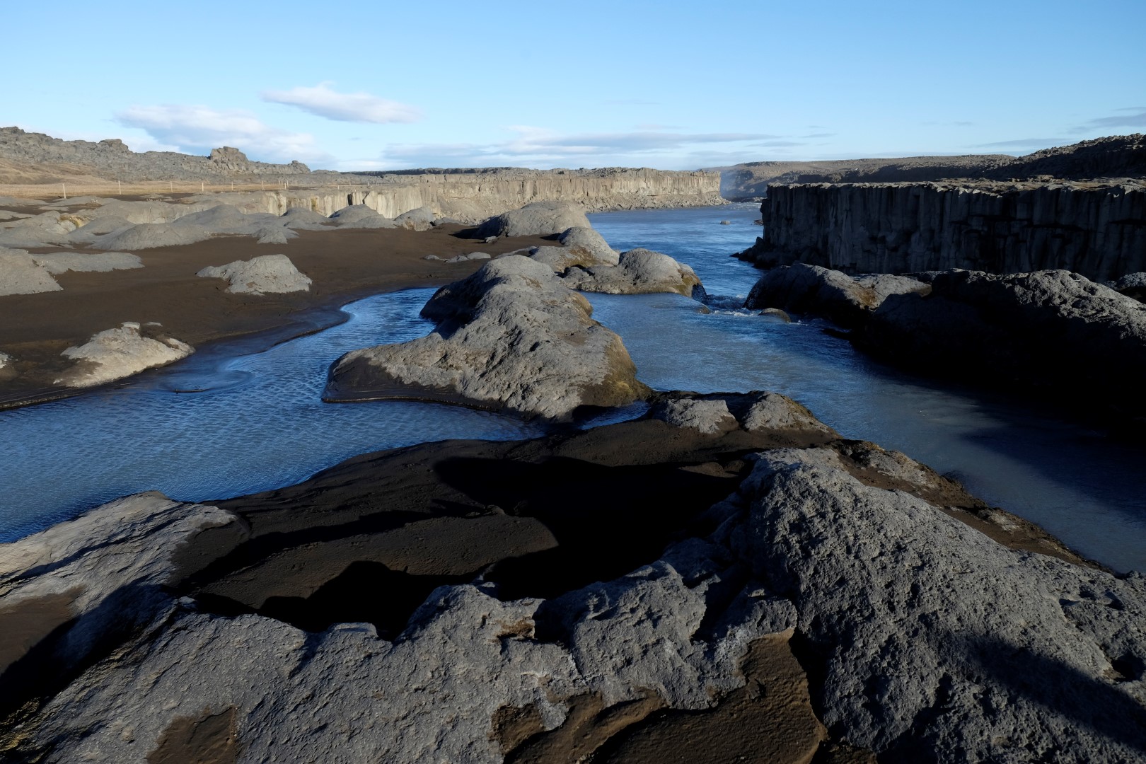 Lai arī uz vareno Dettifoss ūdenskritumu var tik pa dažādiem ceļiem, esmu izvēlējusies tādu, kas ir taisnāks un ved pa apli, tas ir visai draņķīgas kvalitātes. Toties apkaime kā uz Mēness – tādu sajūtu Islandē var noķert jau sākot no piezemēšanās lidostā. Kad nonākam pie Dettifoss un netālā Selfoss ūdenskrituma, tie ir katras ceļa bedres vērti. Mums par prieku spīd saule un ūdens straumes zeltainajā gaismā izskatās īpaši iespaidīgi. Apkārt staigāšana gan nav tik vienkārša – vējš zēģelē neapstājoties un pūš acīs un mutē smalkus smilšu graudus.