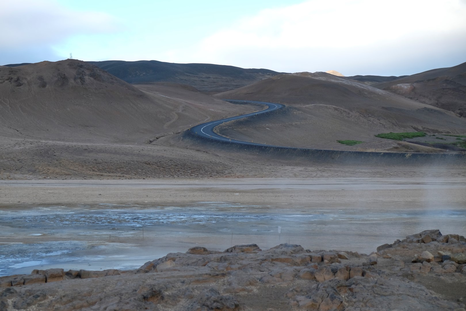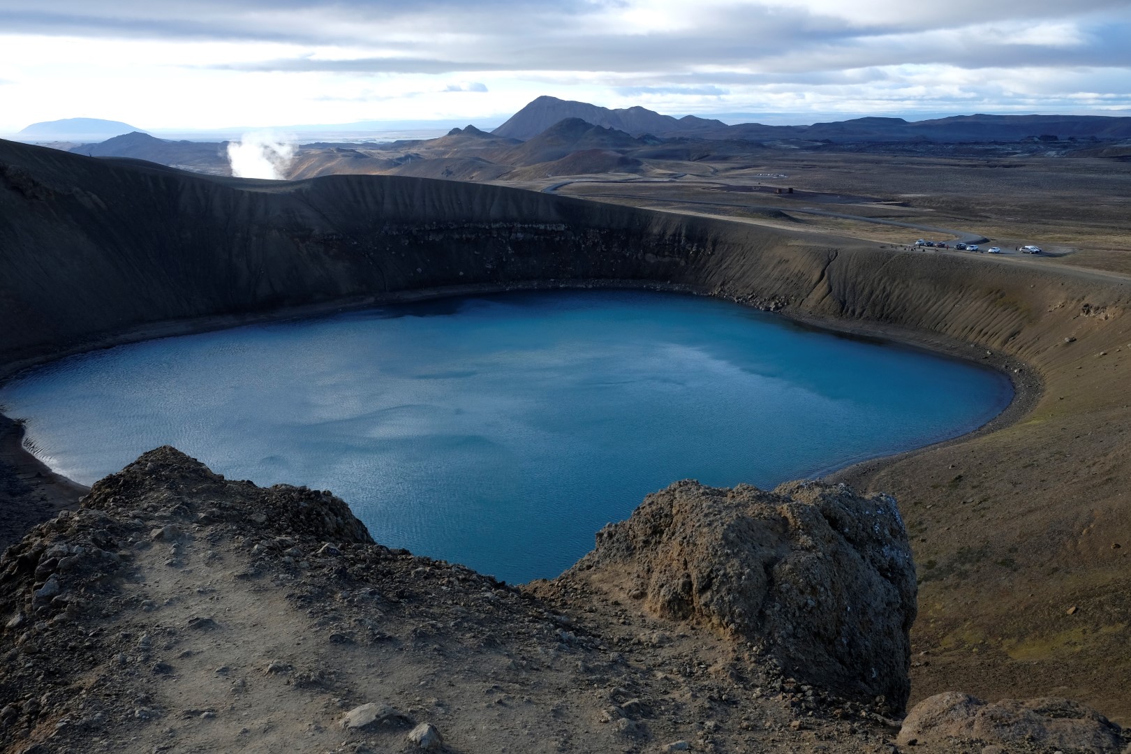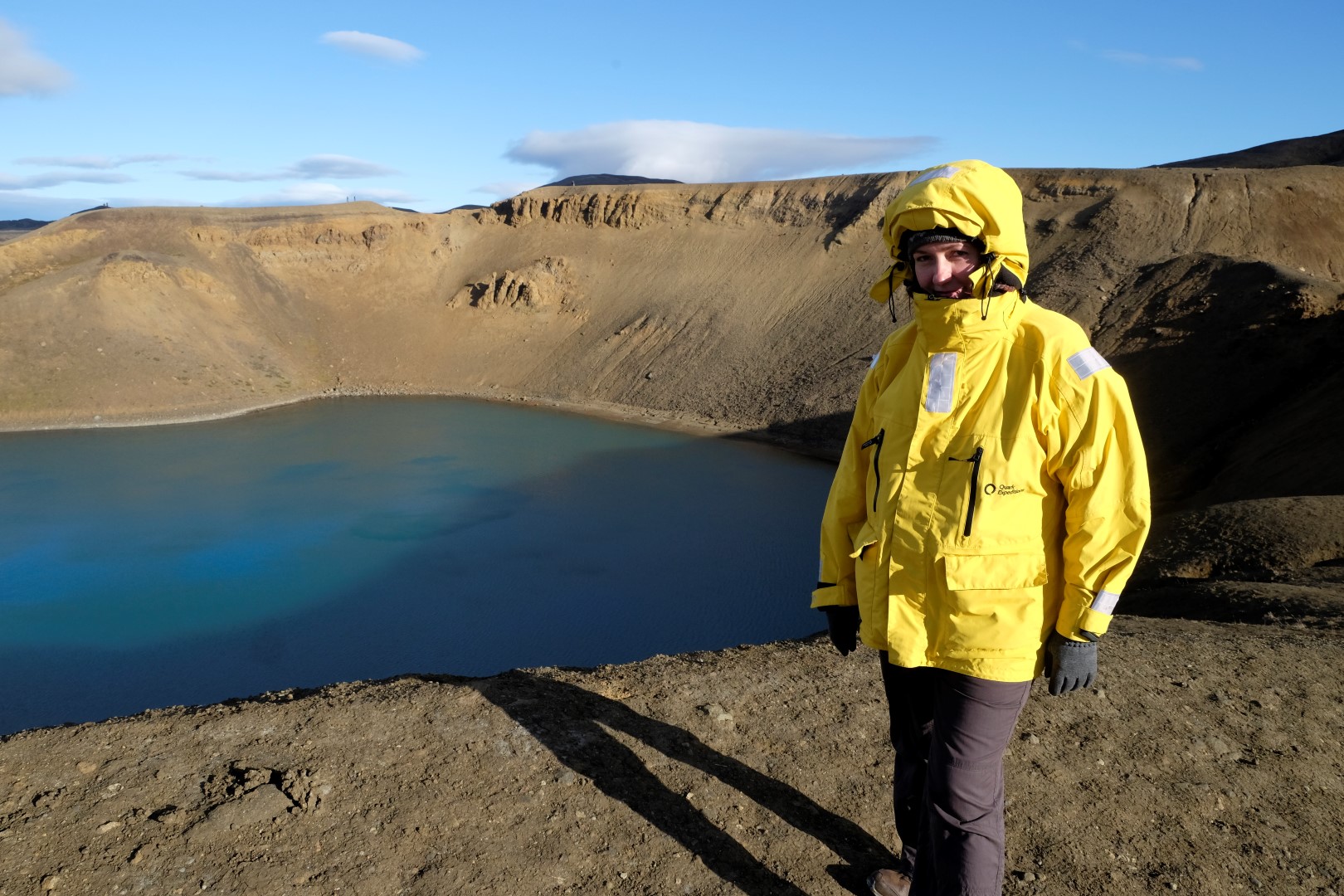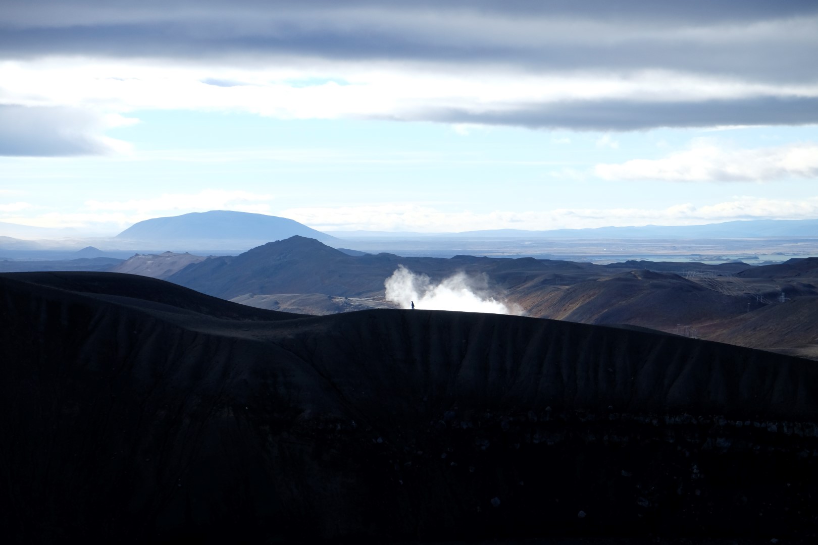 Izrādās, ka šis vējš ir tāds nieks vien, salīdzinoši ar to, kas lēkšo ap Krafla vulkāna krāteri. Dunkans šoreiz nolemj izlaist kāpienu, bet es ātrā riksī apcilpoju vulkāna krātera augšu. Vairākās vietās ir nopietni jāpiesargājas, lai spējš vēja pūtiens nenogāztu uz deguna zilajā ūdens pleķī. Apkārt centrālajam krāterim ir mazāki vulkāni, kas joprojām laiž gaisā smirdīgus sēra purkšķus. Īpaši “smaržīga” pastaiga ir pie netālajiem geizeriem, bet tur mēs uzkavējamies pavisam īsu brīdi, jo abi ar Dunkanu esam gana daudz tos redzējuši citās pasaules malās.