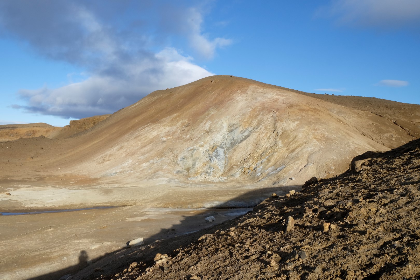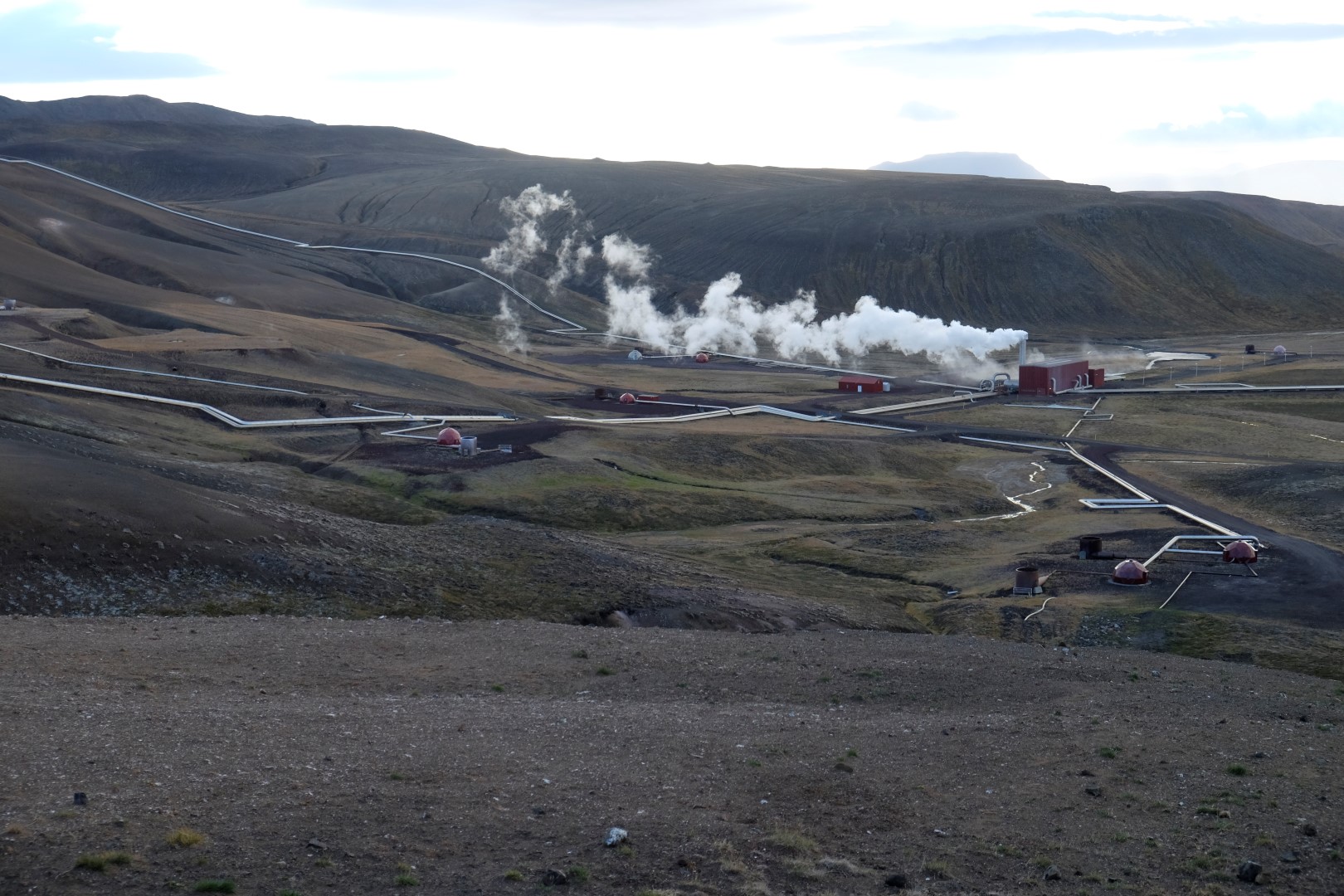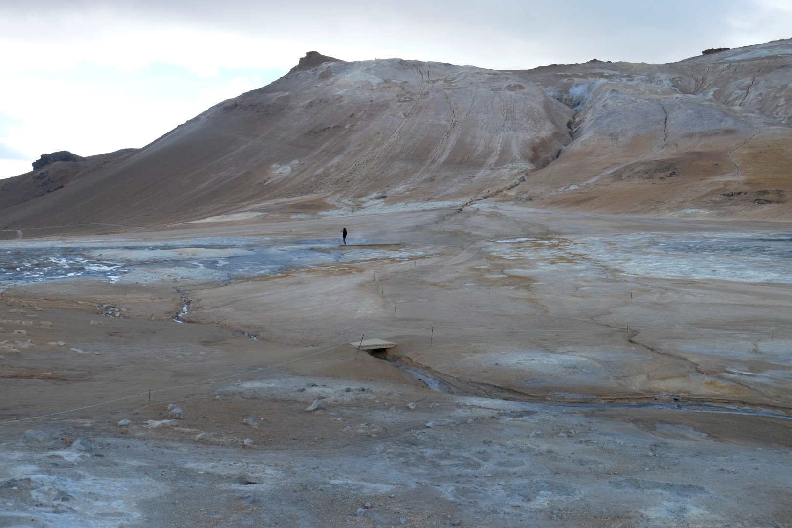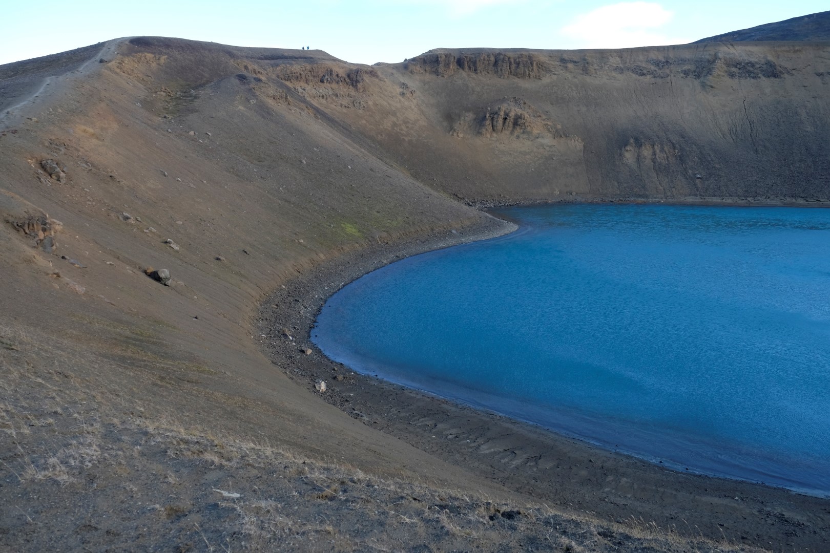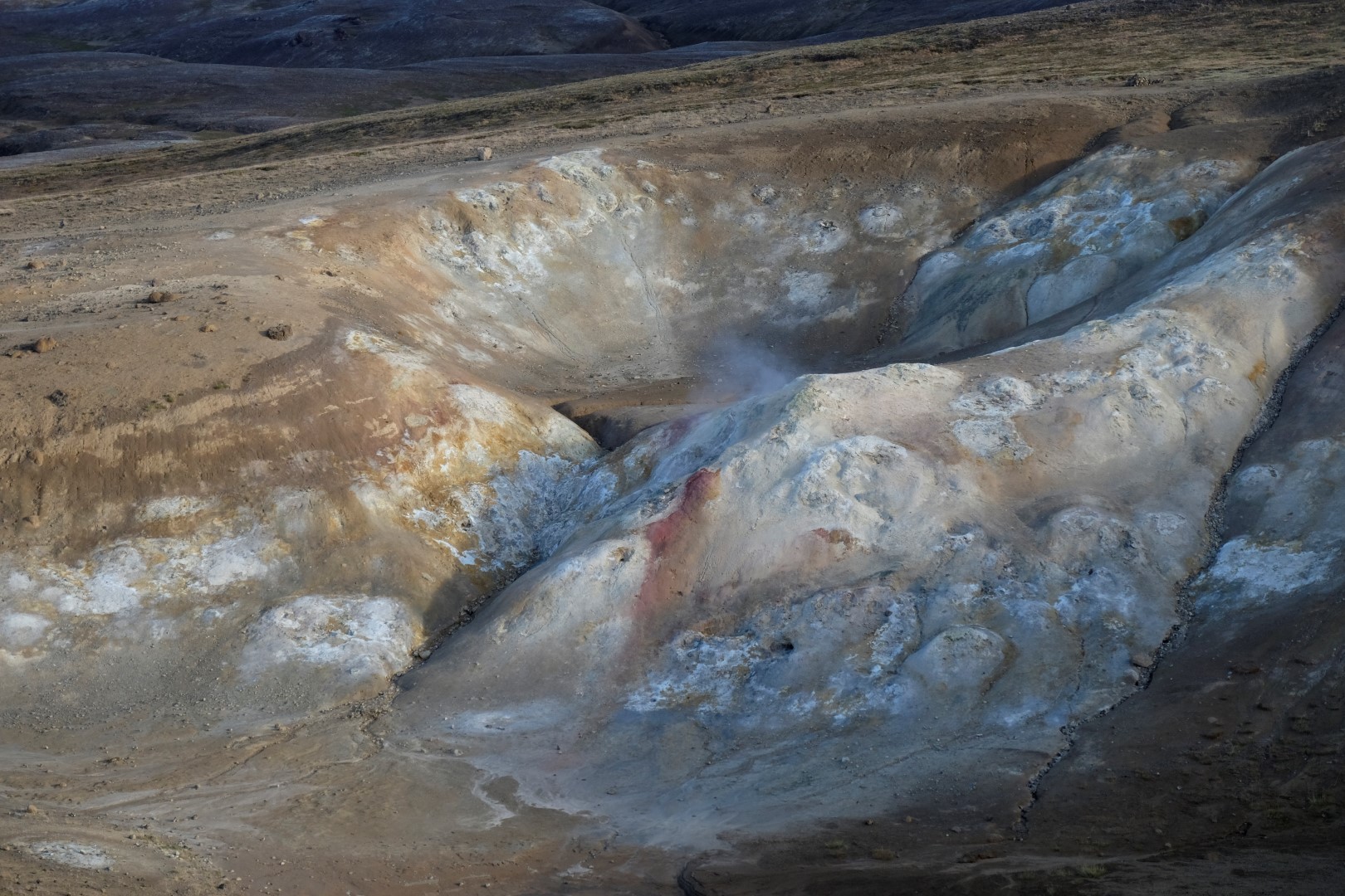 Izrādās, ka šis vējš ir tāds nieks vien, salīdzinoši ar to, kas lēkšo ap Krafla vulkāna krāteri. Dunkans šoreiz nolemj izlaist kāpienu, bet es ātrā riksī apcilpoju vulkāna krātera augšu. Vairākās vietās ir nopietni jāpiesargājas, lai spējš vēja pūtiens nenogāztu uz deguna zilajā ūdens pleķī. Apkārt centrālajam krāterim ir mazāki vulkāni, kas joprojām laiž gaisā smirdīgus sēra purkšķus. Īpaši “smaržīga” pastaiga ir pie netālajiem geizeriem, bet tur mēs uzkavējamies pavisam īsu brīdi, jo abi ar Dunkanu esam gana daudz tos redzējuši citās pasaules malās.