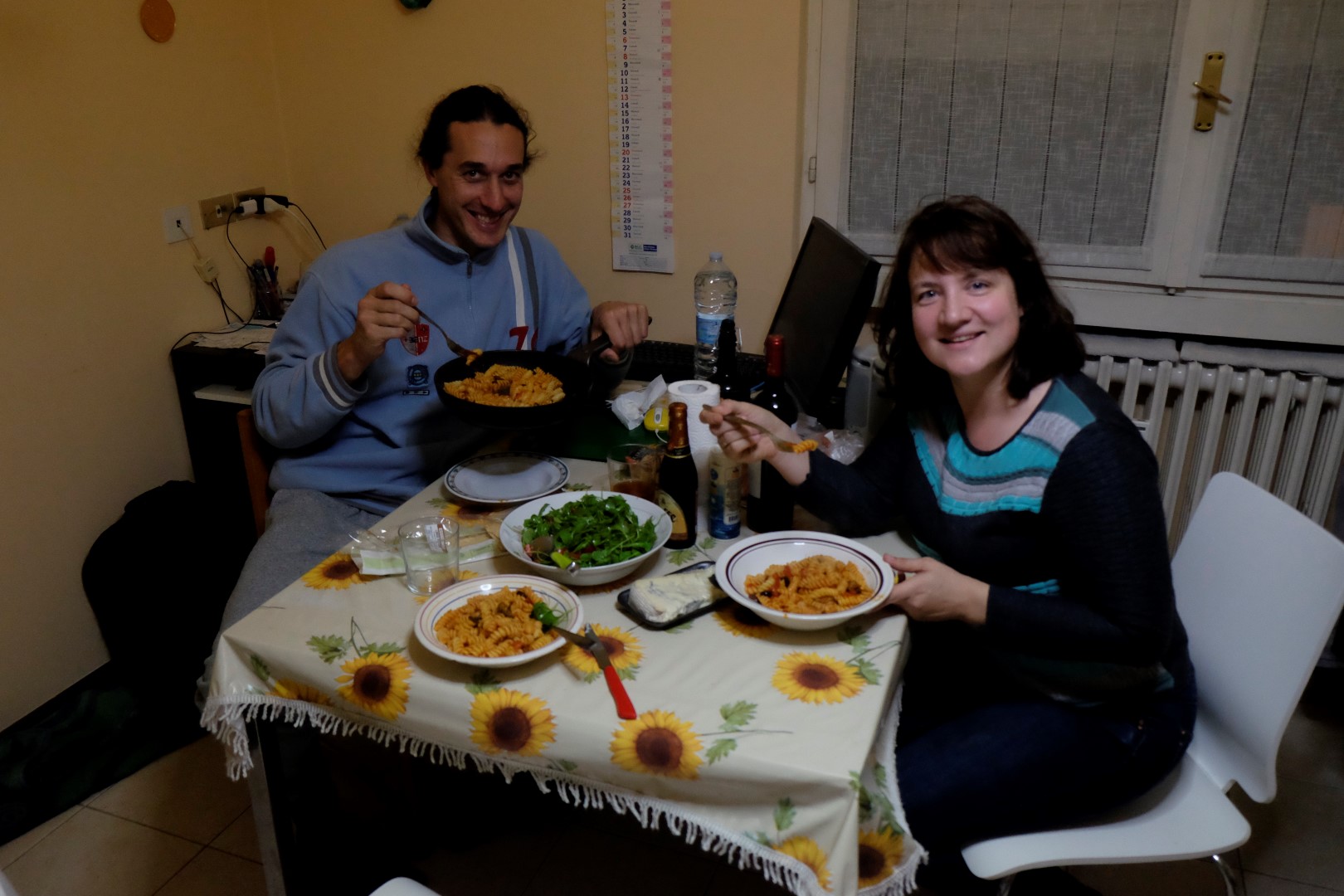 Pēc dažām minūtēm pieripo arī mūsu namatēvs Kriss un varam atviegloti uzelpot. Krisa dzīvoklītis ir neliels, bet gana mīlīgs. Apvienojam mūsu iepirkto proviantu ar Krisa ledusskapja saturu, un sanāk labu labās vakariņas – pasta ar salātiem un mērci. Brīdi patērzējam, tad pievēršamies katrs saviem vakara darbiem – man, protams, jāpabeidz šis ieraksts, lai rīt var sākt jaunu, skaistu dienu. Te nu tas ir – arlabunakti jums un mums!