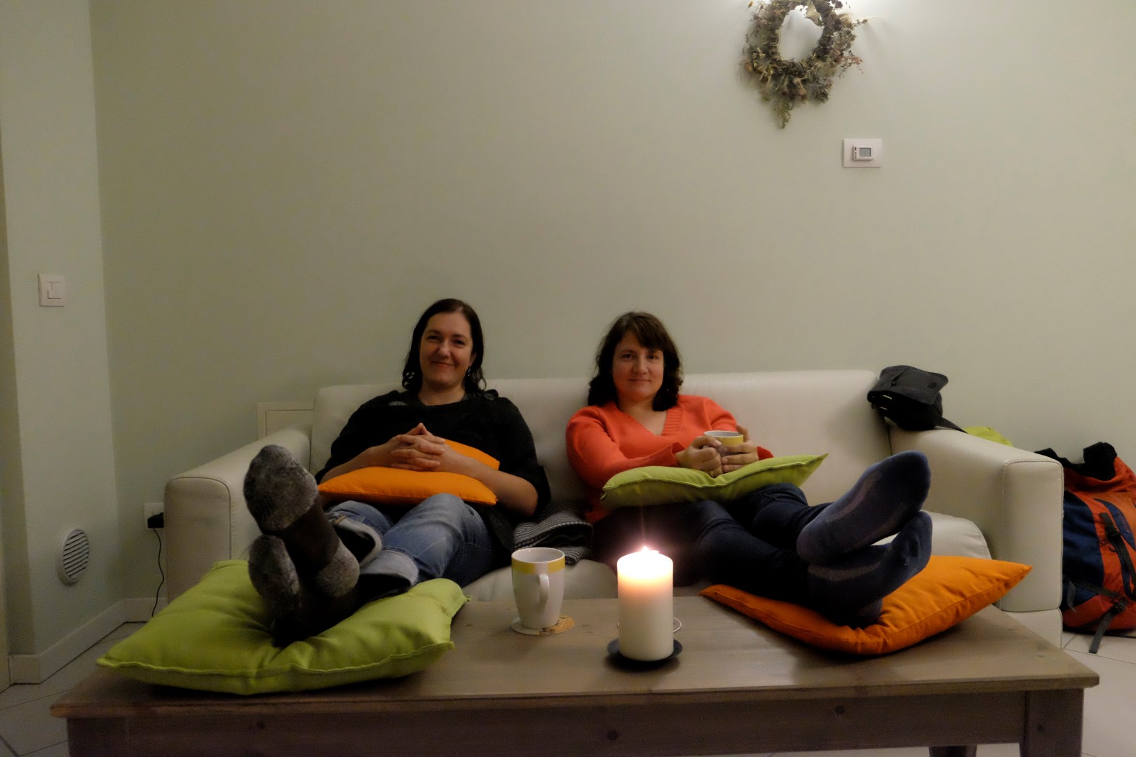 Pēc vakariņām kādu brīdi tērzējam četratā, tad Dāvids dodas pie miera un varam turpināt meiteņu sarunas latviešu valodā. Vakara gaitā pazūd zināms vīna tilpums, tiek izcepti šokolādes mafini un izdziedāts kārtīgs latviešu dziesmu repertuārs. Īsāk sakot – šis vakars ir viens trekns punkts uz “i” mūsu Itālijai.