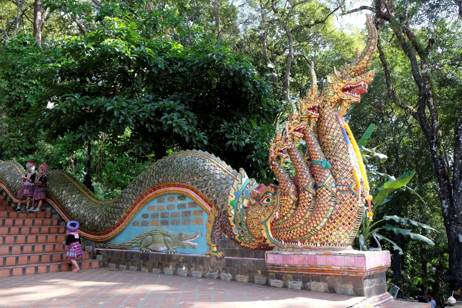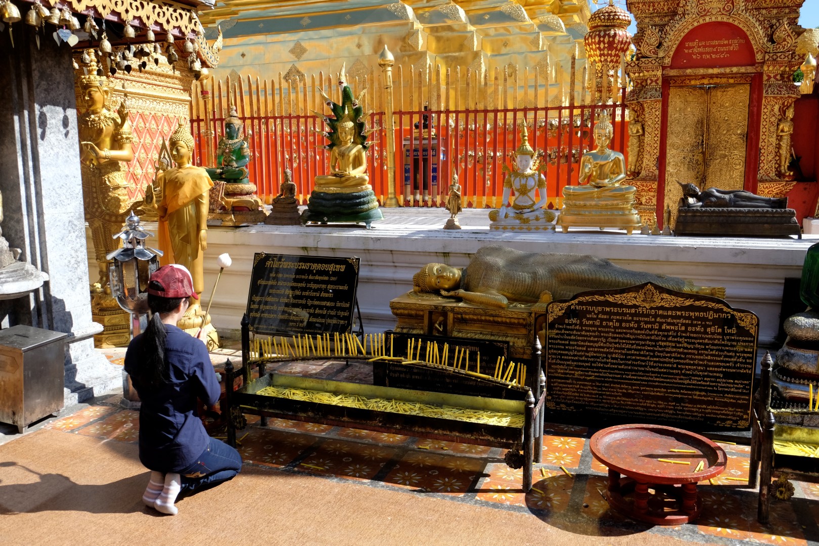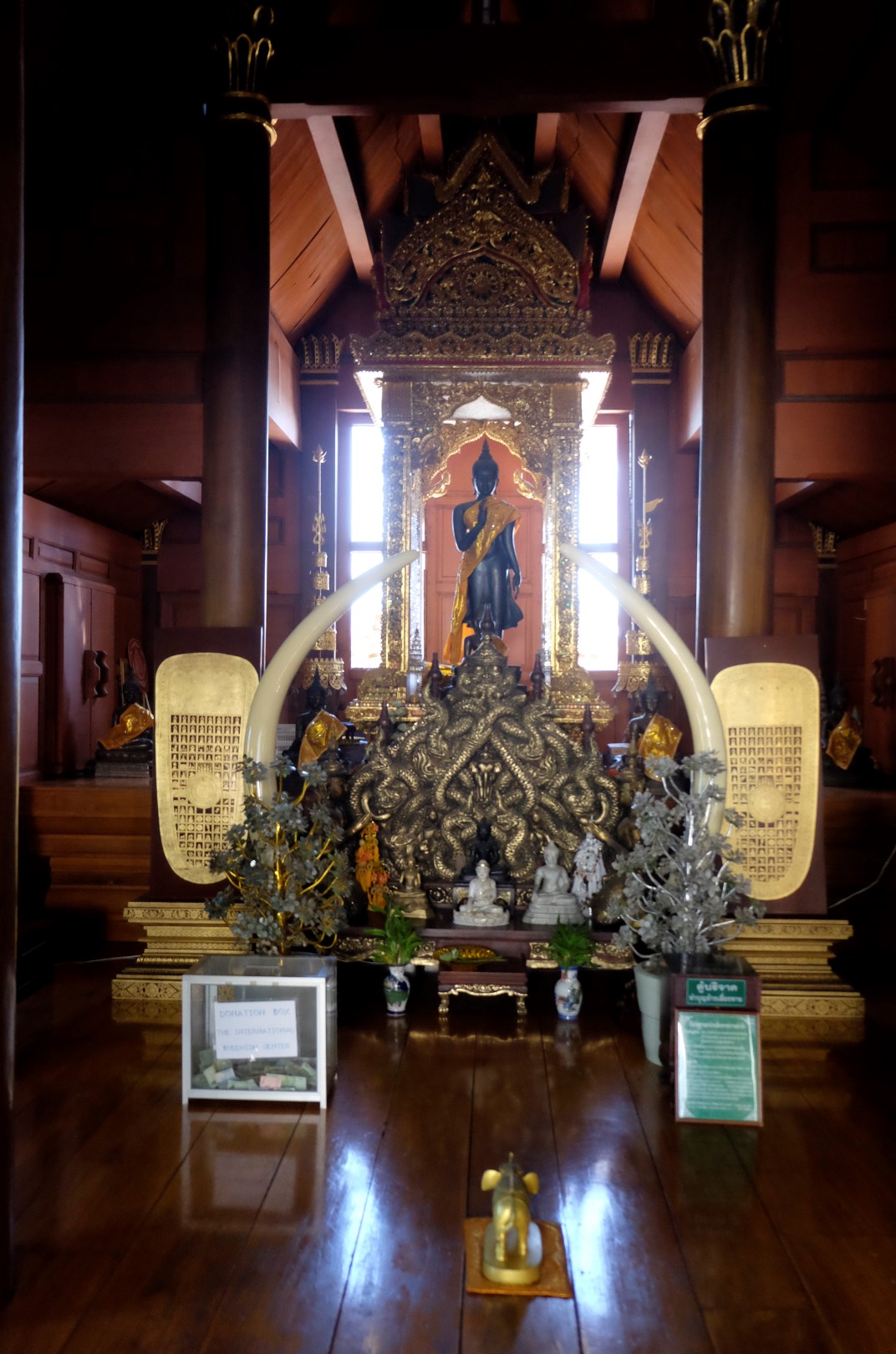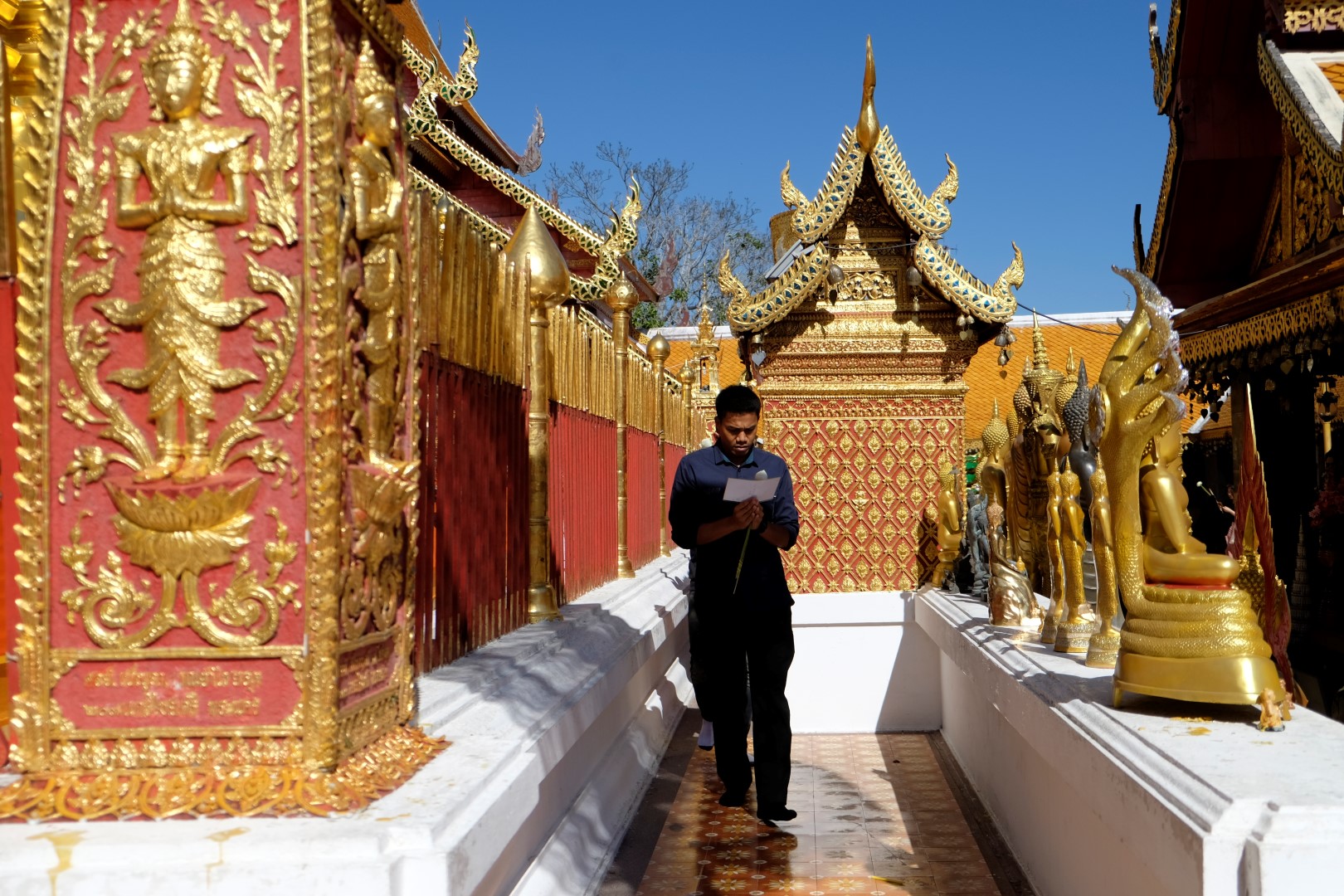 Nonākot galā, jākāpj pa trepēm, kuru malās vijas pūķu muguras – galvas lejā, astes augšā. Pie trepēm tusē mazas, reģiona tautastērpos sapucētas meitenītes, kas angļu valodā priecīgi skandē “foto – money”. Ieejot pašā templī, acis apžilbst vārda tiešajā nozīmē – tik daudz apzeltītu ēku un priekšmetu vienkopus sen neesmu redzējusi. Vietējie un tūristi stāv rindā pie mūka, kas par zināmu atlīdzību uzšļaksta slapju svētību un tad apsien ap roku baltu striķi. Vietējie vēl staigā ap tempļa vidus daļu ar lapiņu un baltu lotosa ziedu rokās, tad dedzina sveces un lūdzas.