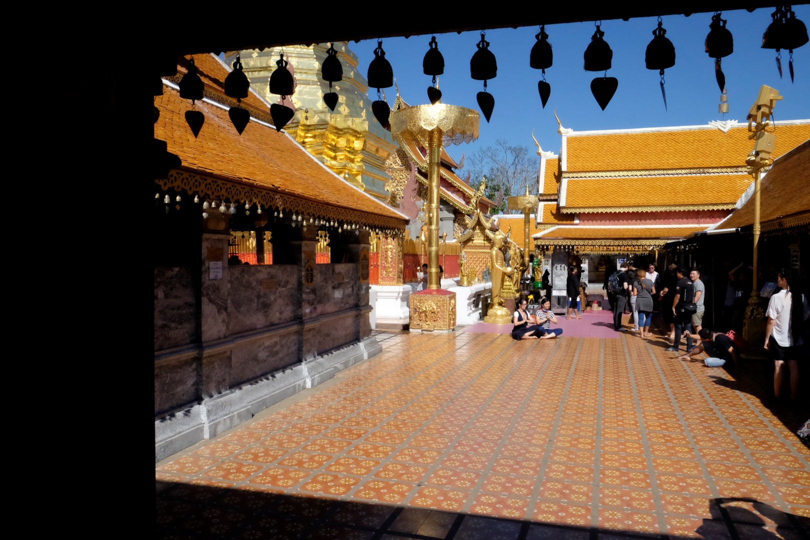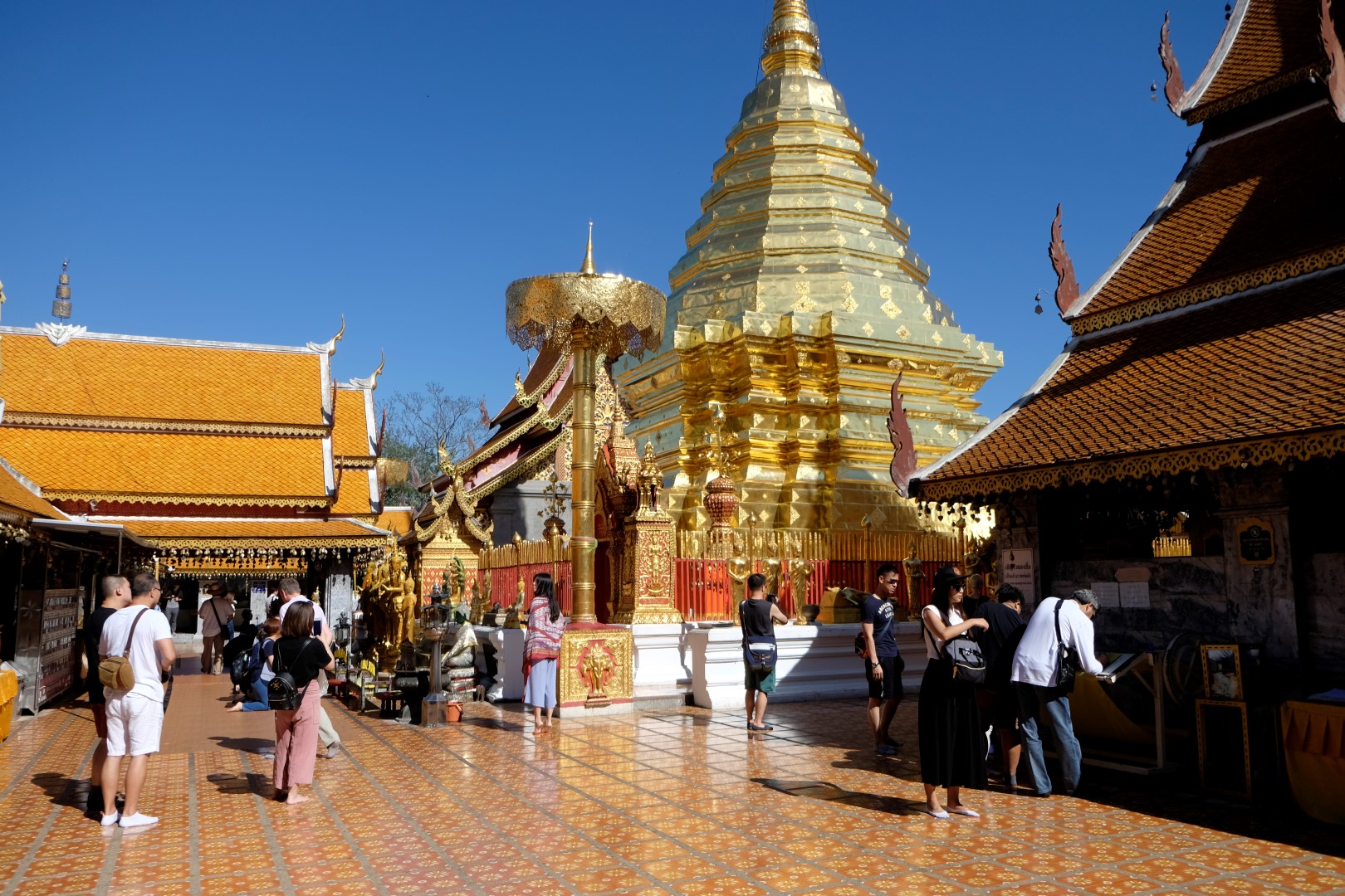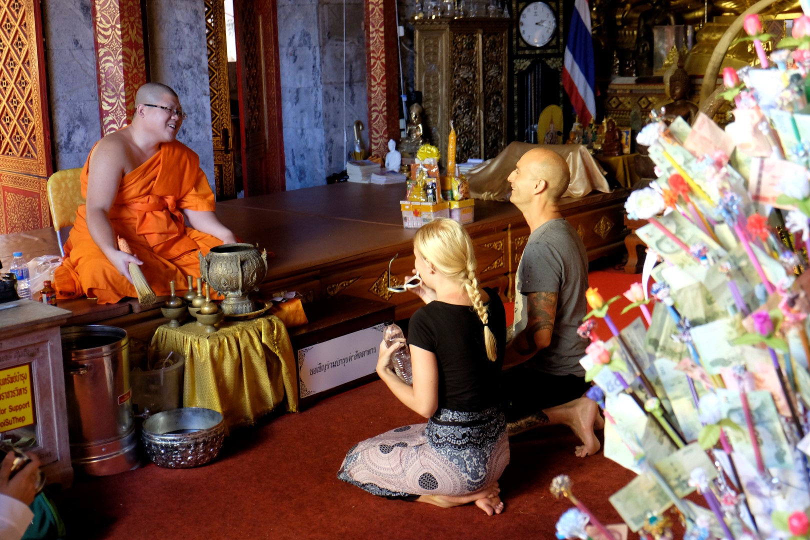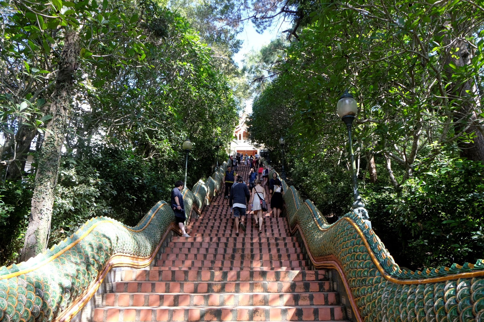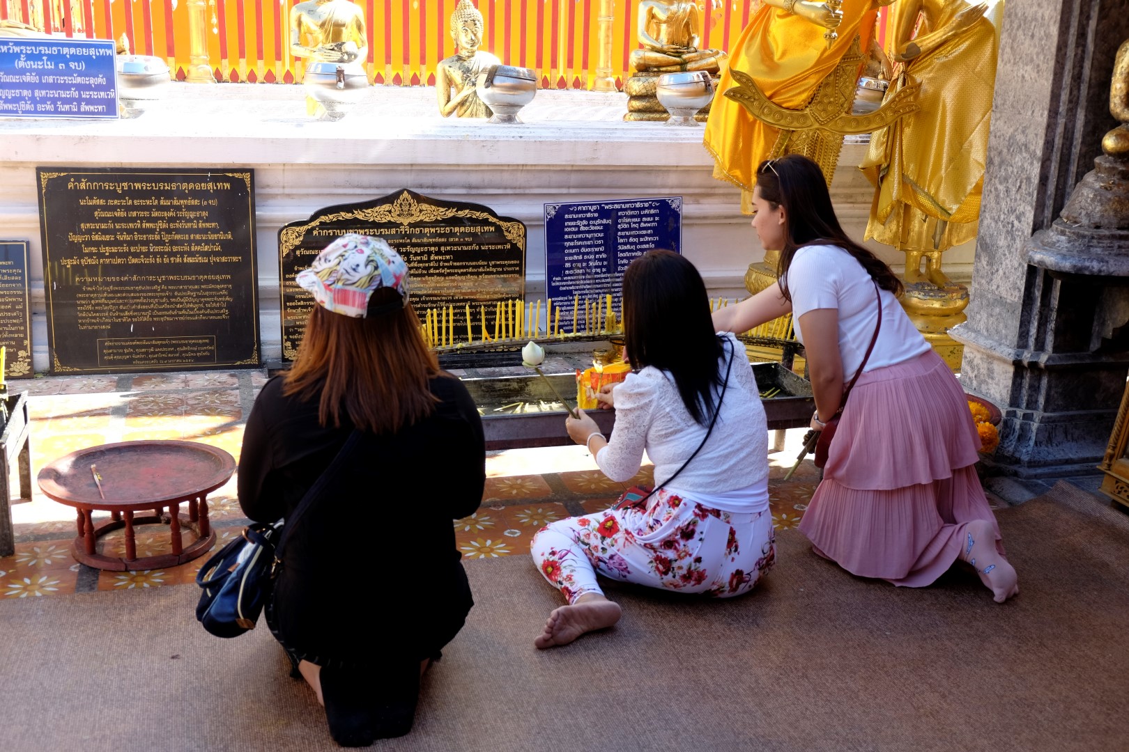 Nonākot galā, jākāpj pa trepēm, kuru malās vijas pūķu muguras – galvas lejā, astes augšā. Pie trepēm tusē mazas, reģiona tautastērpos sapucētas meitenītes, kas angļu valodā priecīgi skandē “foto – money”. Ieejot pašā templī, acis apžilbst vārda tiešajā nozīmē – tik daudz apzeltītu ēku un priekšmetu vienkopus sen neesmu redzējusi. Vietējie un tūristi stāv rindā pie mūka, kas par zināmu atlīdzību uzšļaksta slapju svētību un tad apsien ap roku baltu striķi. Vietējie vēl staigā ap tempļa vidus daļu ar lapiņu un baltu lotosa ziedu rokās, tad dedzina sveces un lūdzas.