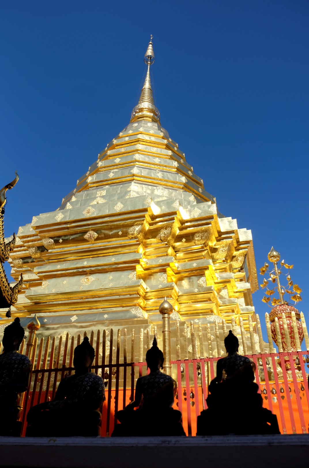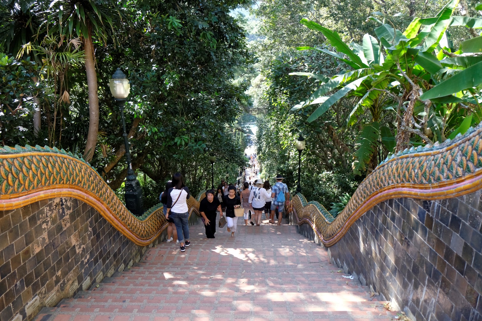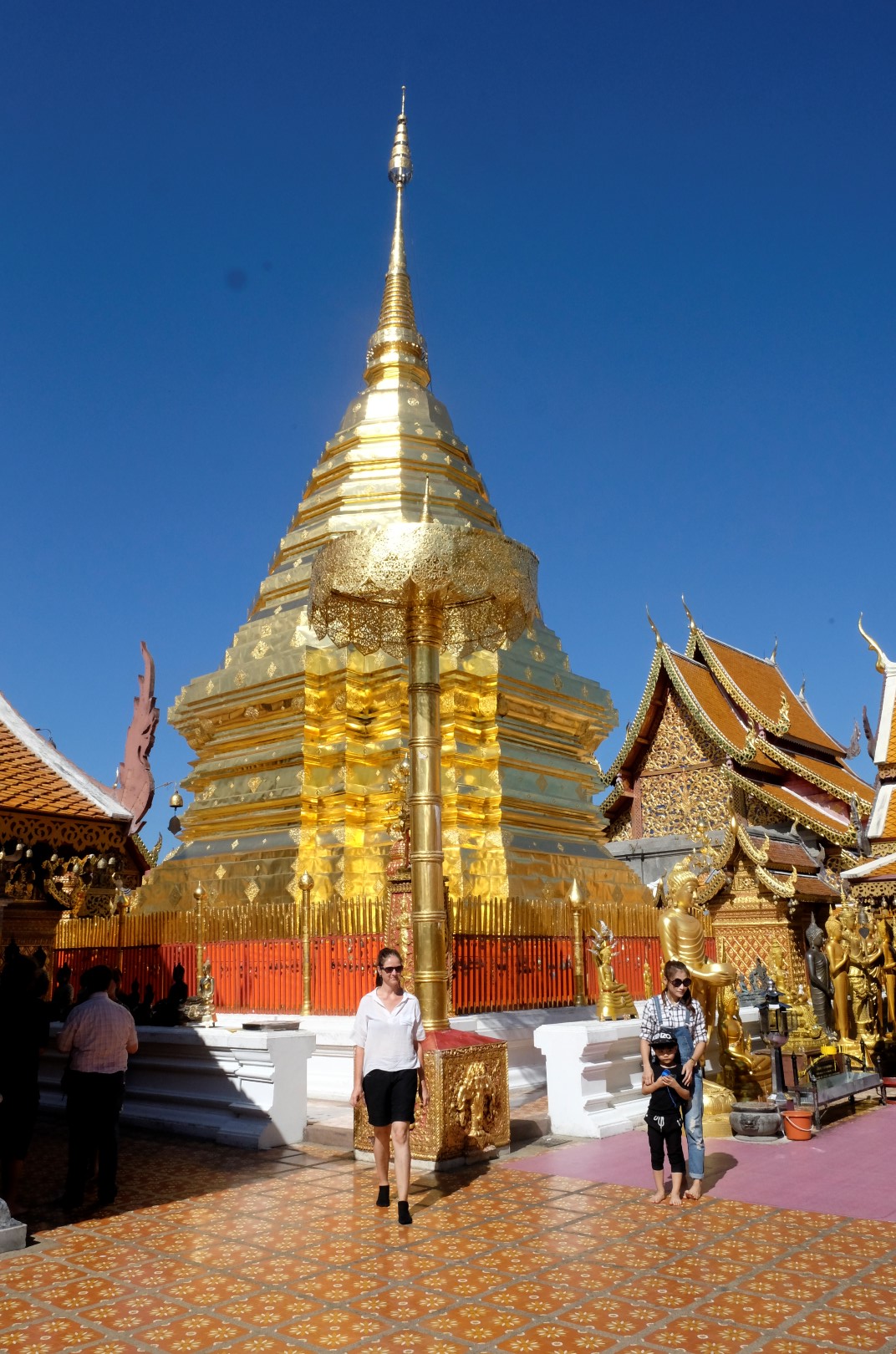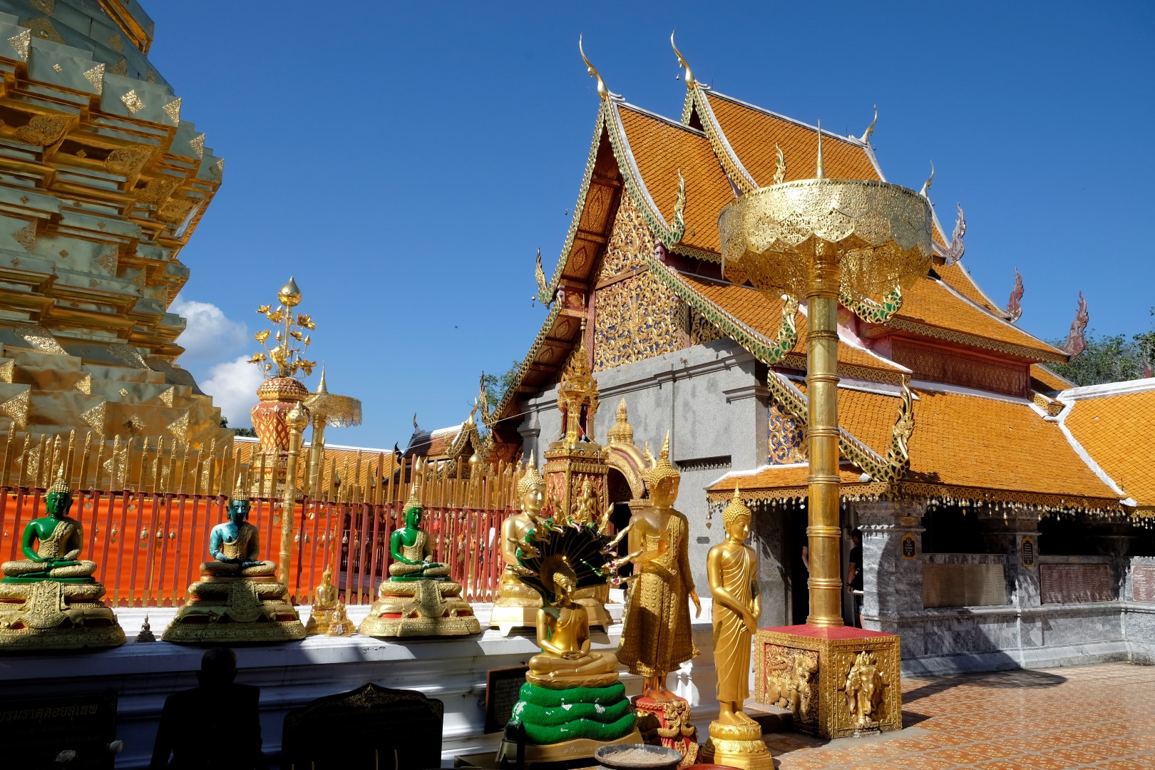Nonākot galā, jākāpj pa trepēm, kuru malās vijas pūķu muguras – galvas lejā, astes augšā. Pie trepēm tusē mazas, reģiona tautastērpos sapucētas meitenītes, kas angļu valodā priecīgi skandē “foto – money”. Ieejot pašā templī, acis apžilbst vārda tiešajā nozīmē – tik daudz apzeltītu ēku un priekšmetu vienkopus sen neesmu redzējusi. Vietējie un tūristi stāv rindā pie mūka, kas par zināmu atlīdzību uzšļaksta slapju svētību un tad apsien ap roku baltu striķi. Vietējie vēl staigā ap tempļa vidus daļu ar lapiņu un baltu lotosa ziedu rokās, tad dedzina sveces un lūdzas.