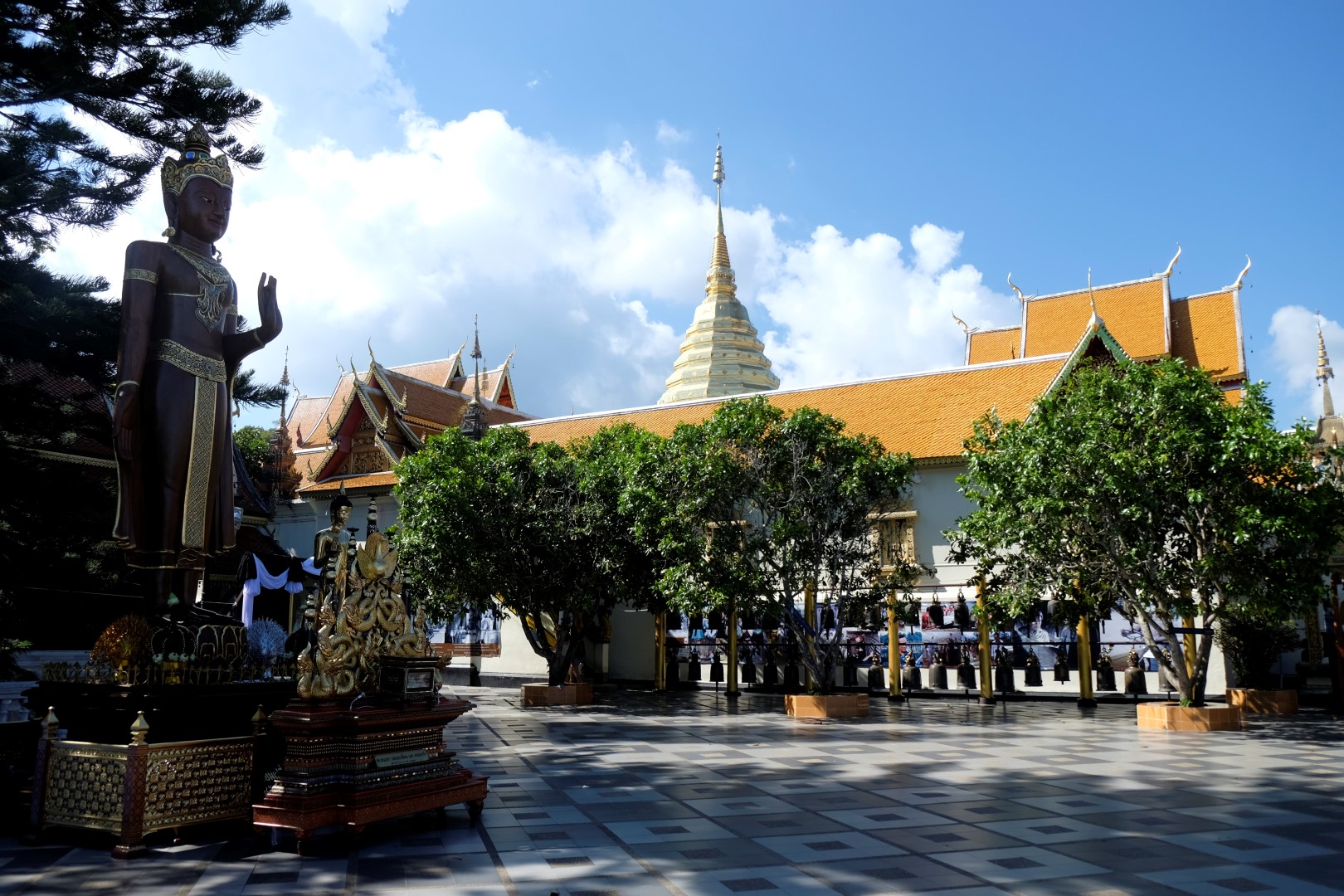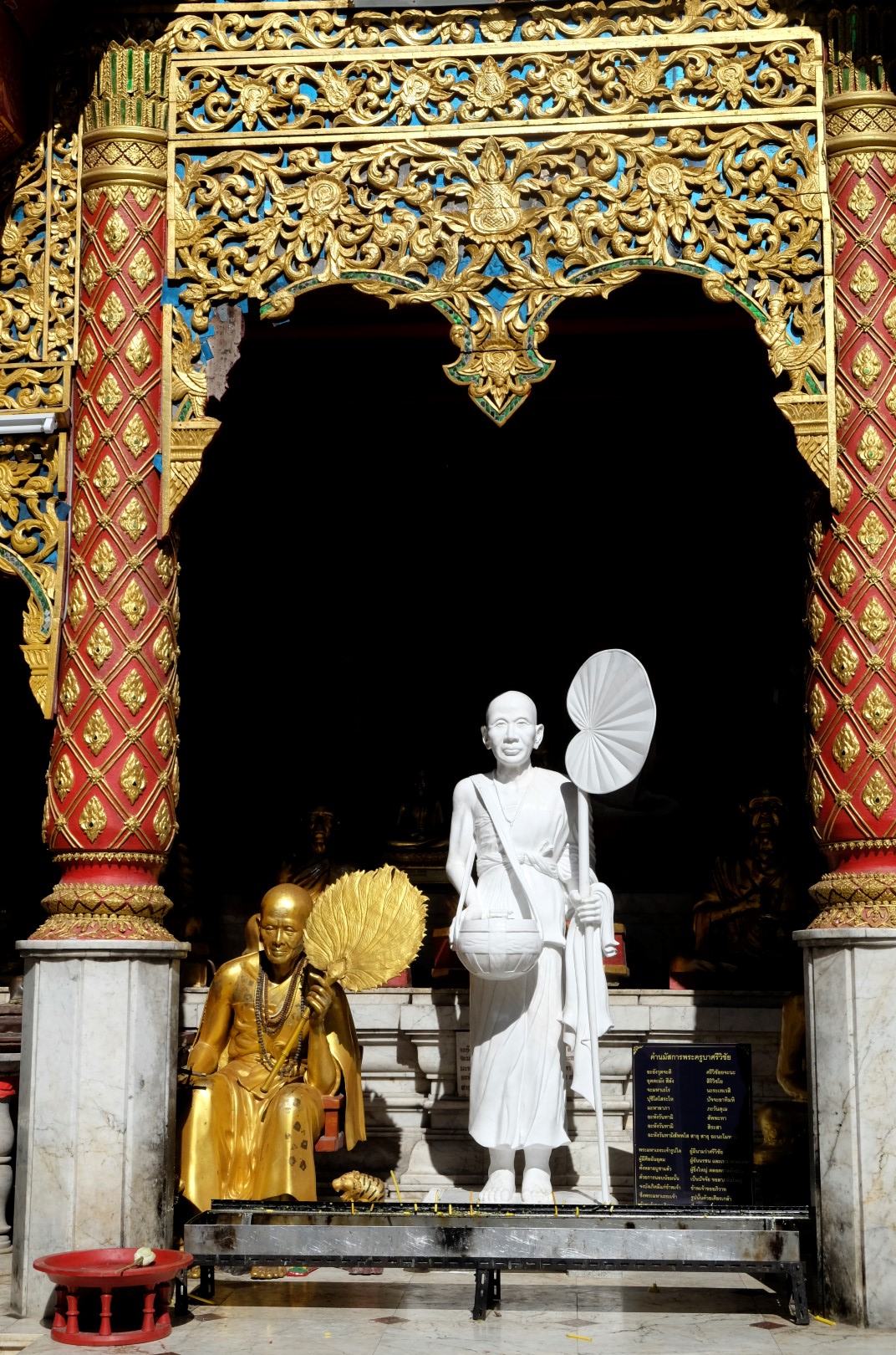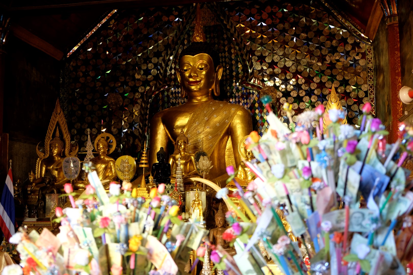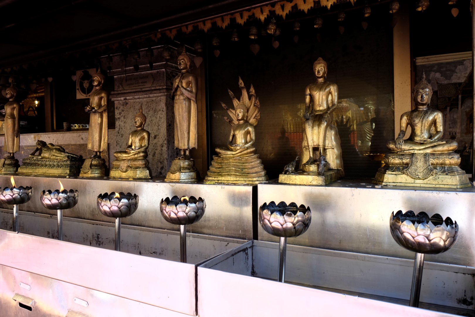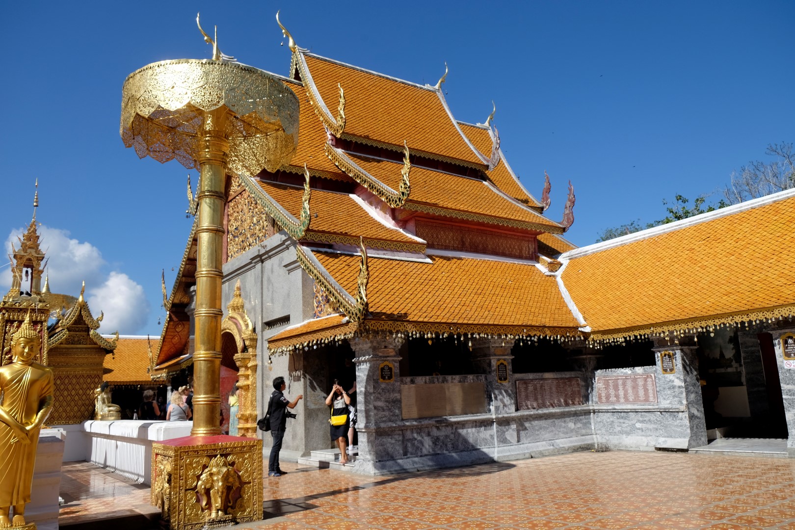 Nonākot galā, jākāpj pa trepēm, kuru malās vijas pūķu muguras – galvas lejā, astes augšā. Pie trepēm tusē mazas, reģiona tautastērpos sapucētas meitenītes, kas angļu valodā priecīgi skandē “foto – money”. Ieejot pašā templī, acis apžilbst vārda tiešajā nozīmē – tik daudz apzeltītu ēku un priekšmetu vienkopus sen neesmu redzējusi. Vietējie un tūristi stāv rindā pie mūka, kas par zināmu atlīdzību uzšļaksta slapju svētību un tad apsien ap roku baltu striķi. Vietējie vēl staigā ap tempļa vidus daļu ar lapiņu un baltu lotosa ziedu rokās, tad dedzina sveces un lūdzas.