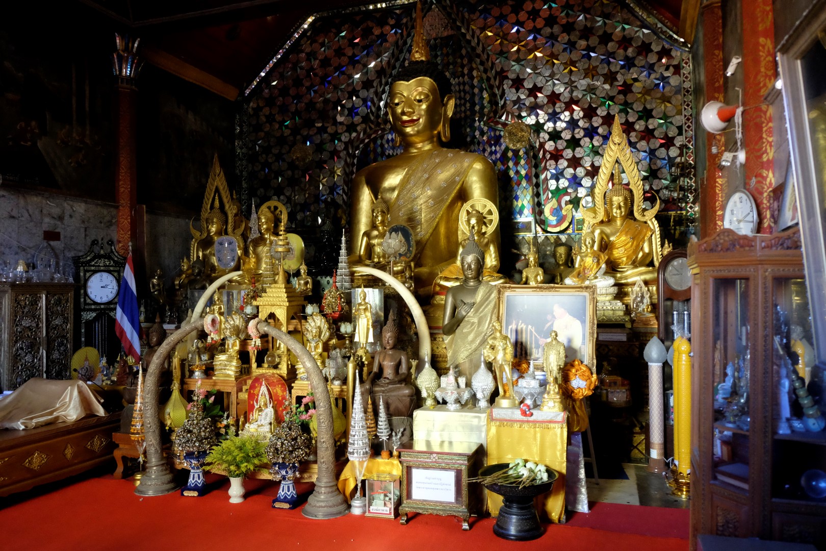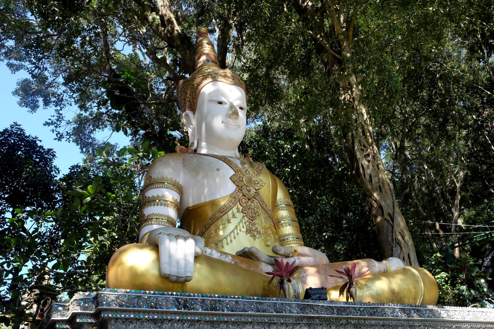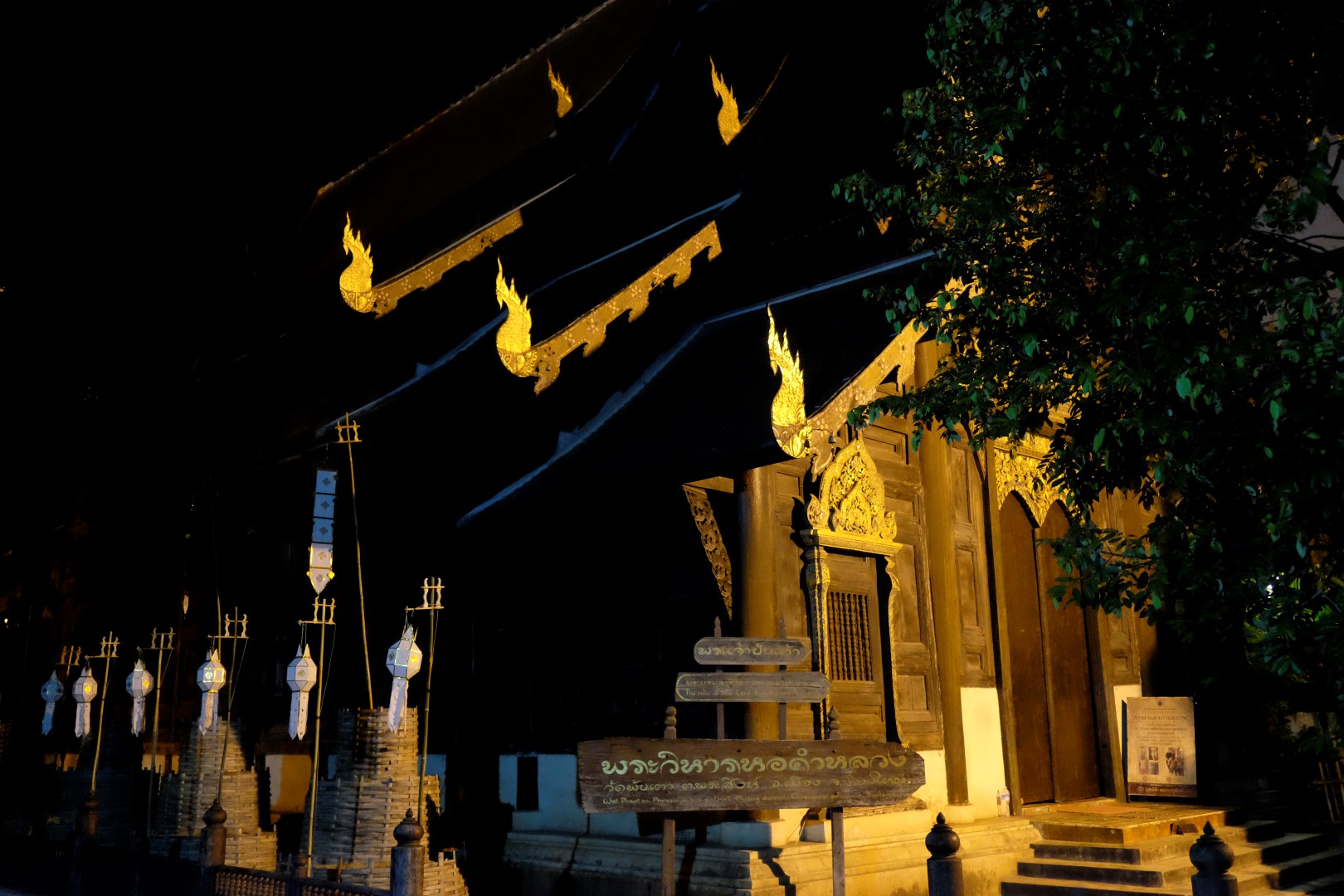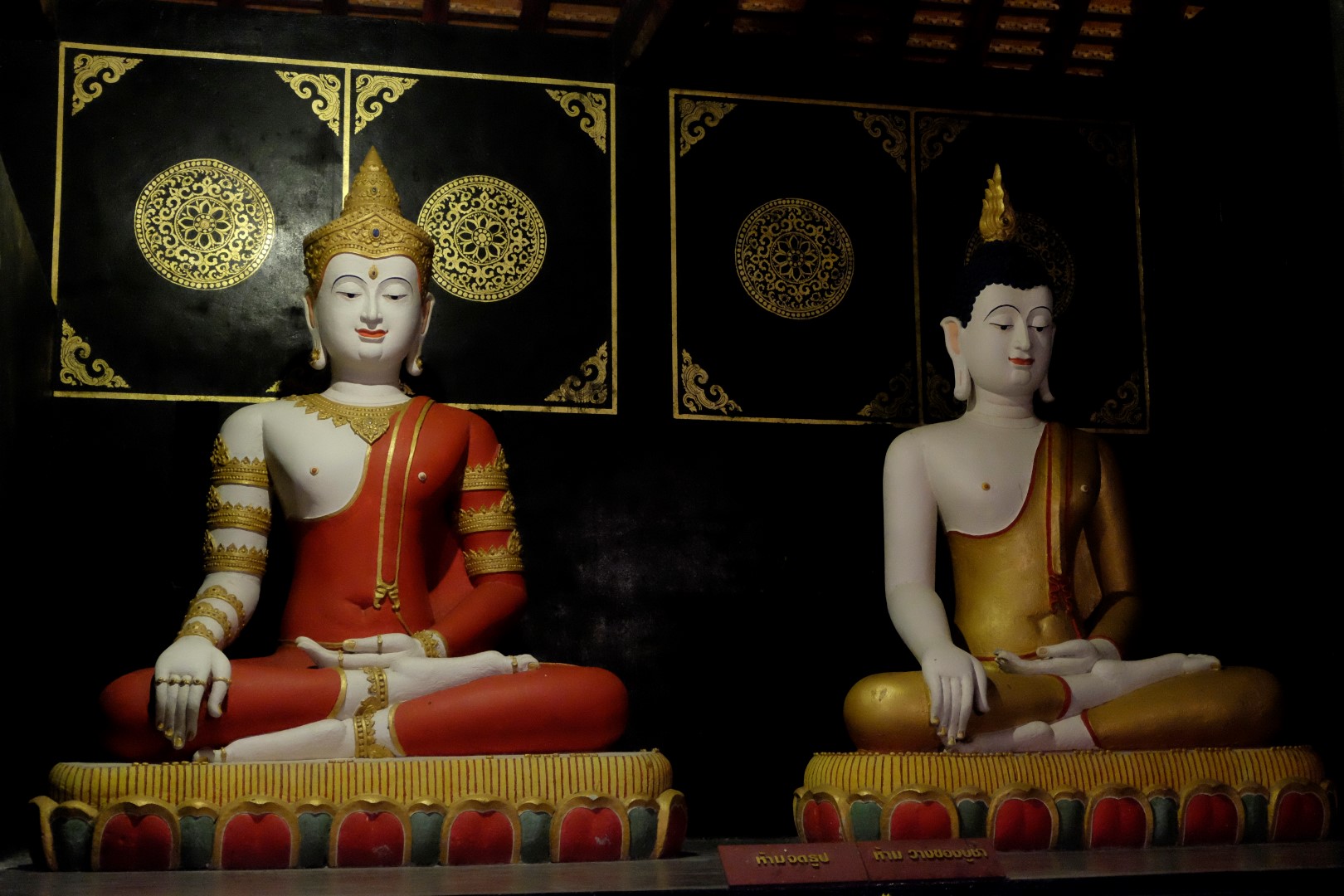 Nonākot galā, jākāpj pa trepēm, kuru malās vijas pūķu muguras – galvas lejā, astes augšā. Pie trepēm tusē mazas, reģiona tautastērpos sapucētas meitenītes, kas angļu valodā priecīgi skandē “foto – money”. Ieejot pašā templī, acis apžilbst vārda tiešajā nozīmē – tik daudz apzeltītu ēku un priekšmetu vienkopus sen neesmu redzējusi. Vietējie un tūristi stāv rindā pie mūka, kas par zināmu atlīdzību uzšļaksta slapju svētību un tad apsien ap roku baltu striķi. Vietējie vēl staigā ap tempļa vidus daļu ar lapiņu un baltu lotosa ziedu rokās, tad dedzina sveces un lūdzas.