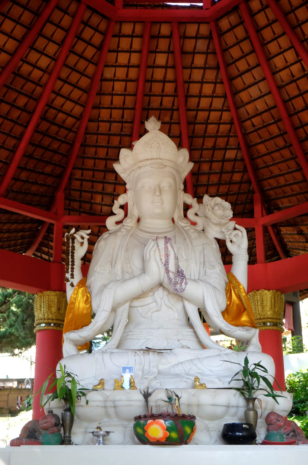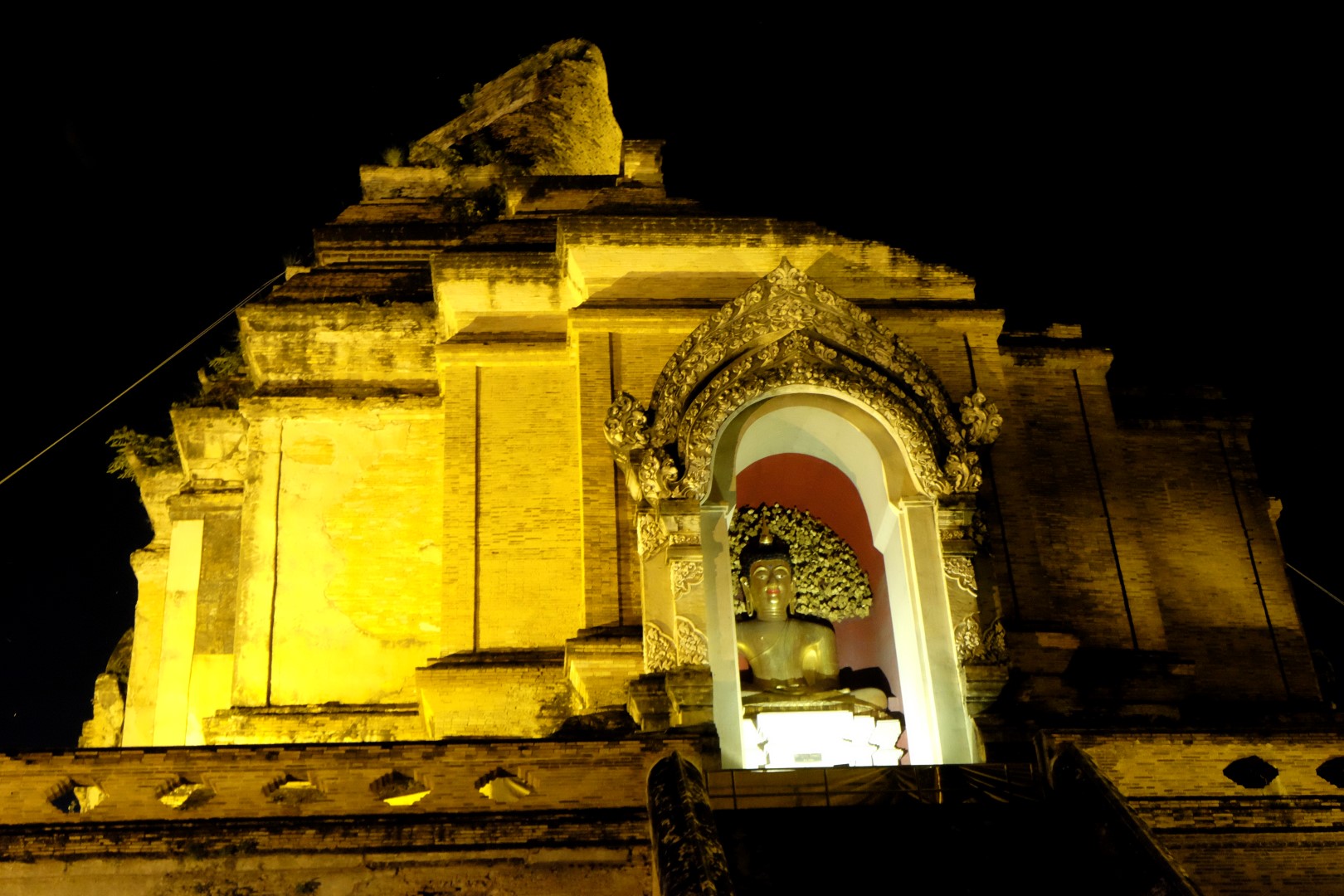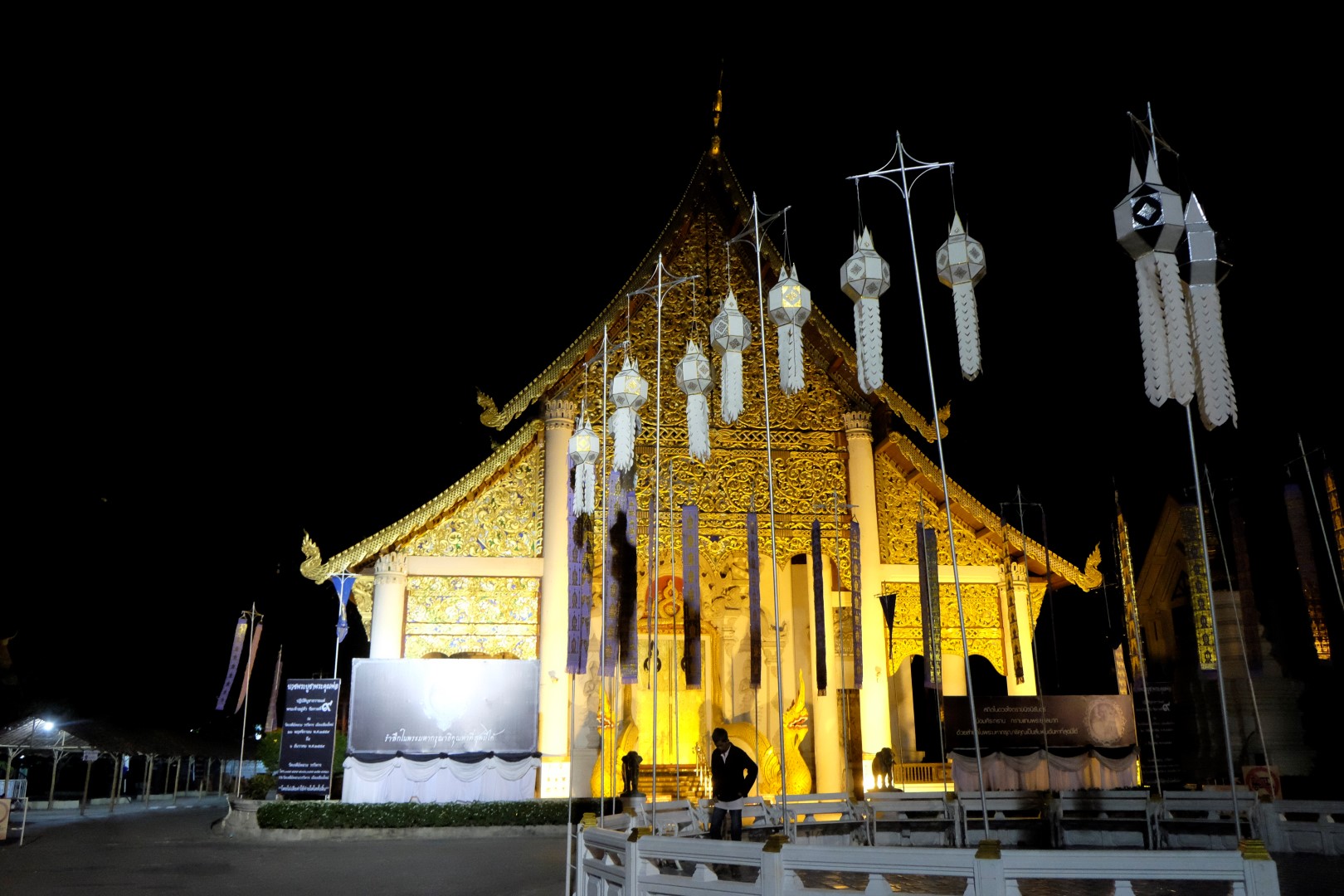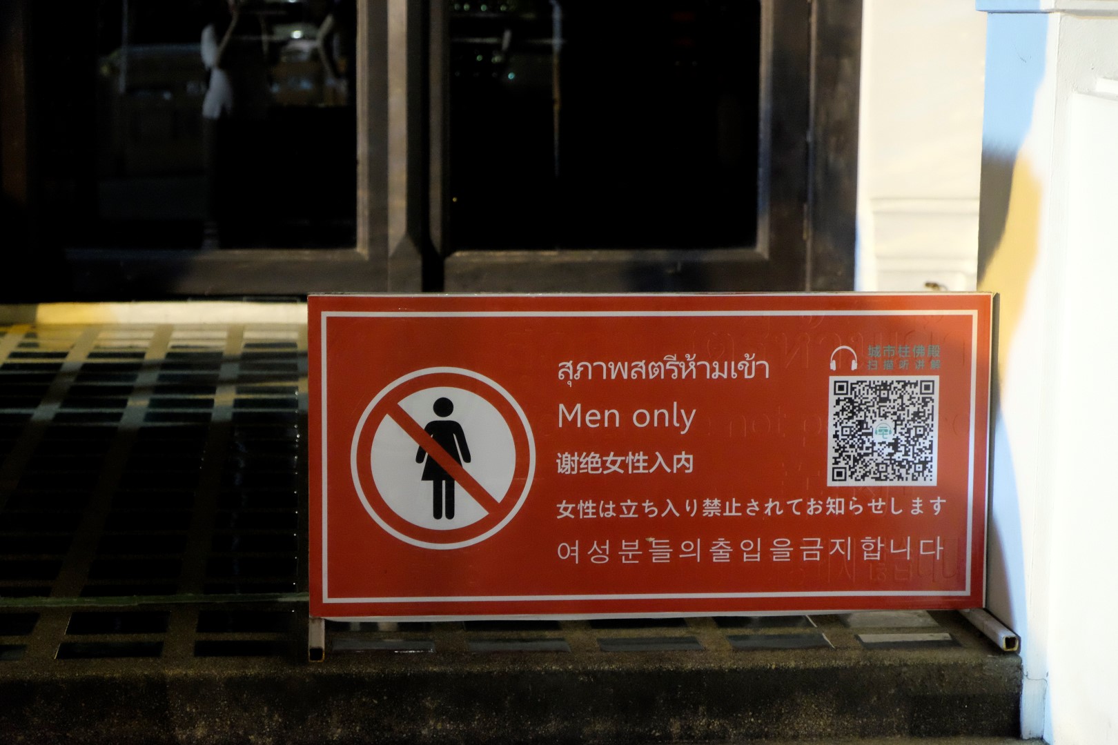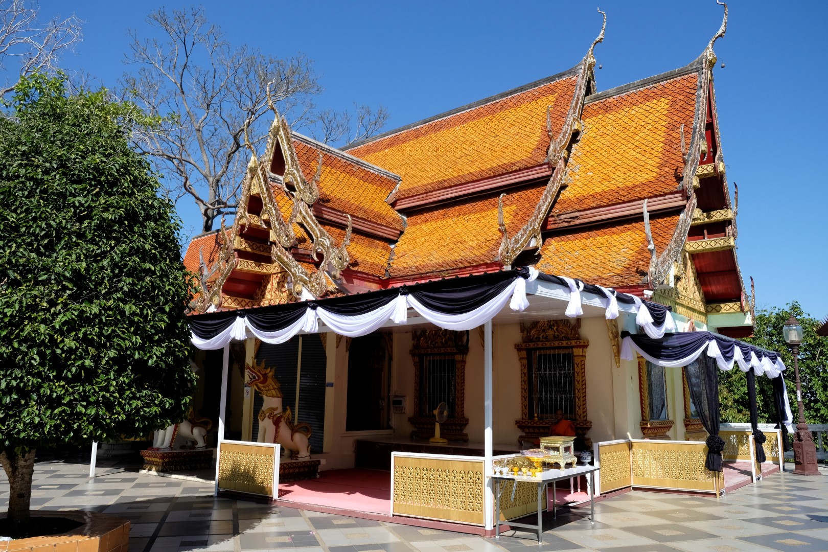Nonākot galā, jākāpj pa trepēm, kuru malās vijas pūķu muguras – galvas lejā, astes augšā. Pie trepēm tusē mazas, reģiona tautastērpos sapucētas meitenītes, kas angļu valodā priecīgi skandē “foto – money”. Ieejot pašā templī, acis apžilbst vārda tiešajā nozīmē – tik daudz apzeltītu ēku un priekšmetu vienkopus sen neesmu redzējusi. Vietējie un tūristi stāv rindā pie mūka, kas par zināmu atlīdzību uzšļaksta slapju svētību un tad apsien ap roku baltu striķi. Vietējie vēl staigā ap tempļa vidus daļu ar lapiņu un baltu lotosa ziedu rokās, tad dedzina sveces un lūdzas.
