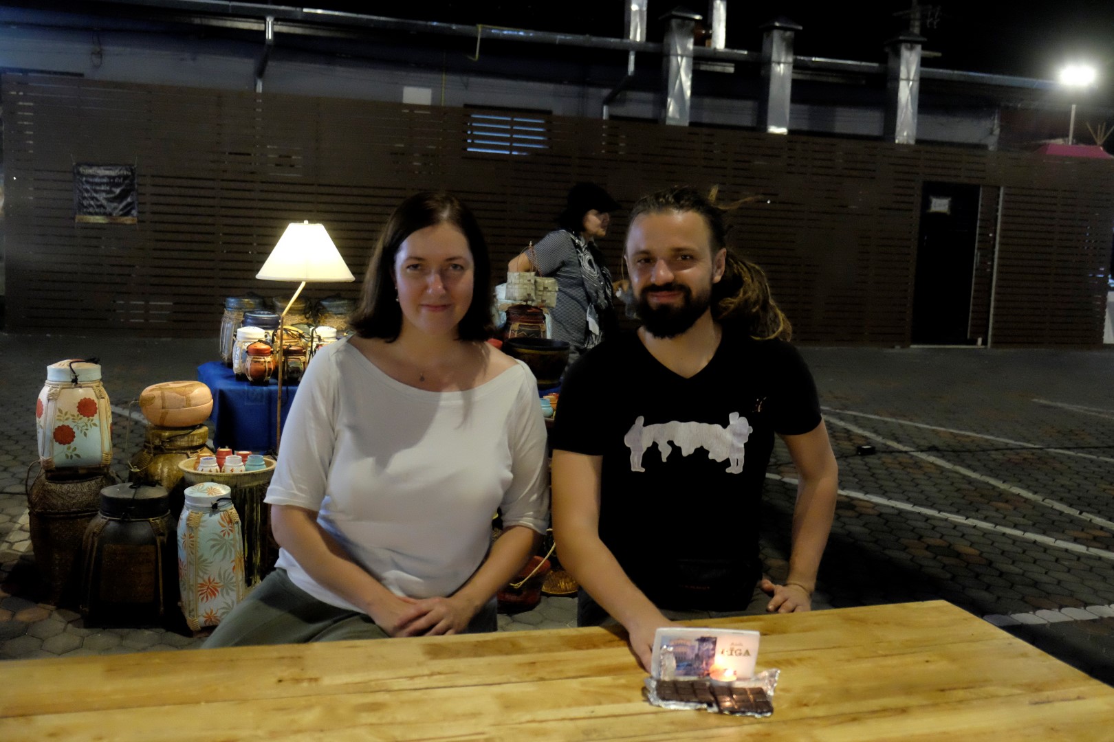 No garīgās dimensijas atgriežamies praktiskajā, ejam turpināt dzimšanas dienas svinības. Man līdzi vēl ir šokolādes tāfelīte no Latvijas, kuru atpogājam nelielā nakts tirdziņā un aizdedzinām sveci – viss, kā pienākas. Sāku lūkoties pēc kāda, kurš varētu mūs nofotografēt ar šo “torti”, kad viens no ielu tirgotājiem pats steidzas palīgā. “Jāpacienā viņš arī ar šokolādi”, ierosina Harijs un, kad dodamies ar cienastu tirgotāja virzienā, ar sev raksturīgo humoriņu piebilst, “ceru, ka viņam nav diabēts vai kaut kas tamlīdzīgs”. Kad piedāvāju šokolādi, izskatās tomēr, ka ir kāds iemesls, kāpēc vīrs šokolādi nevar ēst. Situāciju “glābj” viņa mamma, kas gan labprāt pacienājas. Aizejam atpakaļ pie sava galdiņa, bet pēc brīža atkal pienāk tirgotājs un uzdāvina mums mazu kartupeļu salmiņu paciņu.