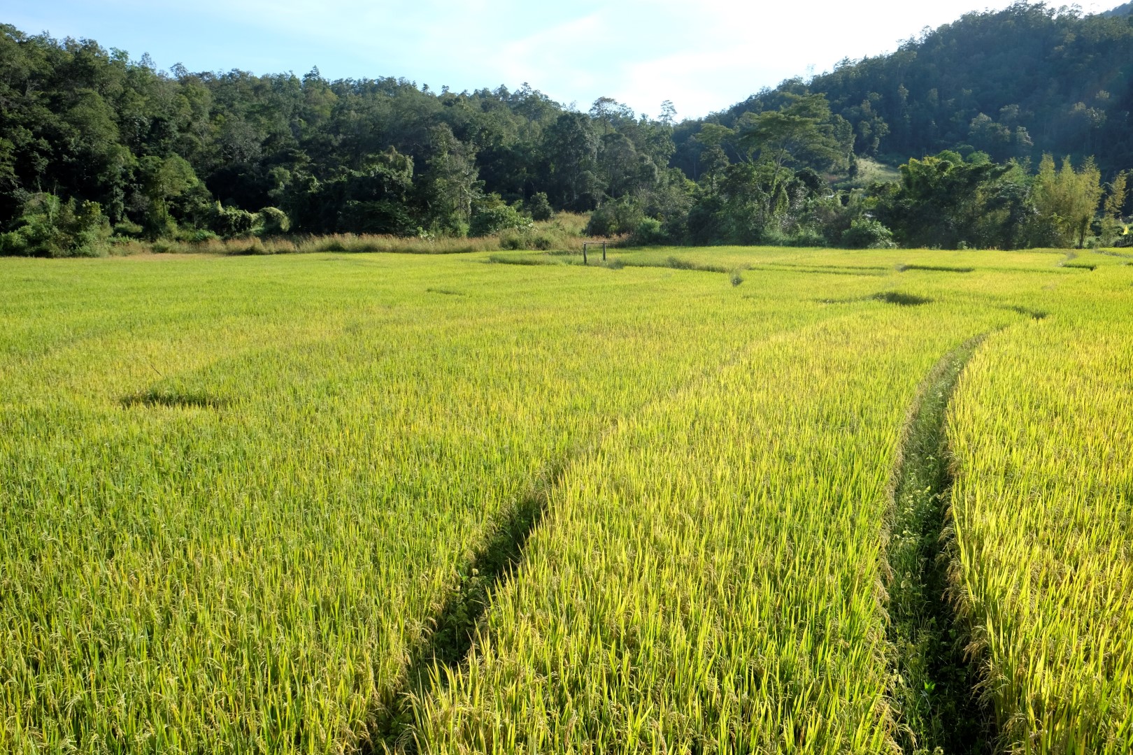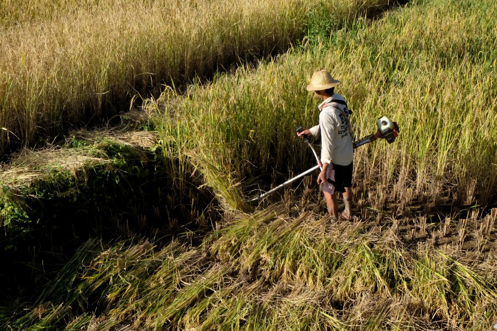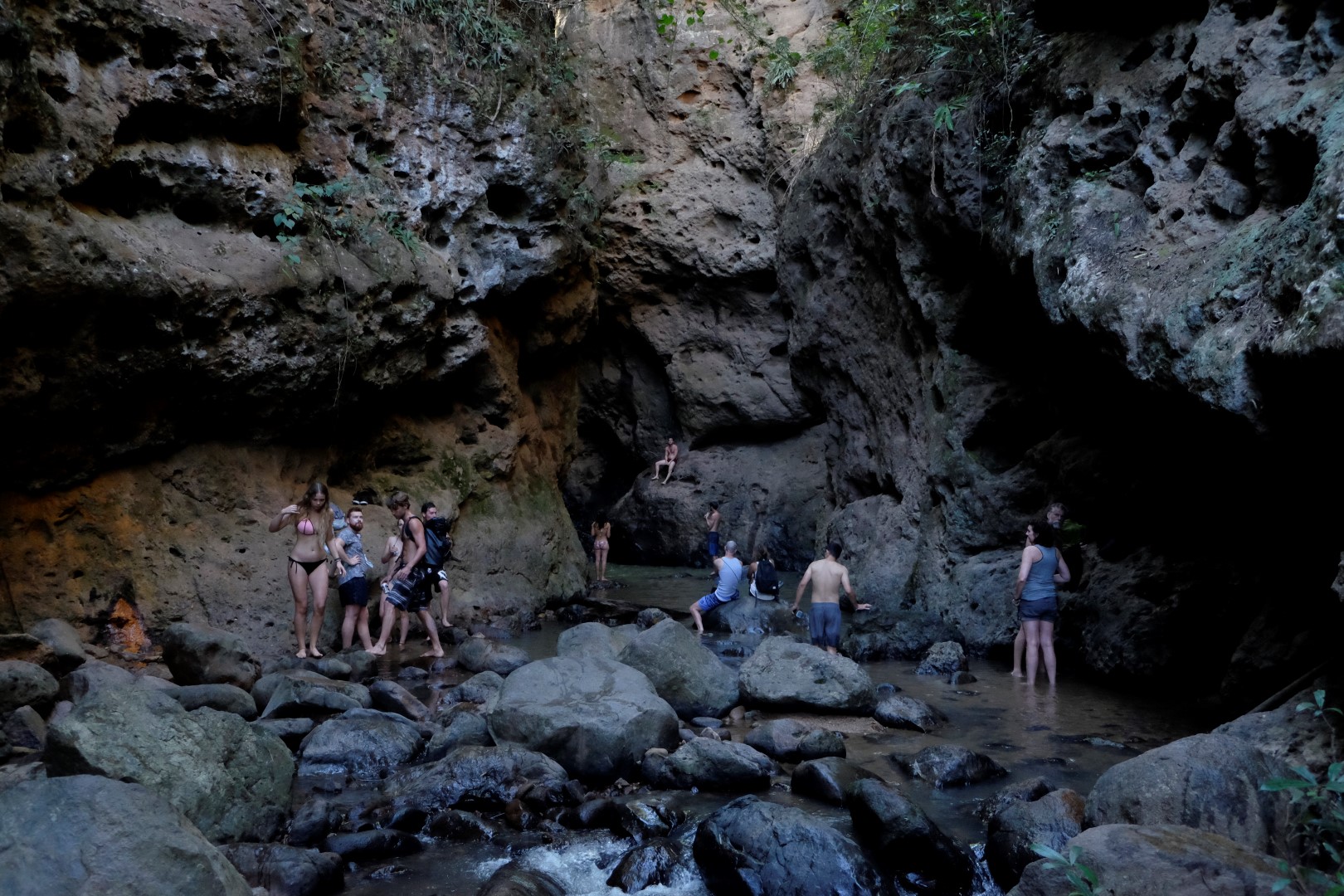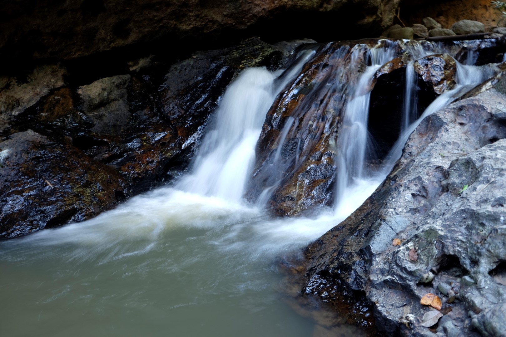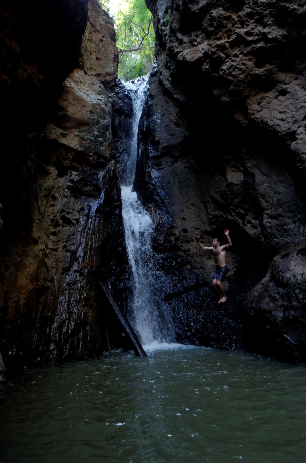 Kad nonāku pie ūdenskrituma, eju pavisam lēnām un prātīgi. Lai redzētu pašu kritumu, mazs gabaliņš jāpabrien pa ūdeni un šejienes akmeņi ir patiešām slideni. Tomēr tieku cauri sveikā, nobildēju ūdeni gāžamies un jauniešus lecam no klints. Vēl pēc maza gabaliņa var paieties pa bambusu taku un pavērot, kā vietējie novāc rīsu ražu. Kā? Ar trimeriem!