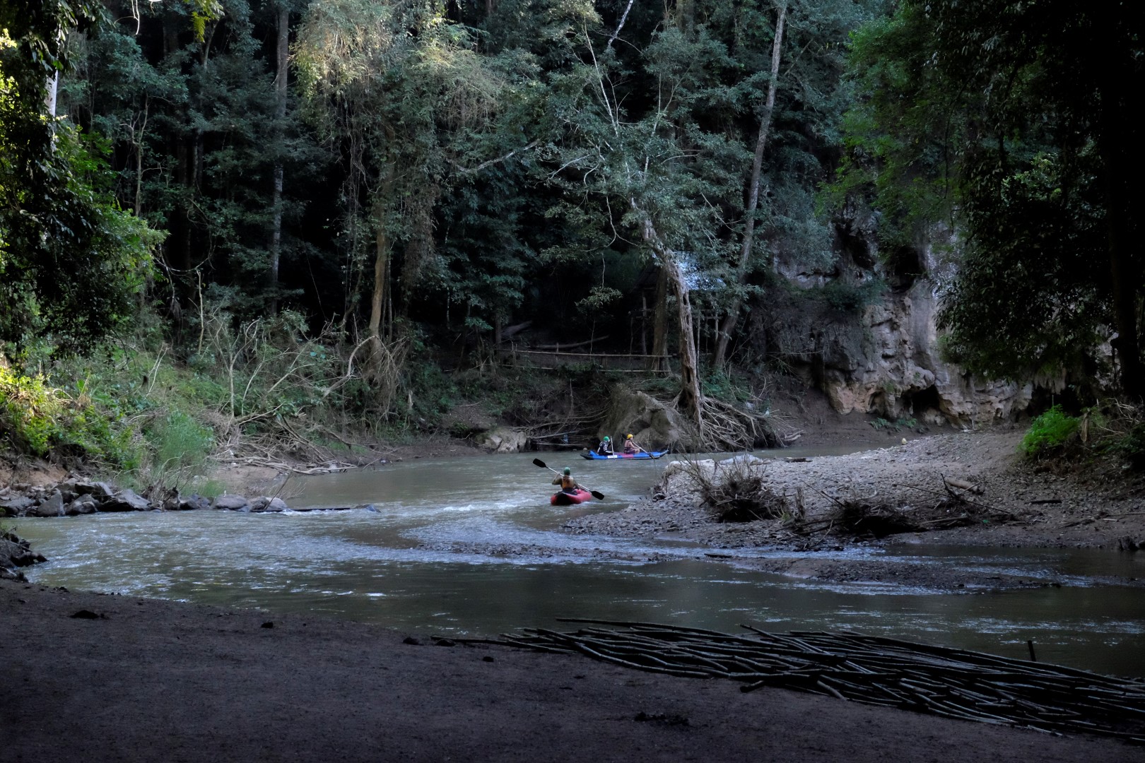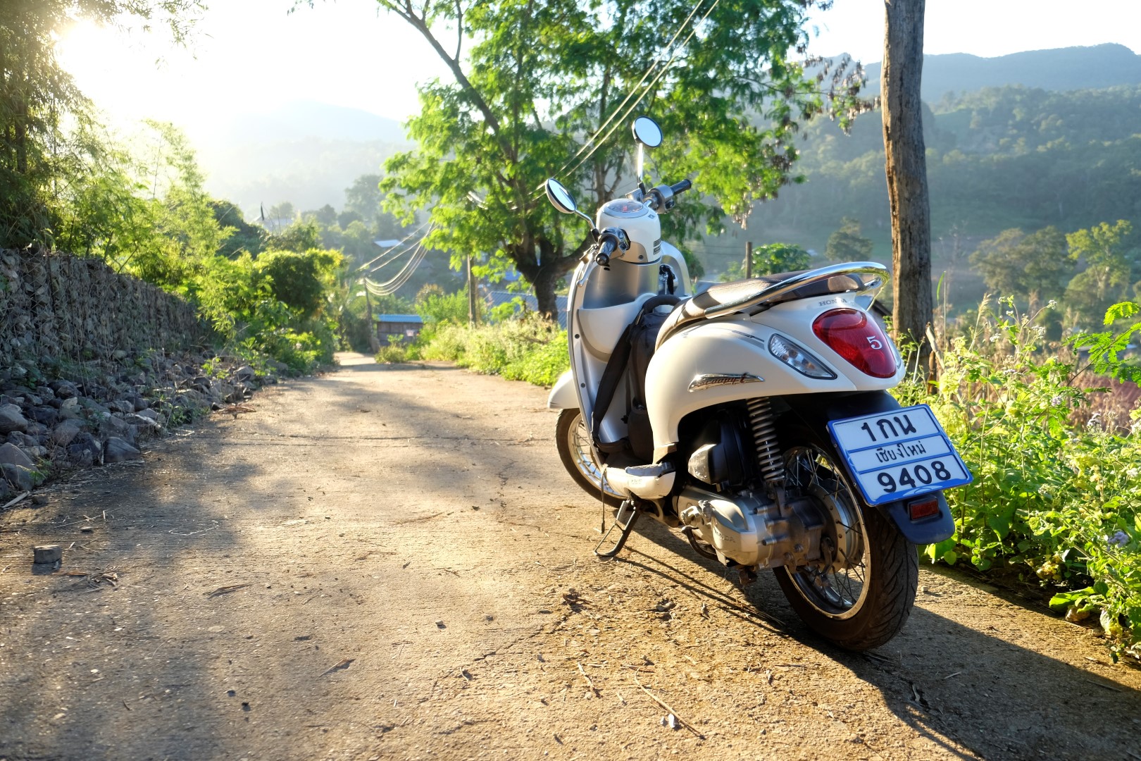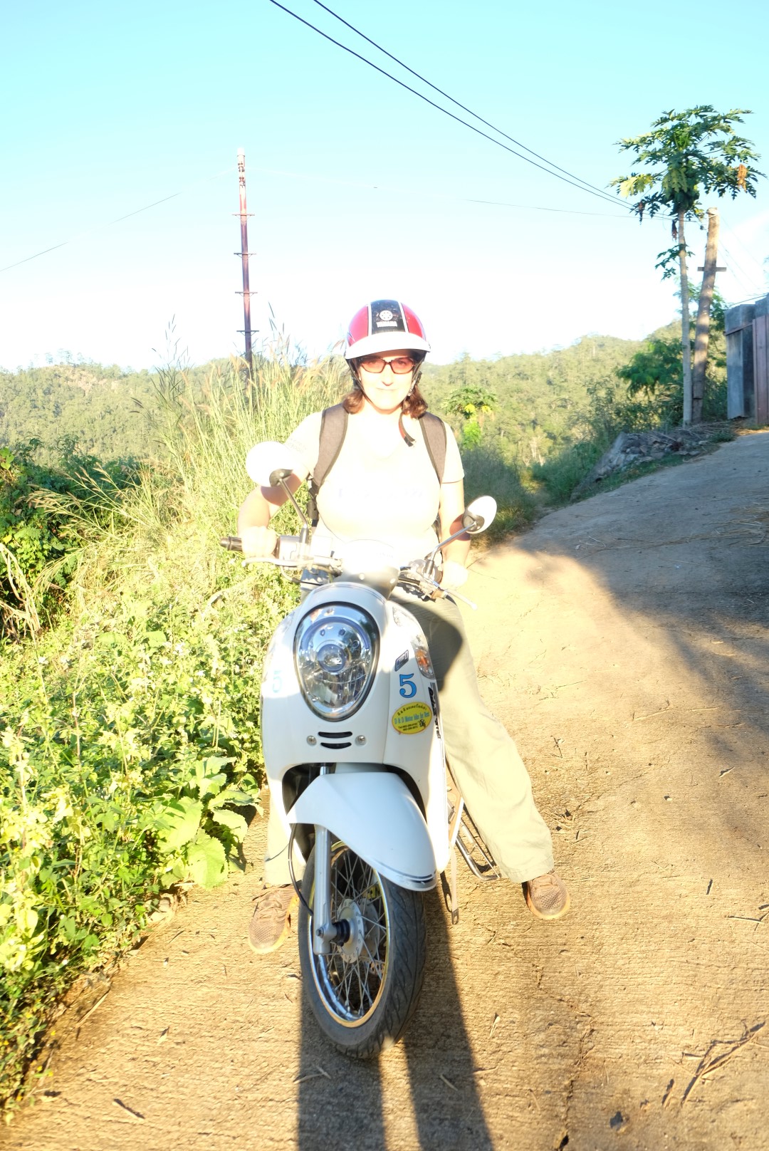 Pēc alas apskates vēl jāšķērso traki nestabils bambusa tiltiņš pār upi un drīz vien esam atpakaļ izejas punktā. Ir skaidrs, ka nekādas citas atrakcijas šodien nespīd, ceļš un ekskursija paņēmusi vairāk laika, nekā iesākumā šķita. Lecam atpakaļ zirgā un cenšamies nonākt atpakaļ Pai pa gaismu. Saulriets mūs sastop pusceļā, tam neglābjami seko krēsla. Mēs jau tā nebraucam lēni, bet tagad ir pedālis grīdā. Esmu iekrampējusies Čeranā kā koala lācis un brīžos, kad tiek paņemts kāds asāks līkums vai spidometra rādītājs pārsniedz 80 km/h, rokas sažņaudzas vēl ciešāk. “Tev ir auksti vai bail?”, Černans kādā brīdī apvaicājas. “Abi, bet vairāk bail”. Saņemu absolūti loģisku un iedrošinošu padomu: “Aiztaisi acis!”. Lai cik jocīgi nebūtu – palīdz.