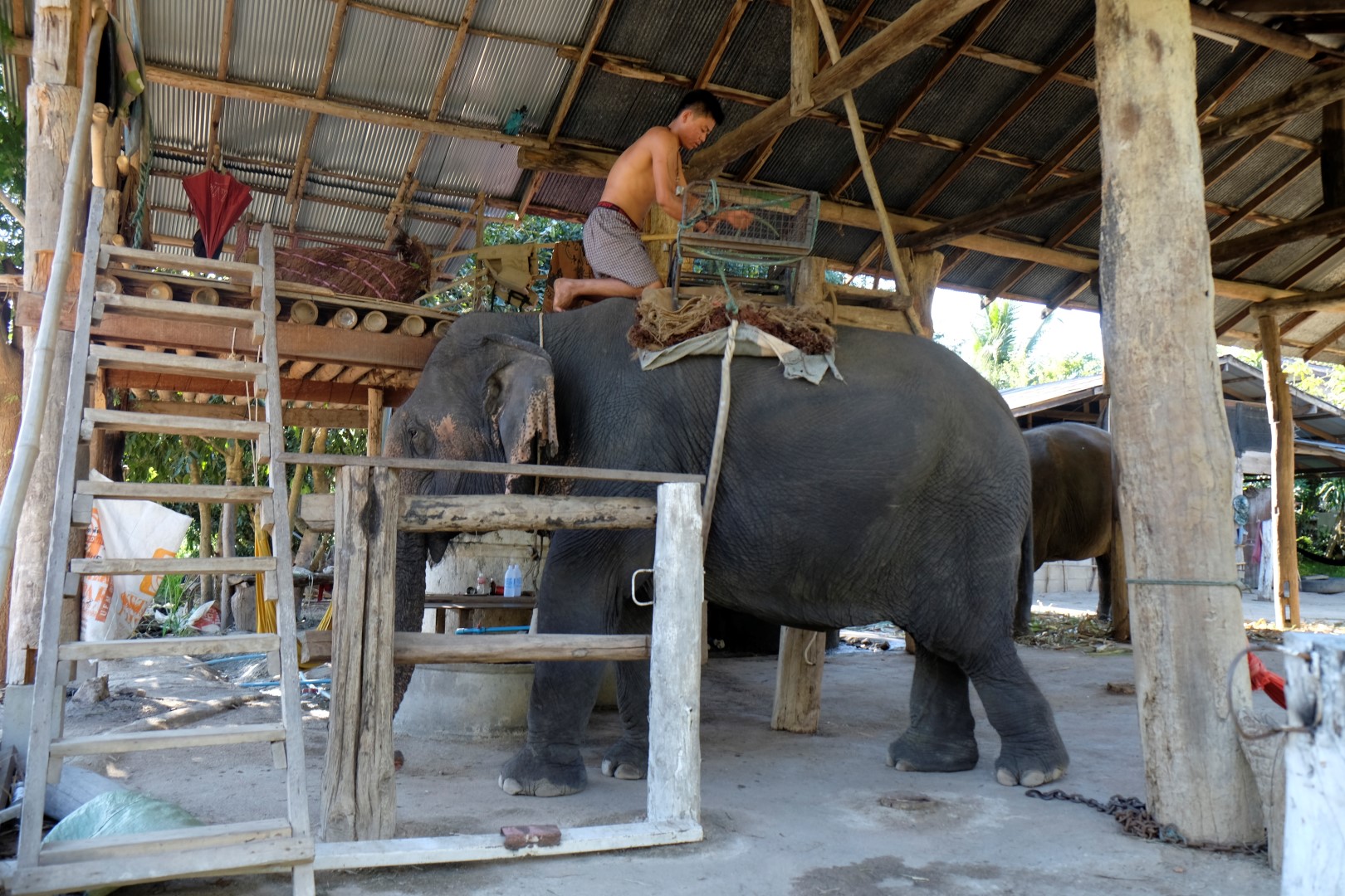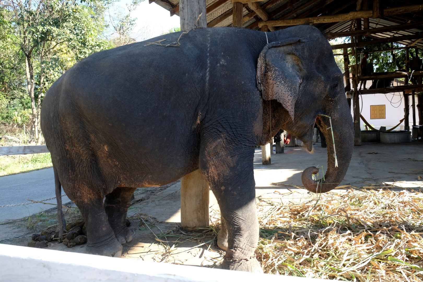 Kad dodamies atpakaļ, mums pa ceļa vidu pretī soļo zilonis. Viena no tūristu atrakcijām šeit ir vizināšanās ziloņa mugurā, ko varam novērot dzīvē. Traki jocīgi lielais dzīvnieks izskatās ierastās sadzīves vidū. Attiecībā uz šo nodarbi ir duāls viedoklis, daudzi uzskata, ka tā ir nejauka izturēšanās pret dzīvniekiem. Šādiem tūristiem tiek piedāvāta cita iespēja – parotaļāties ar ziloņiem, viņus pabarot, nomazgāt un tā joprojām. Tomēr arī tas ir relatīvi dārgs prieks. Šeit ziloņi vienkārši apskatāmi ceļmalā, mēs arī uz mirklīti piestājam un pavērojam kā šie ieturas.