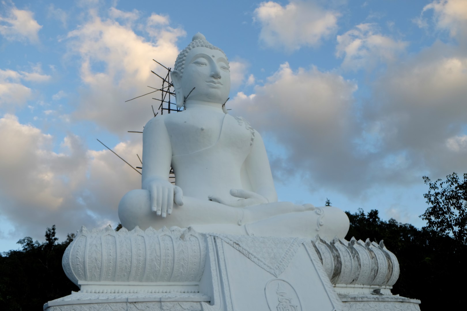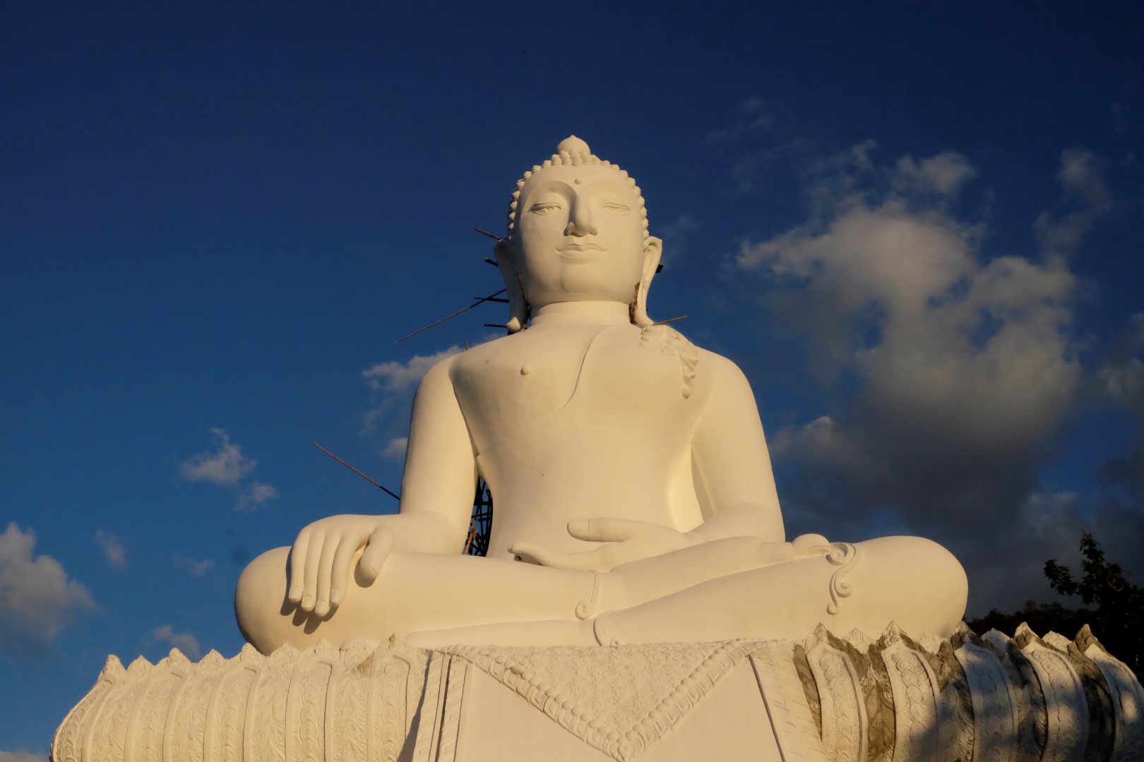Pilsētā pateicos Čeranam par vizināšanu un jauko kompāniju – viņš šodien dodas uz Čangmaju. Vēl pāris stundas ir gaišs, nolemju izmest mazu lociņu pa apkaimi un noskatīties saulrietu pie Baltā Budas, kas sēž uz viena pilsētas pakalna. Saulriets šeit ir diezgan iecienīts, pie Budas kājām savācies krietns vērotāju bariņš. Esmu tieši laikā, lai paspētu uz pēdējiem slīpās saules kadriem.