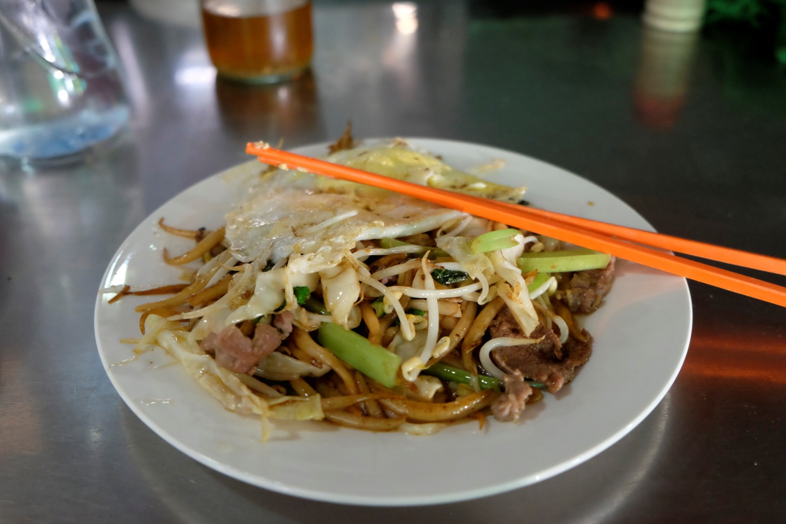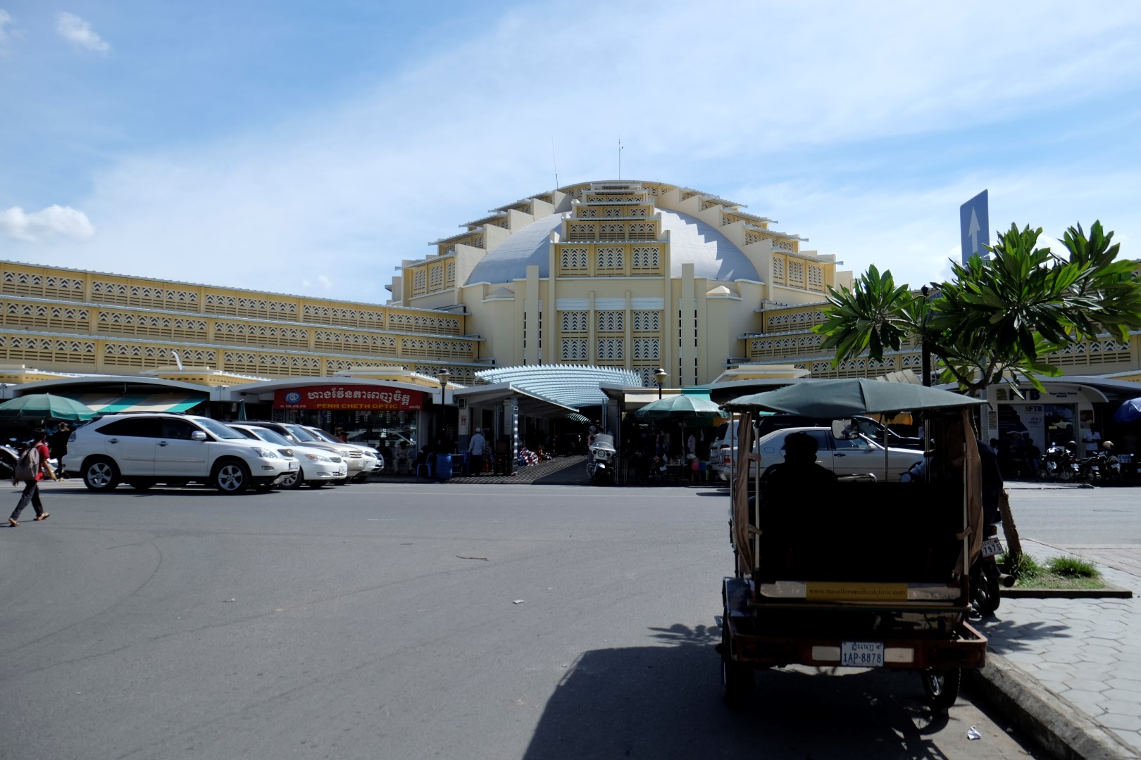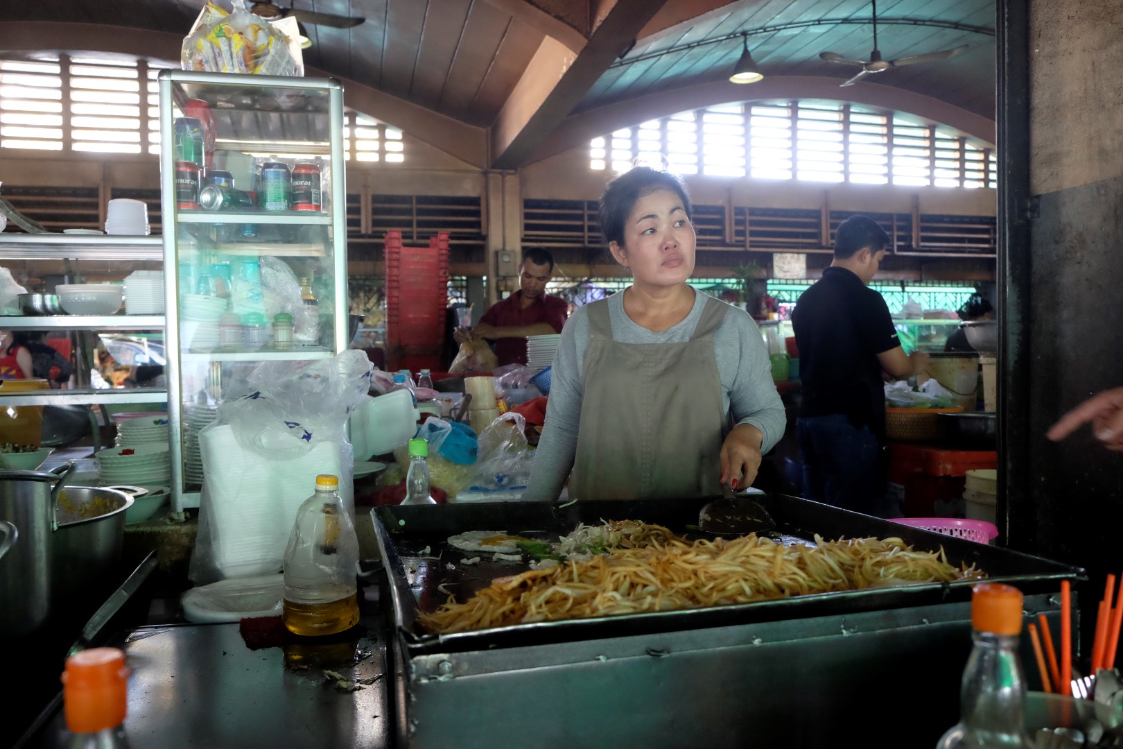 Kad tieku līdz centrālajam tirgum, ir pienācis pusdienlaiks. Lavierēju starp ielas ēstuvēm, līdz mani uzrunā ēdiens vienā no pannām. Sieviņa man pāris minūtēs sacep nūdeles ar gaļu, dārzeņiem un olu – maltīte gatava. Tas ir neticami, kādos ātrumos Āzijā no sagatavēm top ēdiens – lielākoties tas notiek mazāk nekā piecās minūtēs. Izskatās, ka ar savu vizīti esmu atvērusi klientu čakru un drīz vien pie šīs sieviņas visi galdi ir pilni – viņi tikko spēj cept. Vēl nopērku pāris augļus launagam – esmu nolēmusi Kambodžā “vest” veselīgu dzīvesveidu, kas iekļauj sevī arī mazliet augļu katru dienu. Šodienas programmā – pūkaugļi un džekfruits.
