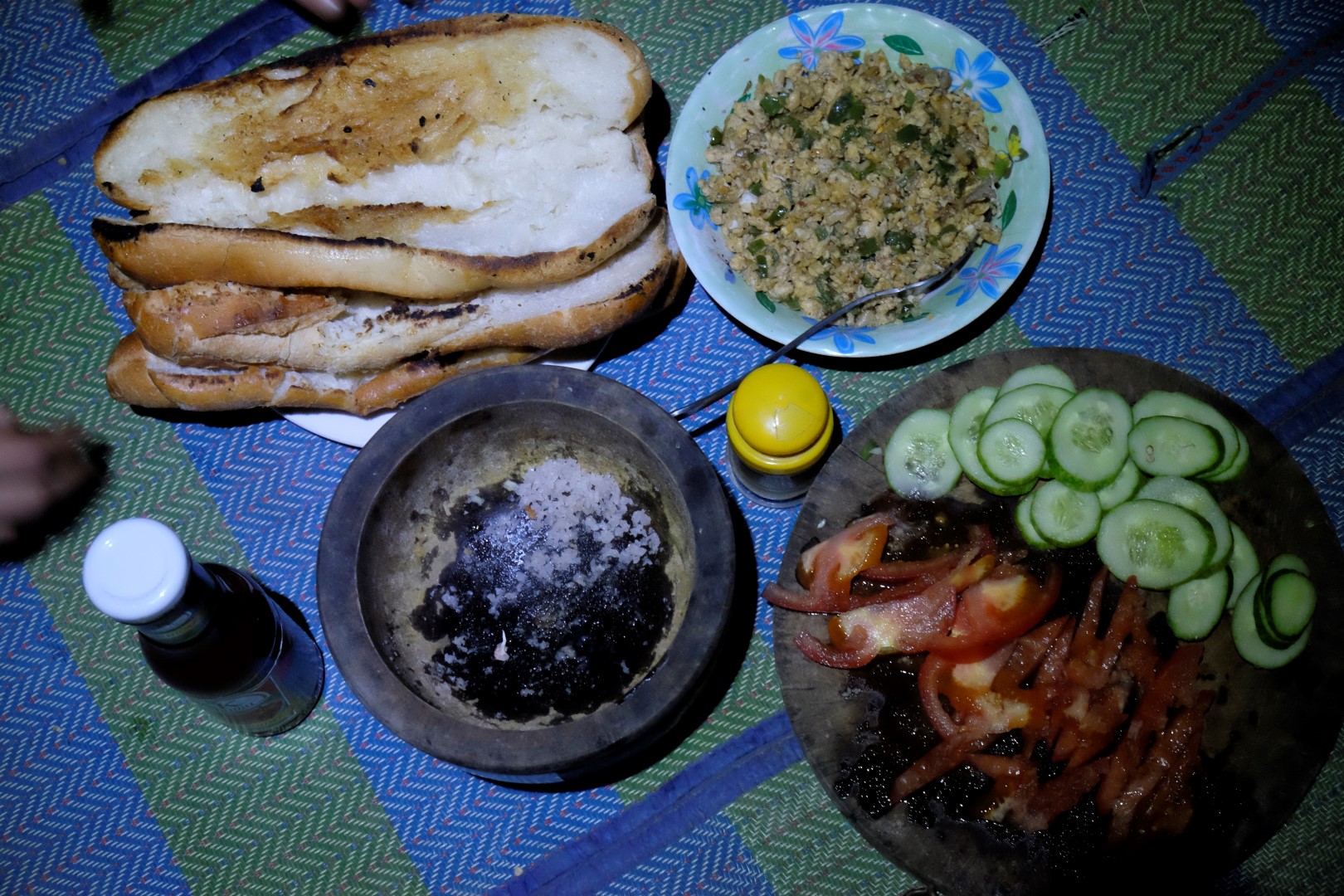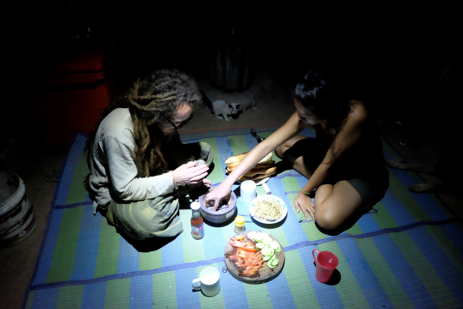 Esam nokavējuši diennakts gaišo laiku, lai pagatavotu ko ēdamu, tāpēc šovakar mums ir vakariņas tumsā. Labi, ne gluži. Lapenē ir viena vāra spuldzīte un pie gāzes plīts deg svece. Deimians ierosina, ka vakariņās jānoēd no pilsētas atvestās bagetes, jo līdz rītdienai tās var neizdzīvot. Labi, jaunieši sacep sēnes ar olu un sīpoliem, ko ķellēt iekšā maizē, sagriež dārzeņus, apgrauzdē bagetes eļļā un esam gatavi mieloties. Pa visu tumsu redzu, ka mana maize tomēr kustas. Iesākumā šķiet, ka tur ir vien pāris mazas skudriņas, bet, ieskatoties ciešāk, tā faktiski ir skudru maize. Kādu brīdi cenšos izlasīt vairumu ārā, bet tas ir bezcerīgi. Ko darīt, ēst ta gribas. Uzķellēju skudrām pa virsu sautējumu, izdekorēju ar dārzeņiem un loku iekšā proteīnmaizi.