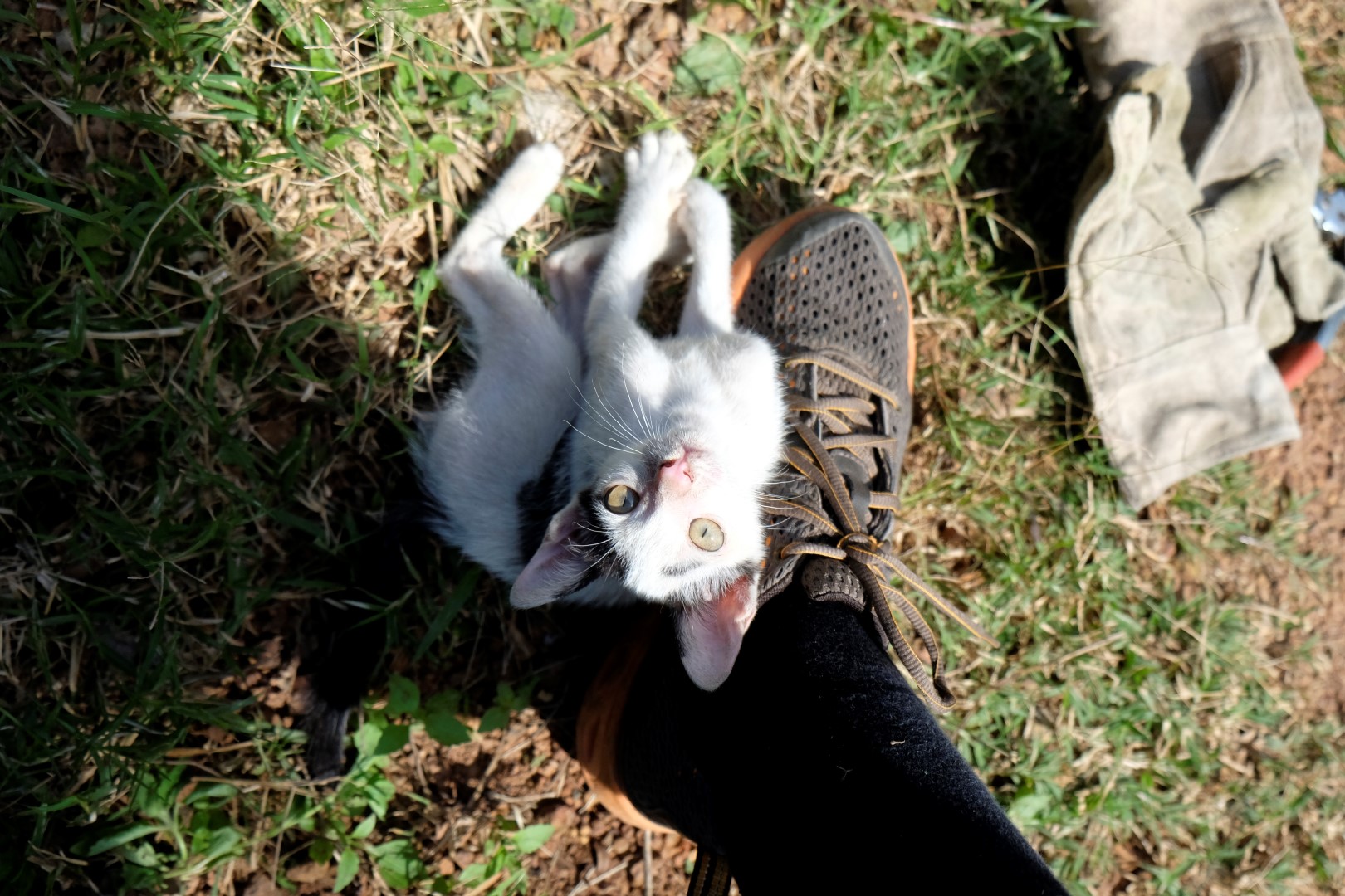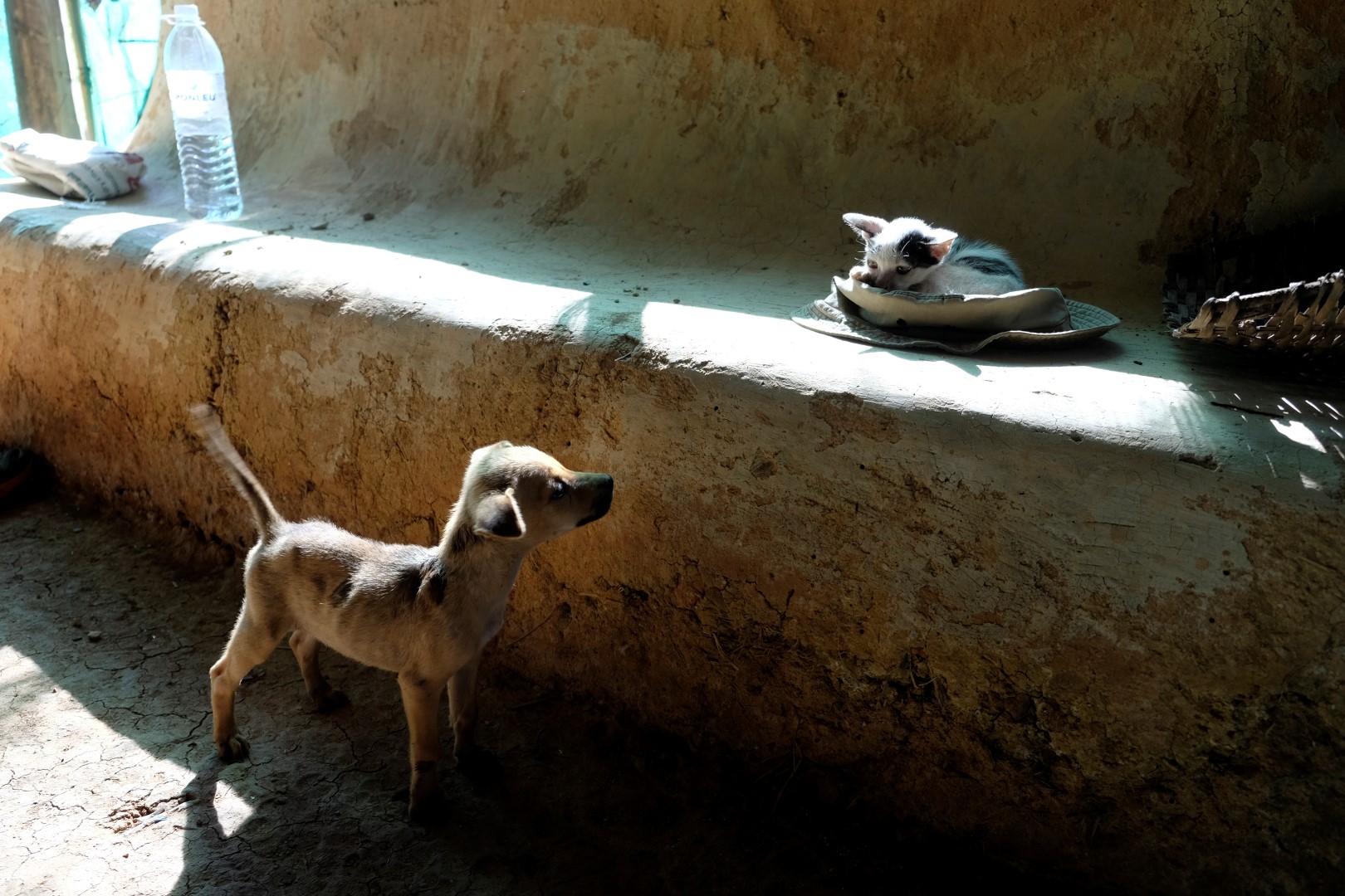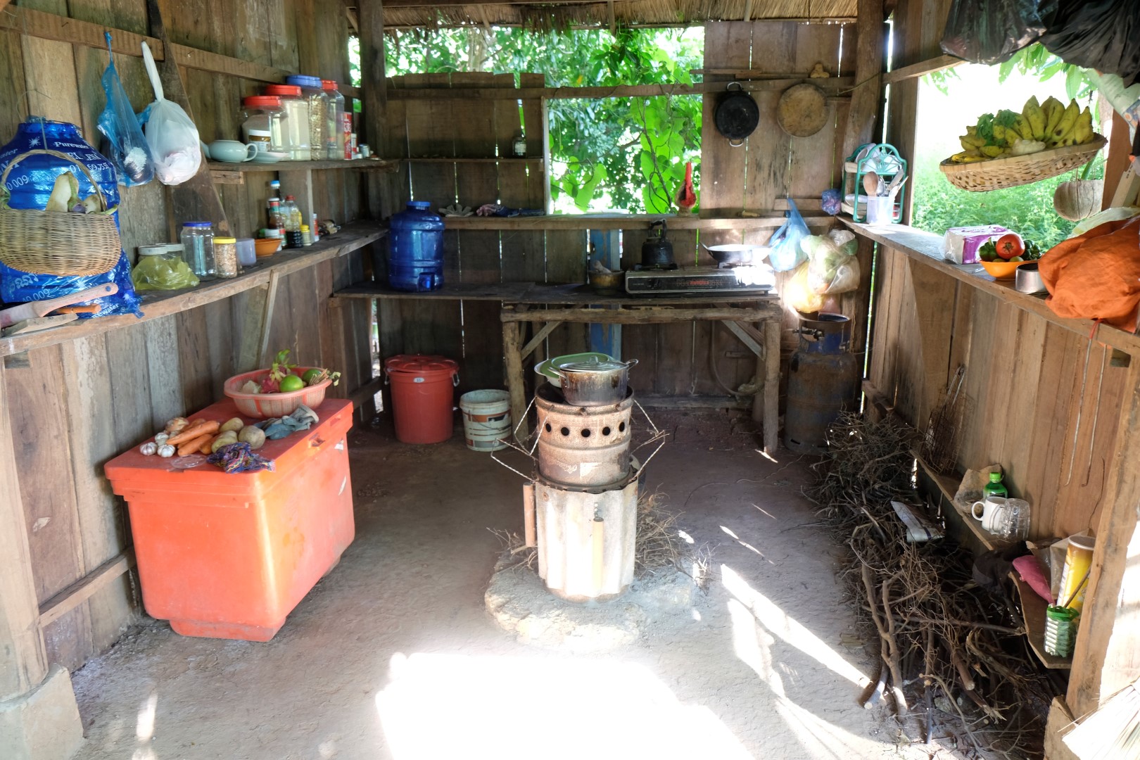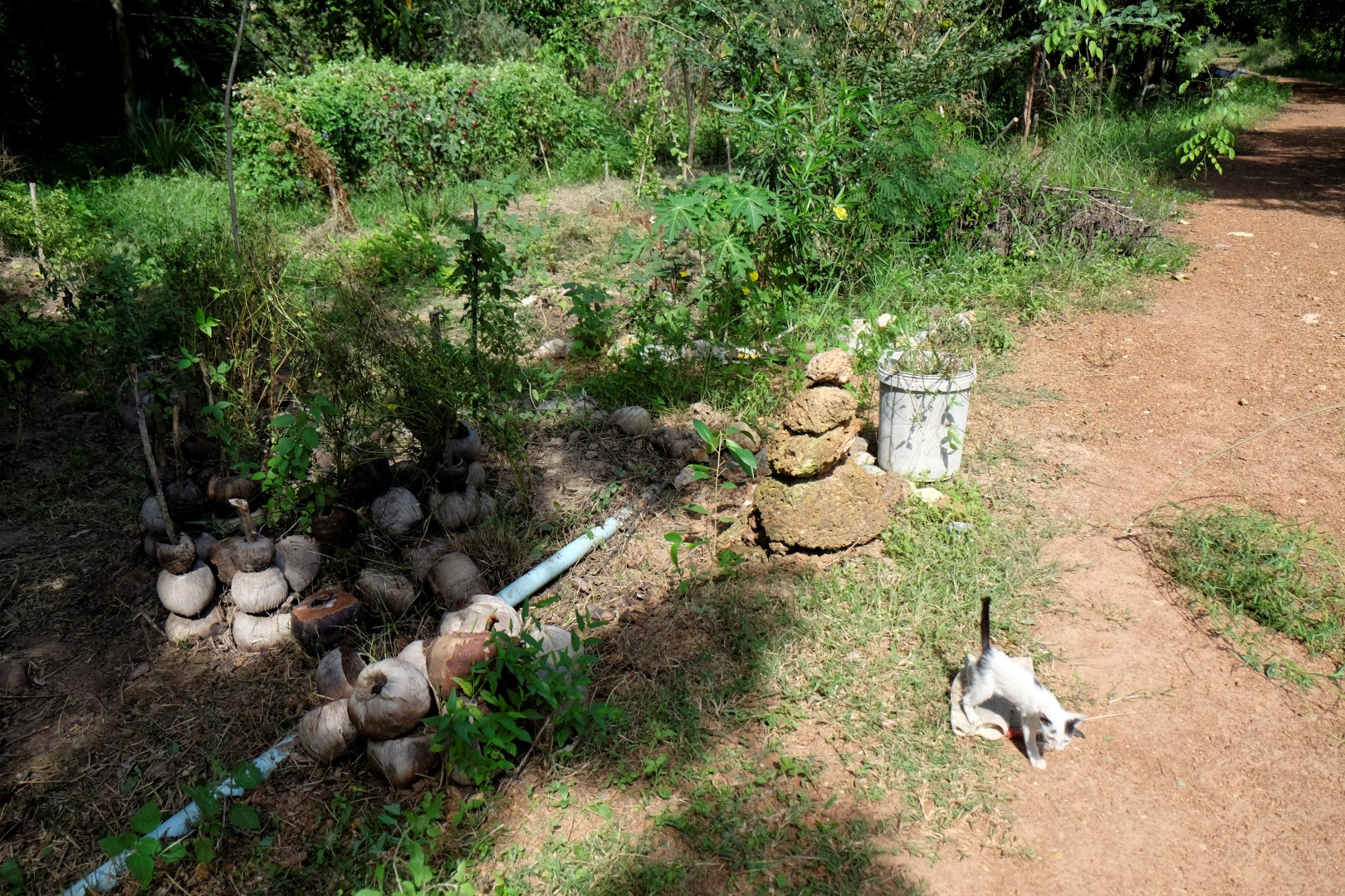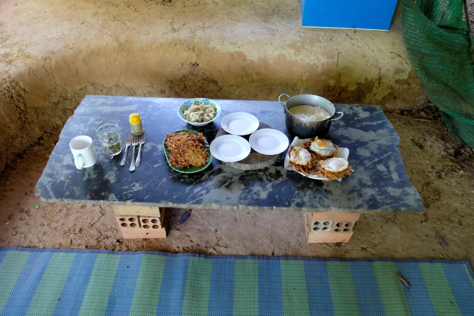 Korī uzņemas šefpavāra lomu, es palīdzu visu sagatavot. Šodien pusdienās tiek ceptas tādas kā milzīgas kartupeļu pankūkas no sīkos salmiņos sagrieztiem kartupeļiem, sīpoliem, olas un miltiem. Novārām rīsus, sacepam kāpostus ar sēnēm un katram pa olai. Pusdienas sanāk labu labās. Arī šejienes zvēri – divi pieauguši suņi, viens kucēns un viens kaķēns – tā vien dzīvojas ap mūsu lapeni. Noteikti visi ir klāt, kad tiek gatavots ēdiens. Nekad neesmu redzējusi, ka kaķi un suņi ar tādu entuziasmu ēstu rīsus. Ļoti labprāt uzcienātu šos ar ko gardāku, bet mums nekā cita, izņemot dārzeņus, nav. Apsveru iespēju palūgt Ako, lai viņš nākamajā reizē atved kādu suņu-kaķu barību, es iedošu naudu. No otras puses – viņi pie tās pieradīs, kas būs pēc tam. Nezinu, kā pareizāk rīkoties. Īpašas simpātijas man ir pret mazo kaulu kambari kaķa veidolā – sīkā radība man asistē visu dienu – ravējot, rakstot, gatavojot.