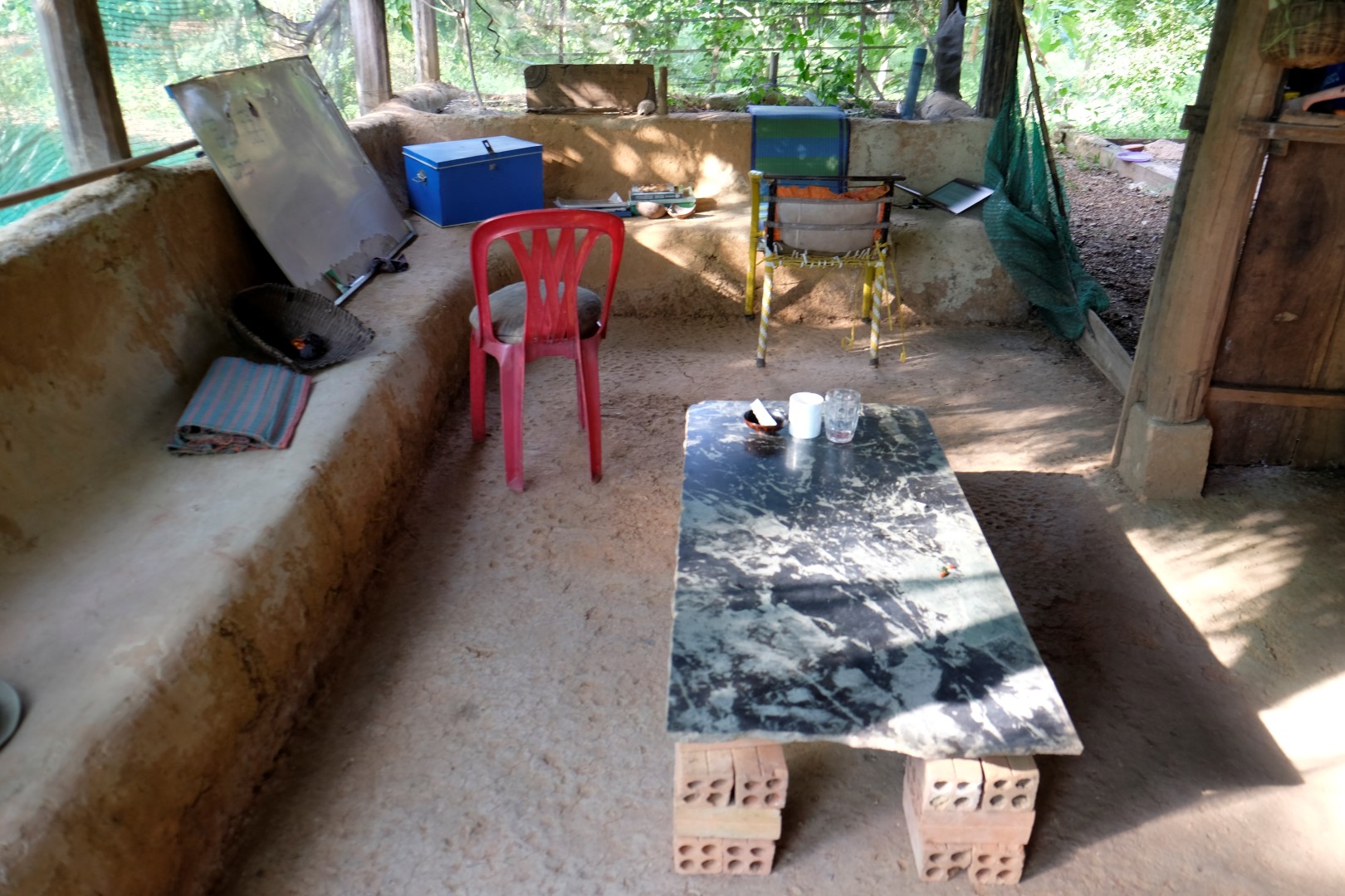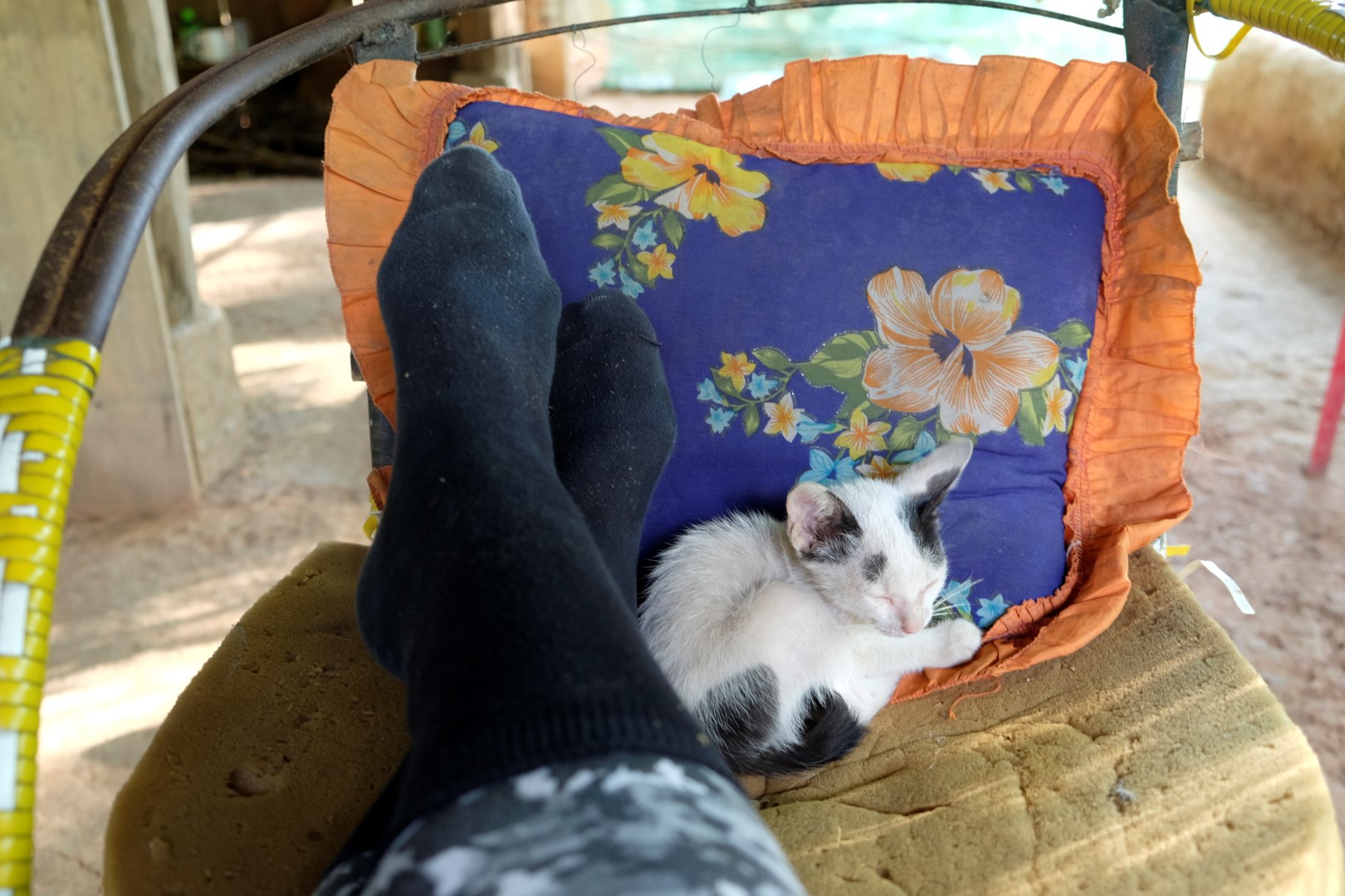 Pēc pusdienām ir atpūtas laiks. Es izmazgāju drēbes, kas faktiski uzreiz arī izžūst. Tad mēs ar Korī veicam labiekārtošanas darbus lapenē – izmēžam grīdu un pārvietojam galdu. Es dzeru jau kādu piekto tējas bunduli – šeit aug citronzāle, hibiski, visādas lapas un ziedi, ko likt tējā, esam nopirkuši laimus un ingveru. Šobrīd, piemēram, iet vaļā šitāds skaistums.