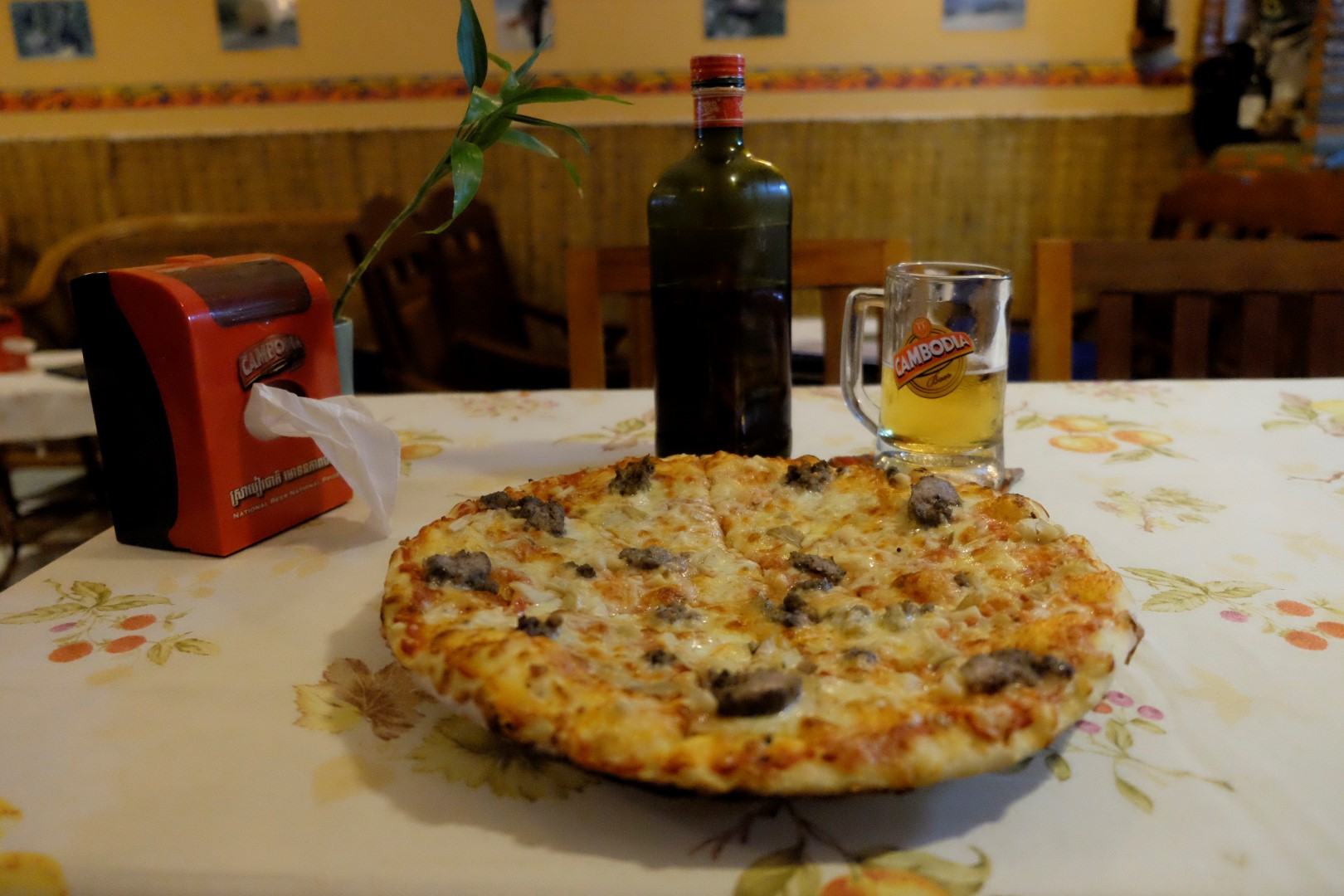 Kopš Elīze iekomentēja par Kampot centrā pieejamo itāļu ēdienu, man nedod mieru doma par picu. Karoju ar to visu dienu, bet nesekmīgi. Kad pēc izbrauciena ar kuģīti klīstu pa pilsētu, kājas mani aptur kādas itāļu ēstuves priekšā. Pie tās ārā sēž meitene. Vaicāju, vai viņa šeit ir ieturējusies, bet meitene smiedamās atbild, ka šis ir viņas restorāns. Pati domā, ka labākais pilsētā. Labi, lai iet tā pica. Galu galā – jānosvin atgriešanās civilizācijā. Pica tiešām ir pasakaini garšīga un liela arī. Iesākumā domāju, ka tikšu galā labi ja ar pusi, bet kaut kā tomēr apēdas visa. “Nu, kā bija”, itāliete vēlas zināt. Apmierināti māju ar galvu un atzīstu, ka kaut ko tik lielisku sen nebiju ēdusi. Šeit arī īpašniece ar savu šefpavāri.