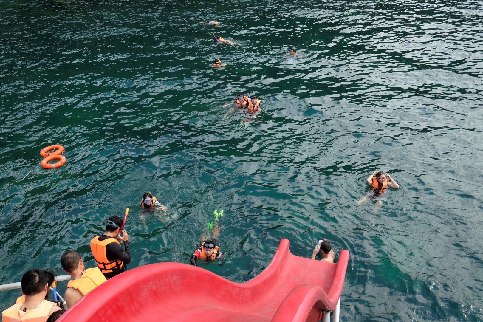 Neesam vēl paspējuši aizmirst brokastis, kad tiek servētas pusdienas. Ēdiens ir diezgan daudzveidīgs un garšīgs, attiecīgi izbrauciena cena – 20 USD – vairs nešķiet tik liela. Neesam pabeiguši ieturēties, kad ir klāt nākamā pieturvieta – peldēšanās un snorkelēšanas pauze pie nelielas saliņas krastiem. Tā kā kapteinis saka, ka zemūdens pasaule šeit diez ko iespaidīga nav, izlemju nelīst ūdenī ar pilno vēderu. Goša gan ielien, bet atgriezusies apstiprina šo informāciju – pati pelde esot bijusi tā neko, bet zem ūdens skats esot visai bēdīgs.