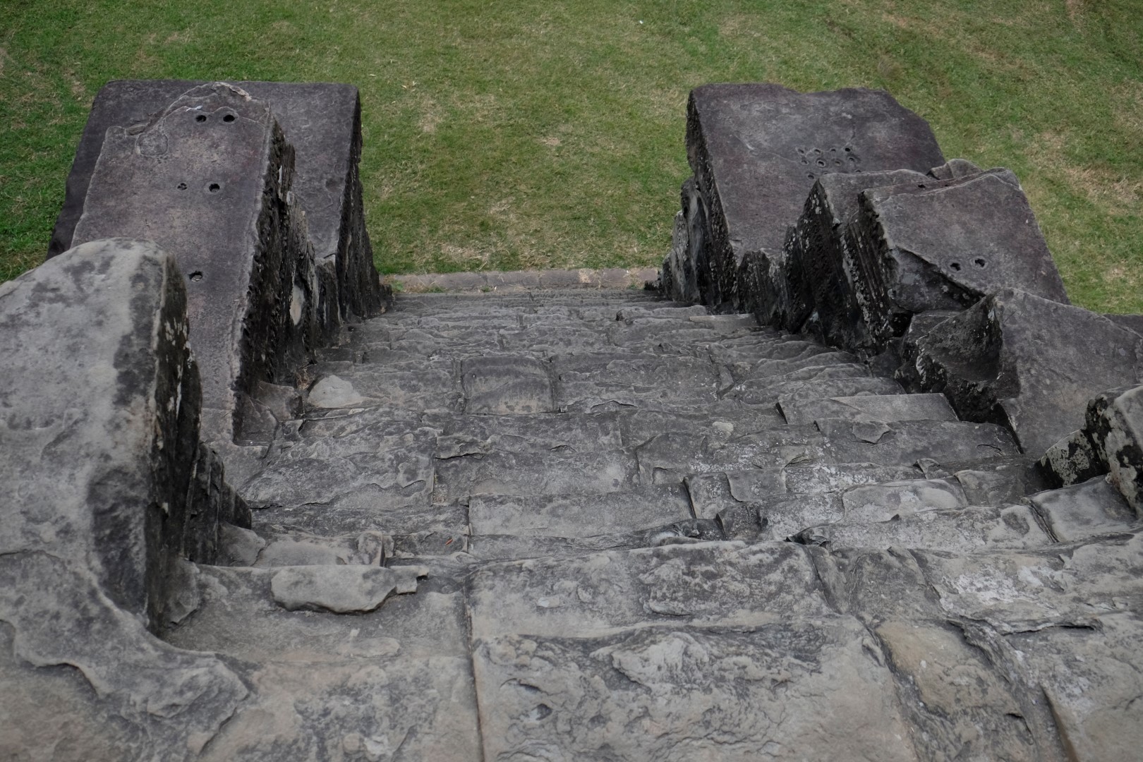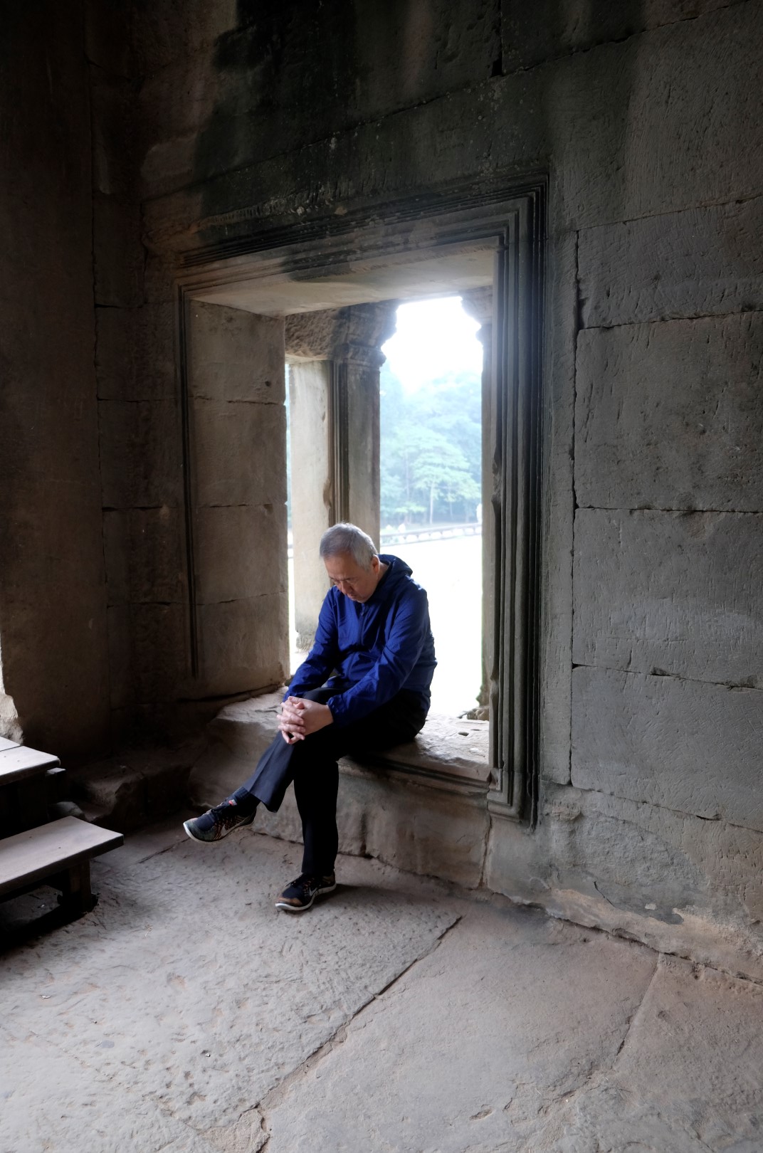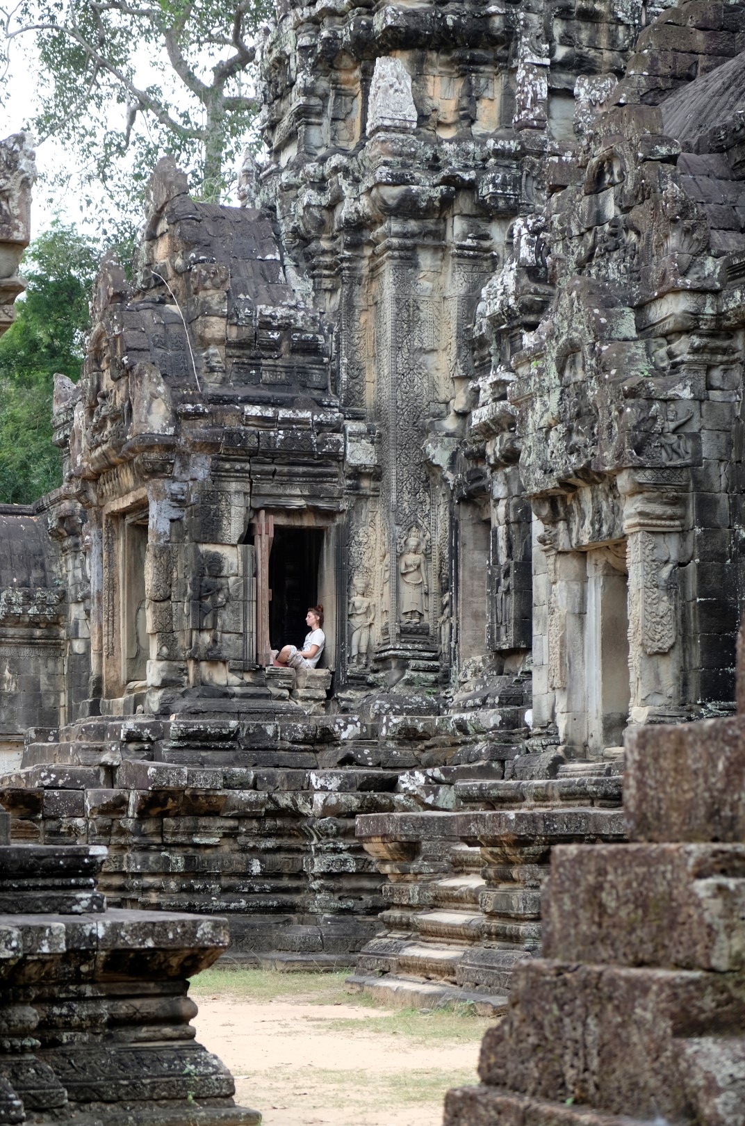 Izeju no tempļa, atguļos uz akmens kluča un kūkoju. Kad esmu to izveikusi krietnu brīdi, sāk šķist, ka kaut kas nav īsti lāgā, pārāk ilgi kundziņš nerādās. Aizeju pavisam redzamā vietā, bet Szabolcu joprojām nekur nemana. Hmm, kā būtu gudrāk rīkoties? Szabolcam nav vietējā sim karte, attiecīgi sazināties modernā veidā nevaram. Nu, vienīgā loģiskā vieta, kur viņš varētu iet, ja mēs būtu pazaudējušies, ir motocikls. Drošības pēc atstāju redzamā vietā zīmīti ar ceļabiedra vārdu un to, ka būšu pie motocikla, un sāku soļot uz izejas pusi. Ha – sēž gailis pie sānu ieejas. Izrādās, šis sapratis, ka jāsatiekas pie ieejas, pa kuru ienācām templī. Bijis arī pie “pareizās” ieejas, bet nav mani redzējis. Bet domu gājiens kopumā bijis līdzīgs – vēl piecas minūtes un arī Szabolcs būtu gājis uz motocikla pusi.