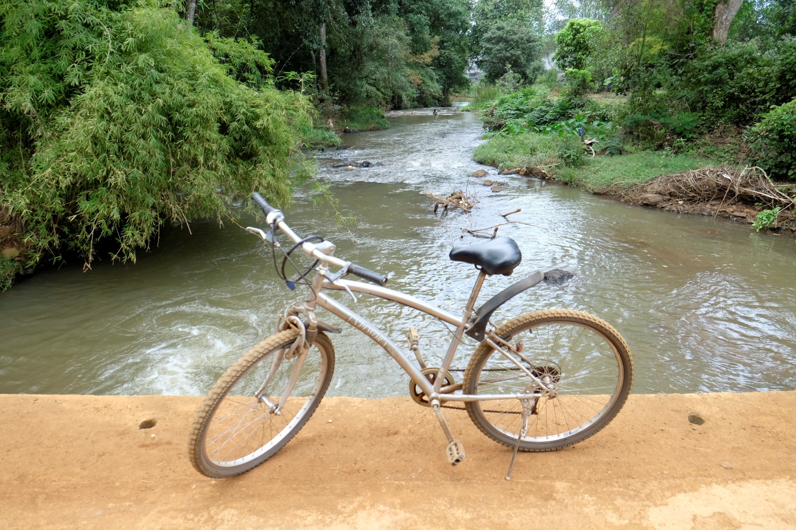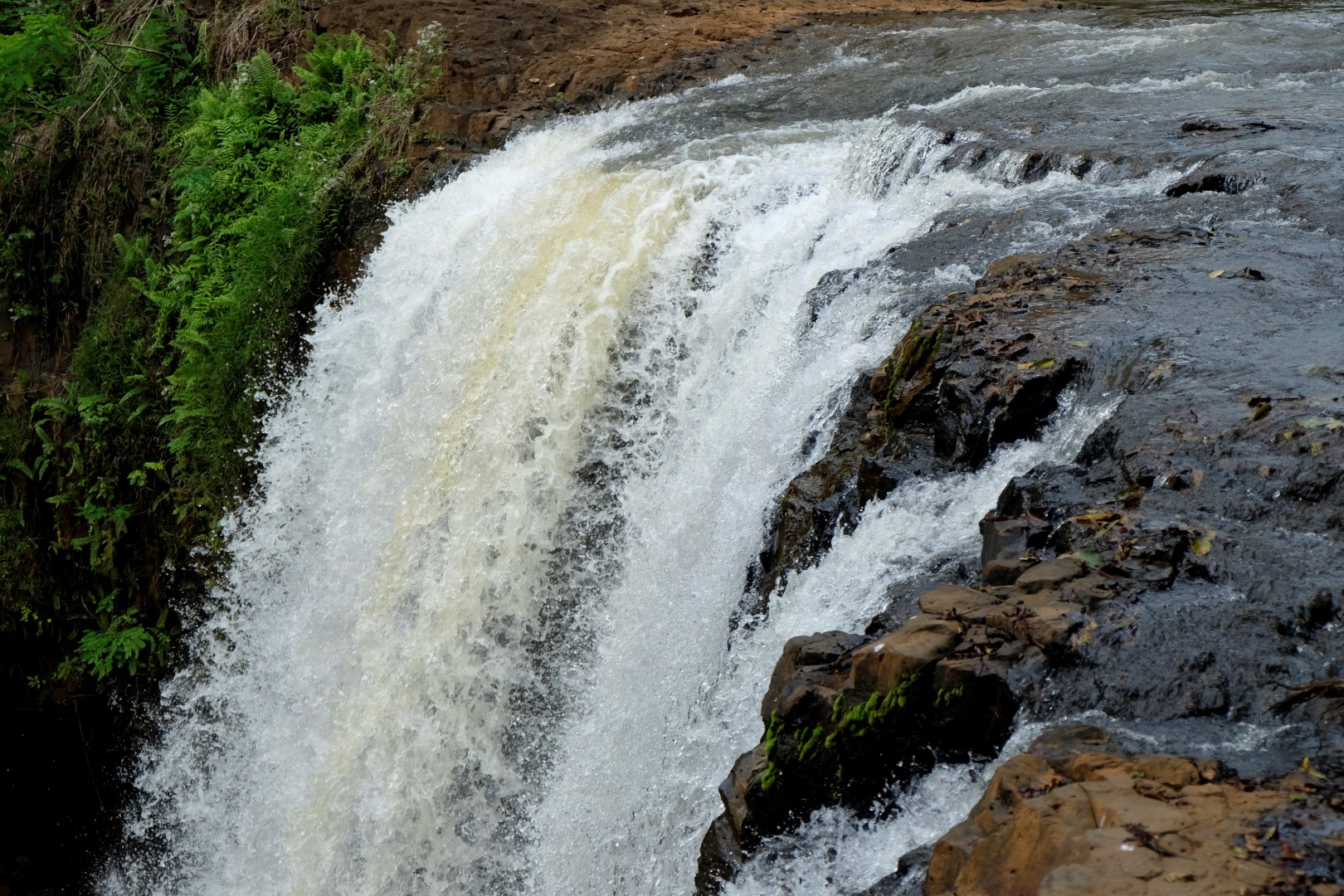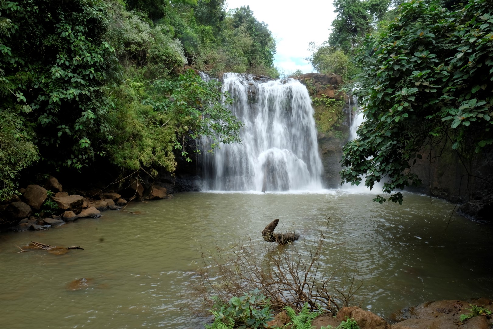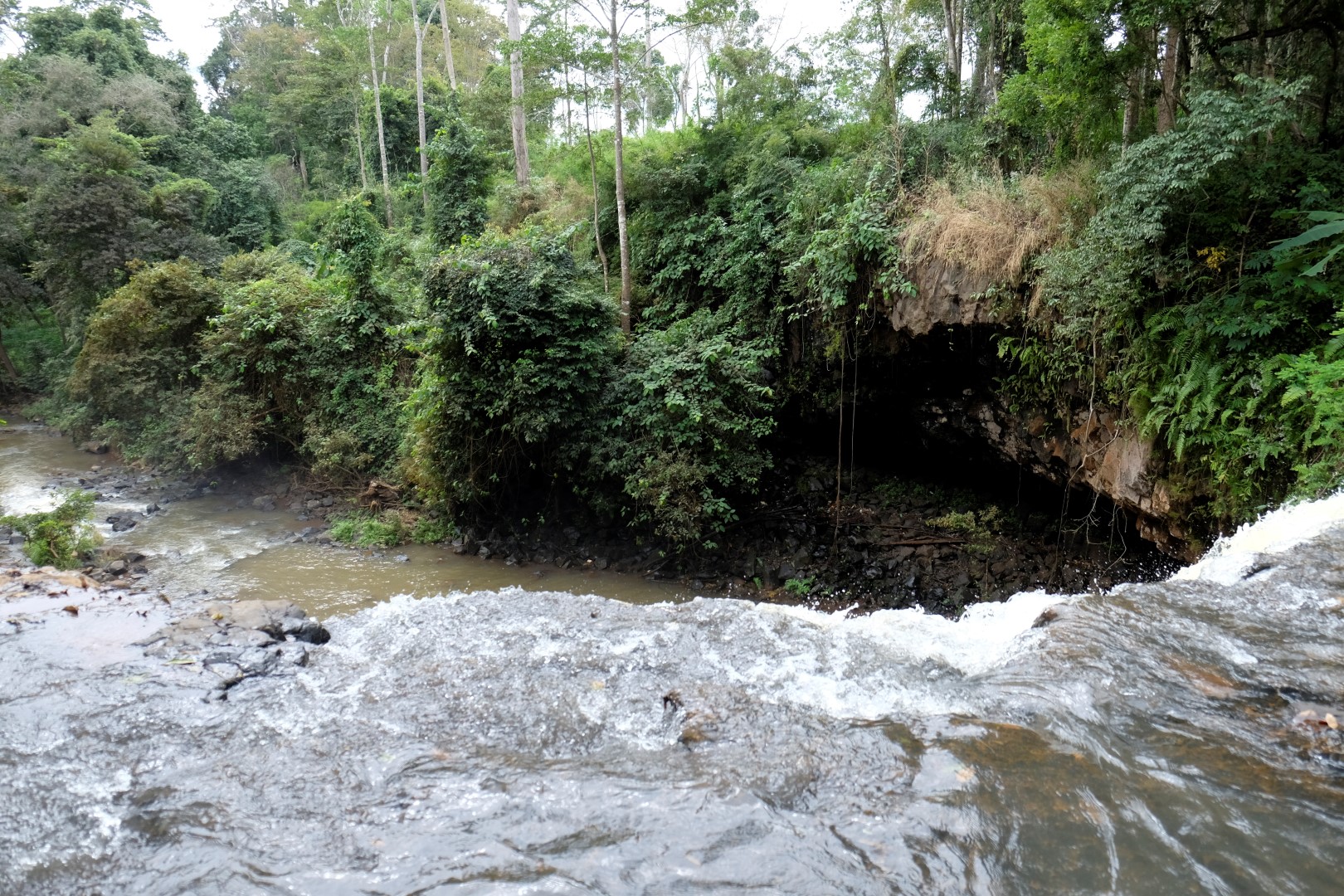 Paēdusi sēžos uz riteņa un laižu skatīties ūdenskritumus. Vienā no Agneses komentāriem paustajam brīdinājumam ir pamats – apkārt virmo tādi putekļu mākoņi, jo īpaši pēc smagajiem – nav ko elpot. Kad tieku prom no lielā ceļa, kļūst labāk. Ceļa virsma ir līdzīga vakardien redzētajai – grambas un gravas no vienas vietas. Ūdenskritumi nav nez ko satriecoši, bet gana glīti. Esmu viena pati pie tiem, varu mierīgi apskatīt krītošo ūdeni no visām pusēm. Pie otrā ūdenskrituma, zinot, ka mani sagaida atpakaļceļš pret kalnu, paņemu garāku atpūtas pauzi ar turpat iegādātu pomelo. Ceru, ka šis greipfrūta radinieks arī ko labu nodarīs imūnsistēmai. Našķējos krietnu pusstundu, bet tā arī neviens cits objekta apskatītājs neparādās.