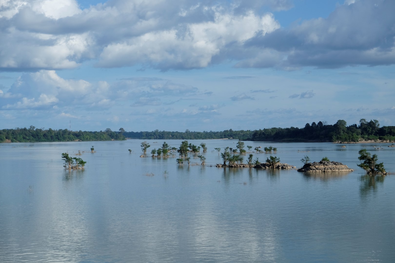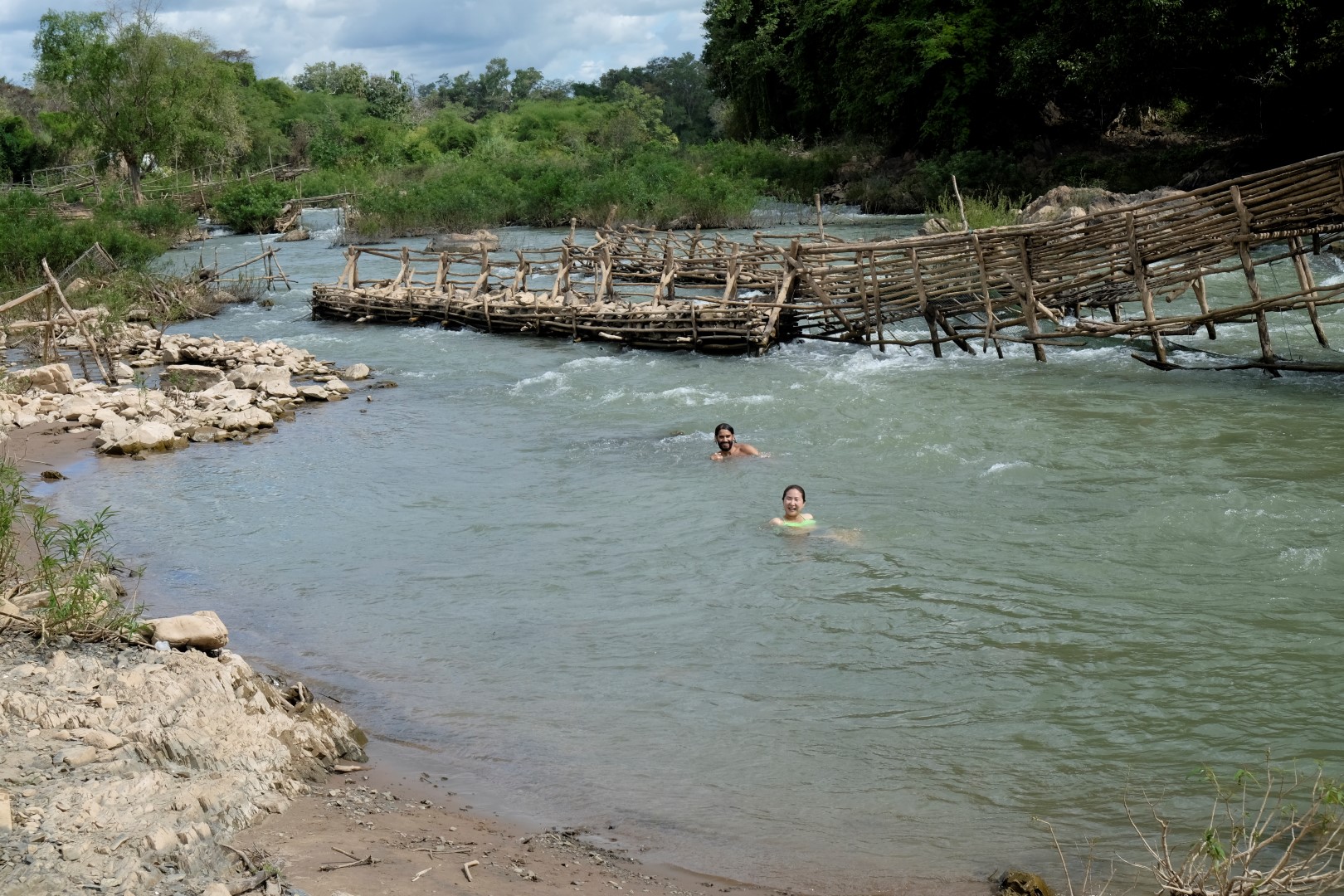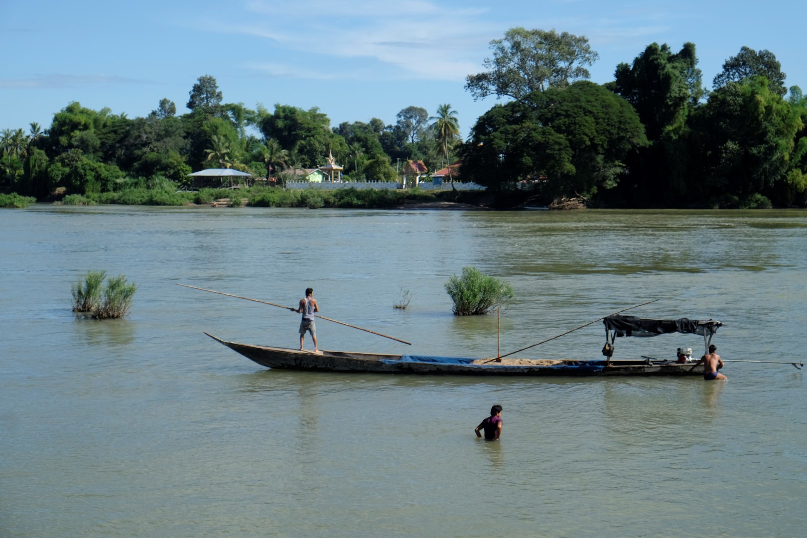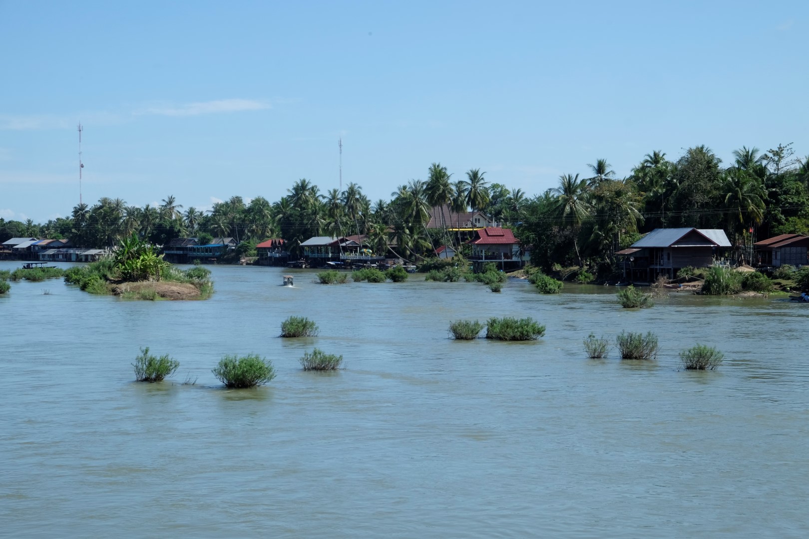 Mūsu mērķis ir apiet apkārt šai salai, kas ir lielāka nekā mūsējā. Ir karsts pēc suņa, tāpēc katra iespēja paieties vai pasēdēt ēnā ir svētki. Minūtes desmit veldzējamies zem milzu koka vietējā kapsētā, tad saņemamies svelmei. Tomēr jau drīz varam baudīt pavisam īstu veldzi – atraduši pieejas vietu, kur iebrist Mekongā, metamies straumē. Par īstu peldi to grūti nosaukt, jo upe ir sekla, strauja un akmeņaina, tomēr ir tik patīkami uz brīdi iemērkt miesas nosacīti vēsā ūdenī.